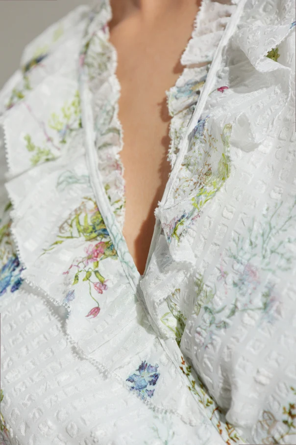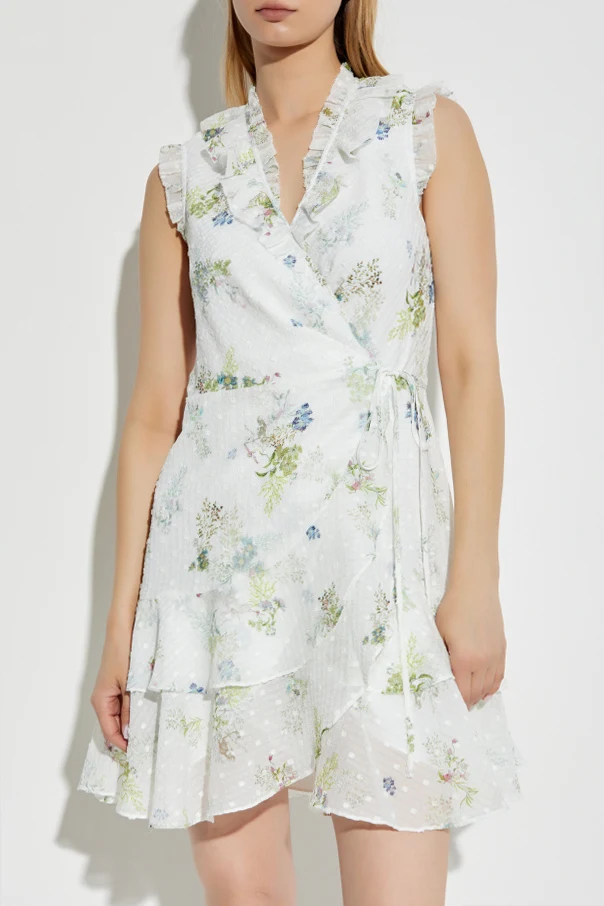 Der Stoff mit ausgeprägter Jacquard-Struktur schimmert dezent im Licht, während das edle, florale Muster in Pastellfarben durch Frische und einzigartigen Charakter begeistert. Das Kleid wurde ärmellos gestaltet, mit einer dekorativen Rüsche am Ausschnitt sowie an den Schultern, und der bequeme Wickelverschluss ermöglicht eine perfekte Taillenanpassung.