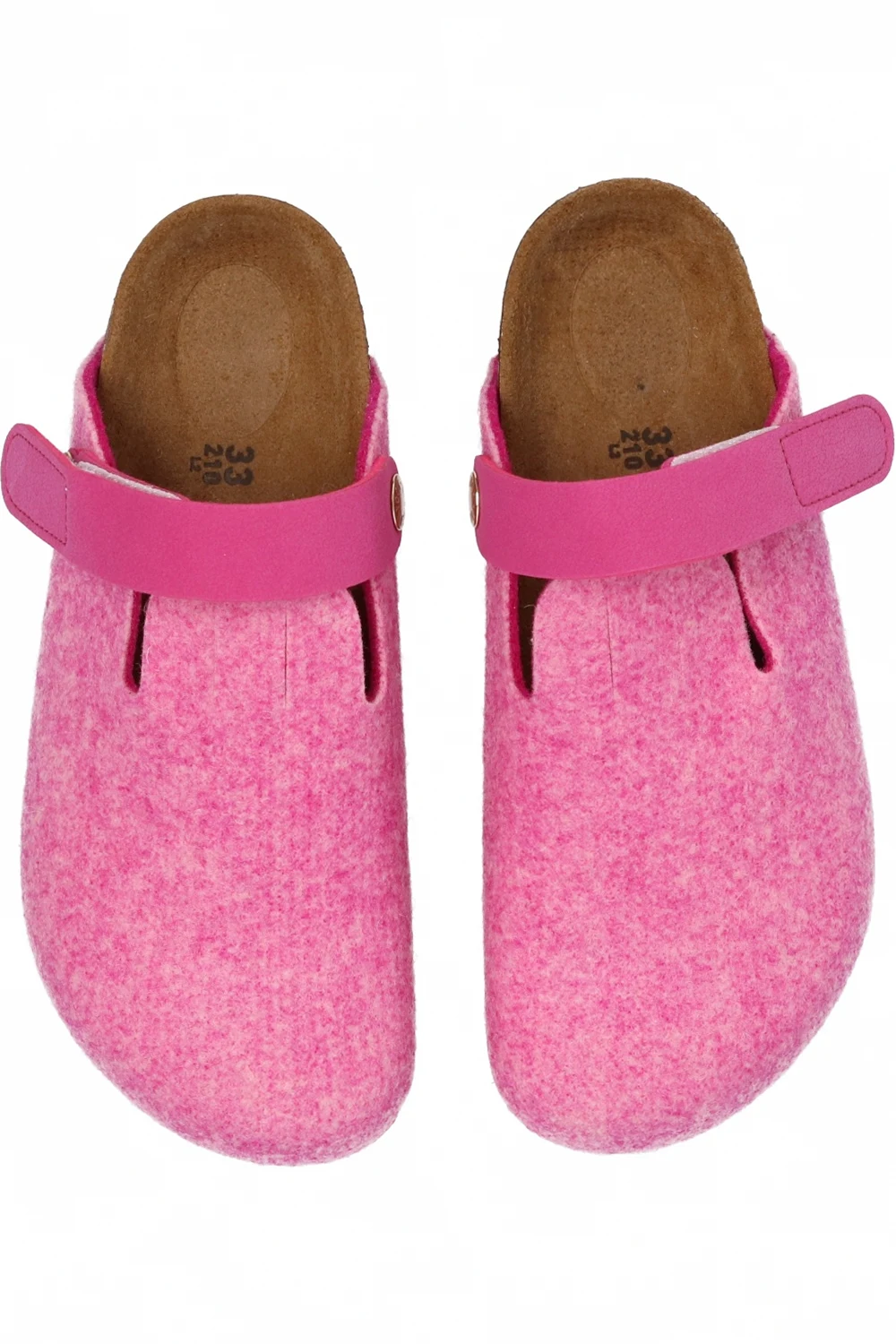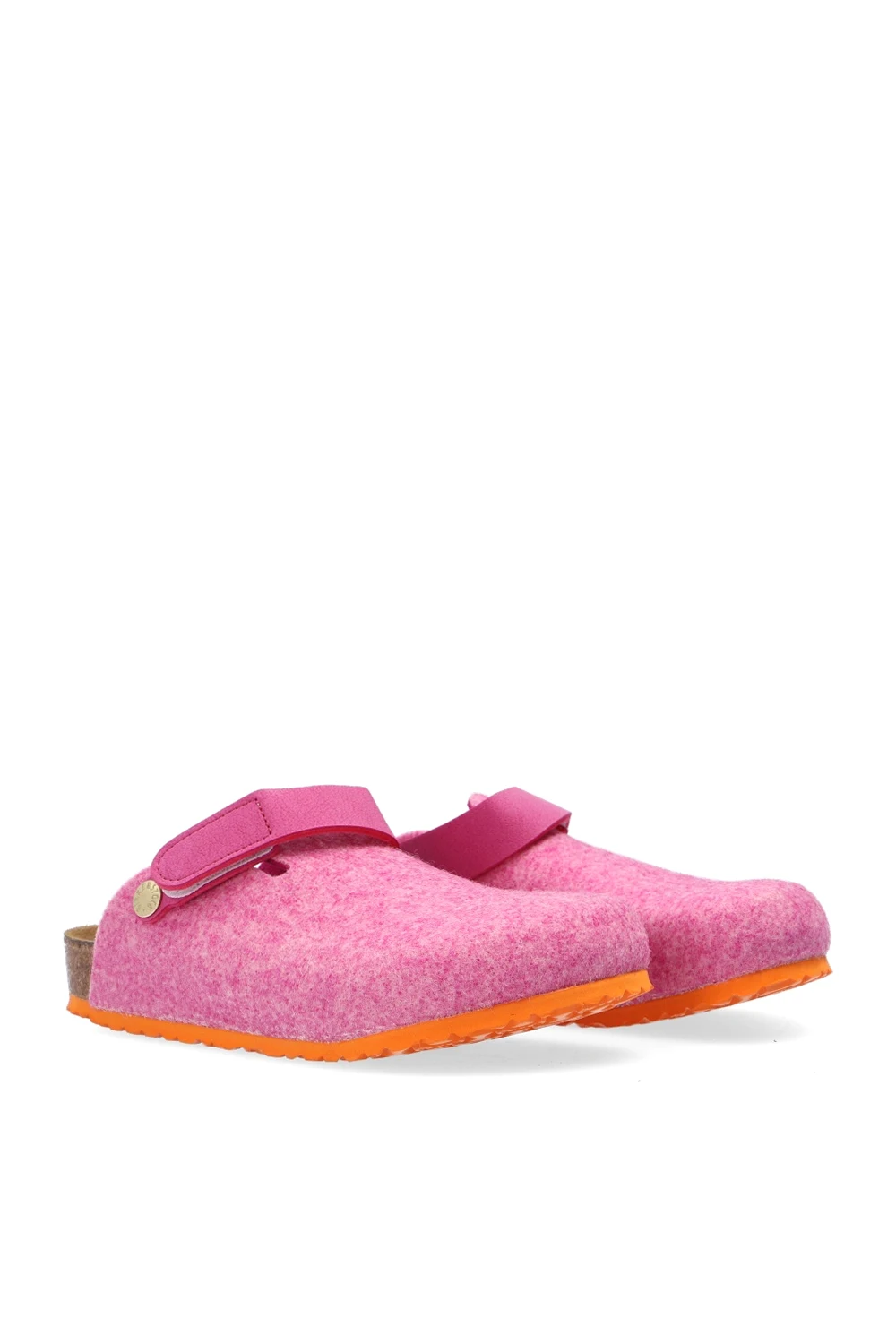 Pink ‘Zimba’ slippers from Birkenstock Kids. Crafted from wool felt, this pair displays white logo print for the brand recognition and has velcro strap for secure fit and an orange and brown sole made from natural cork and EVA foam.
