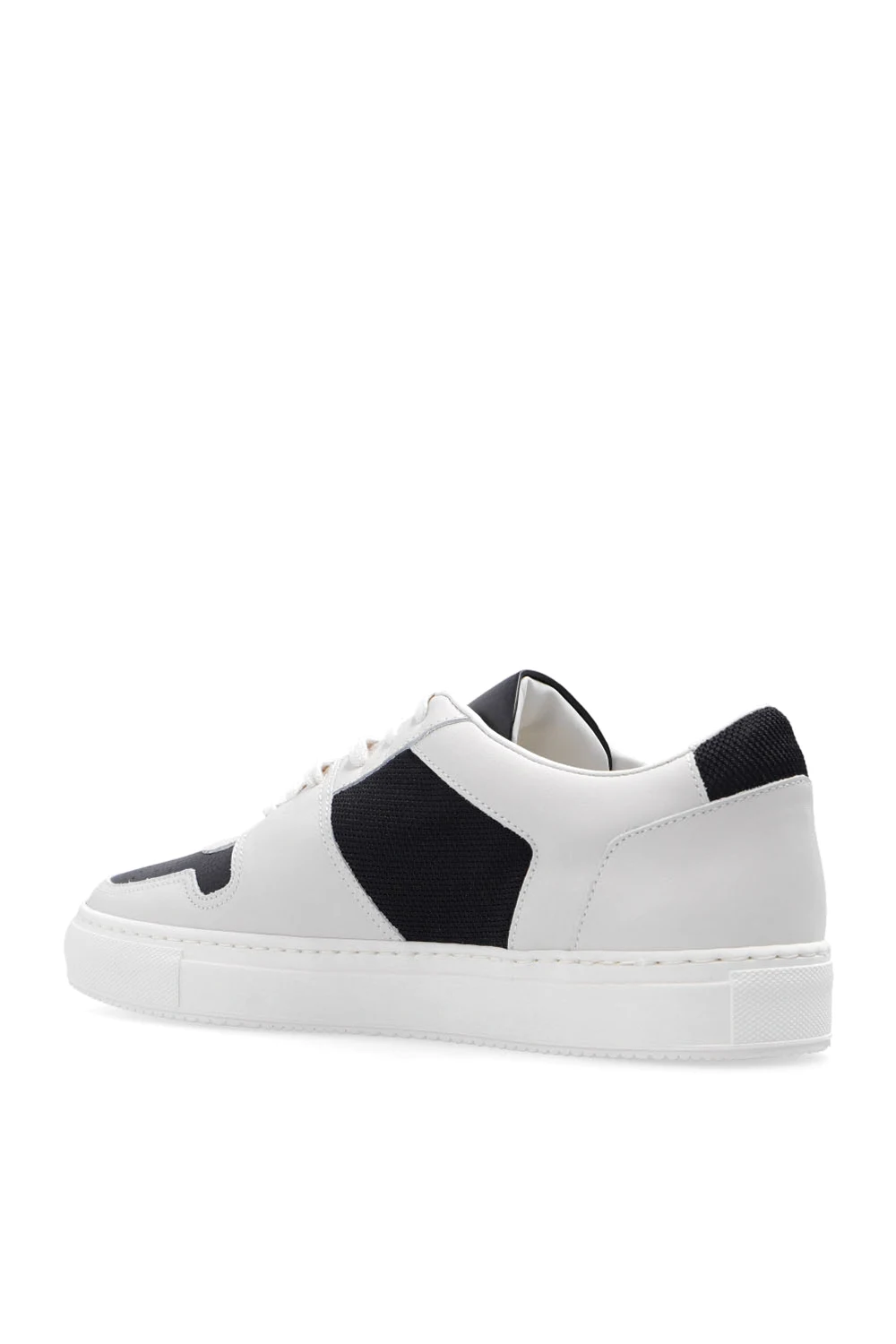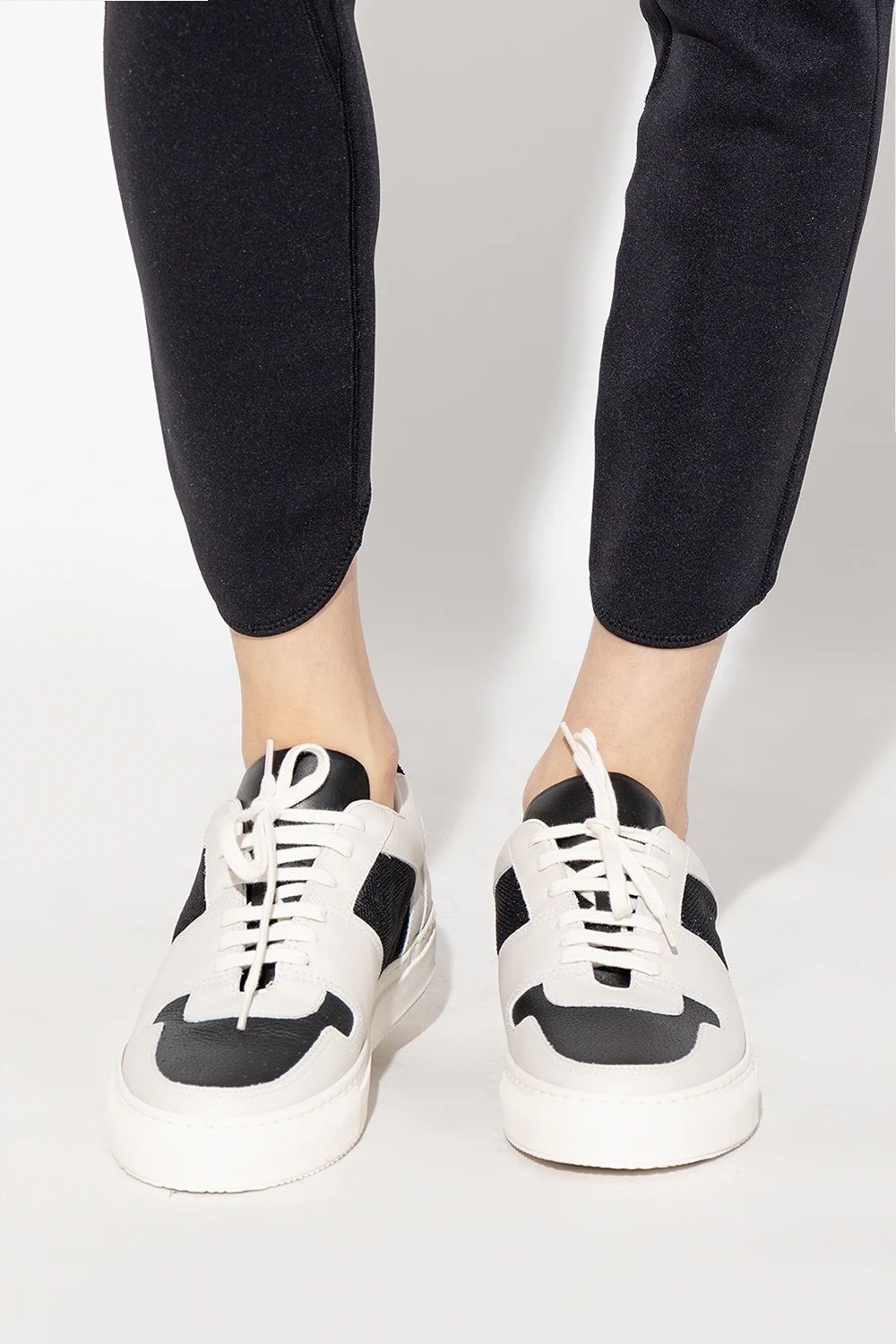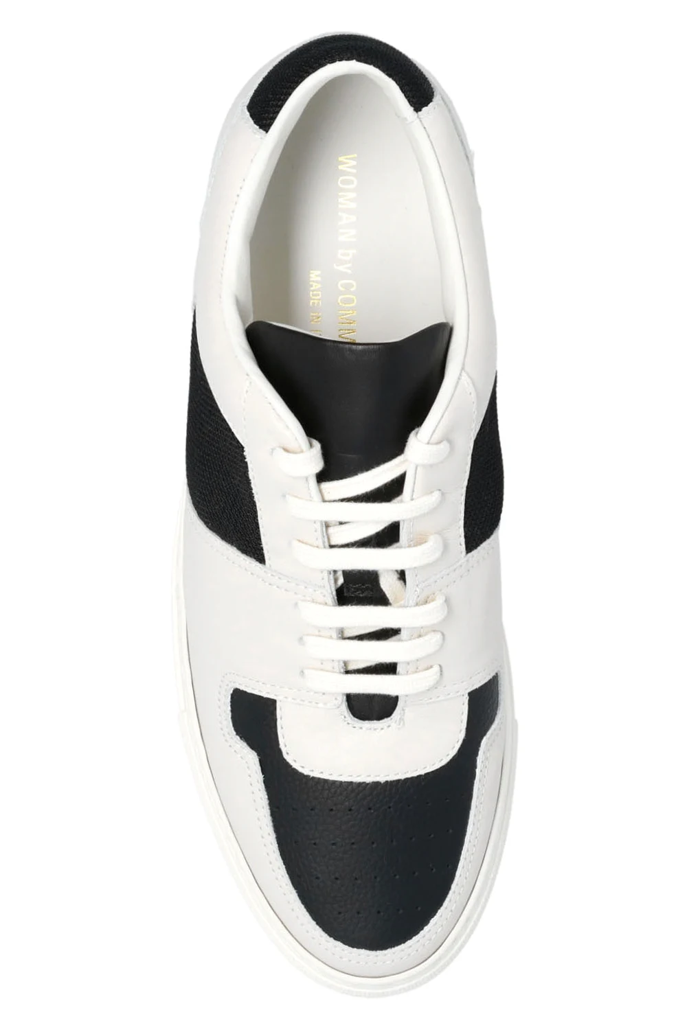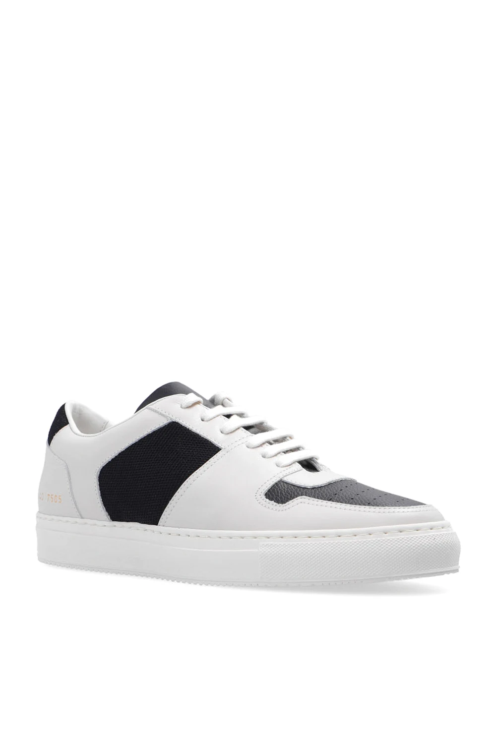 Cream and black ‘Decades Low’ sneakers from Common Projects. Crafted from leather, this lace-up model features fabric trims, a gold-tone print on the side, a perforated toe and a cream rubber sole. Swappable shoelaces included.