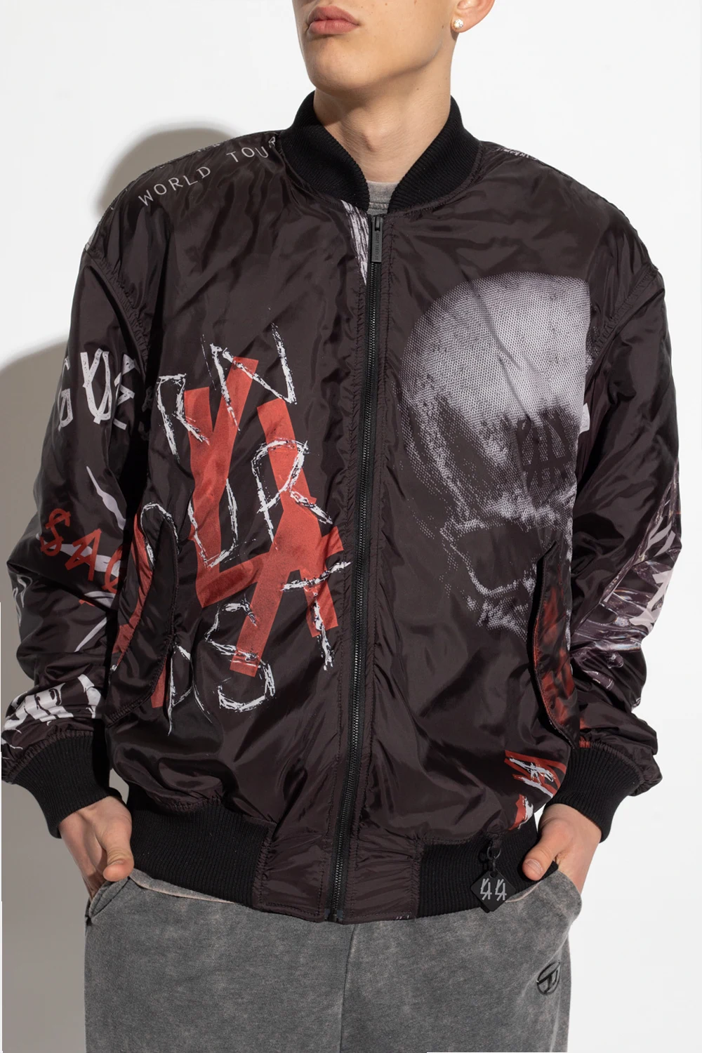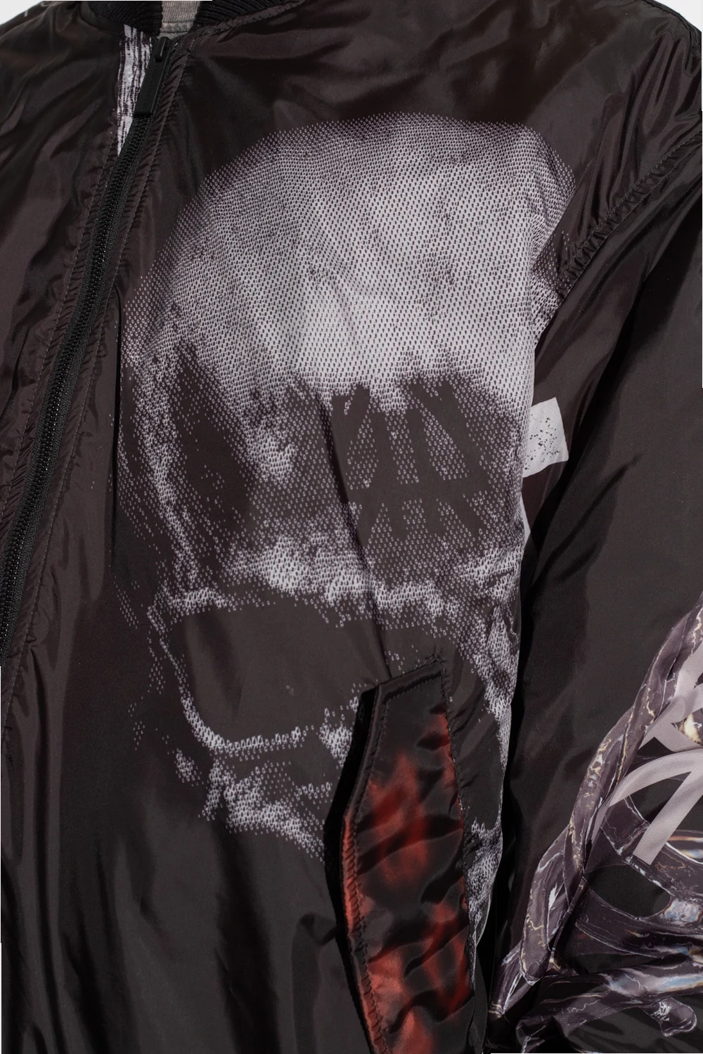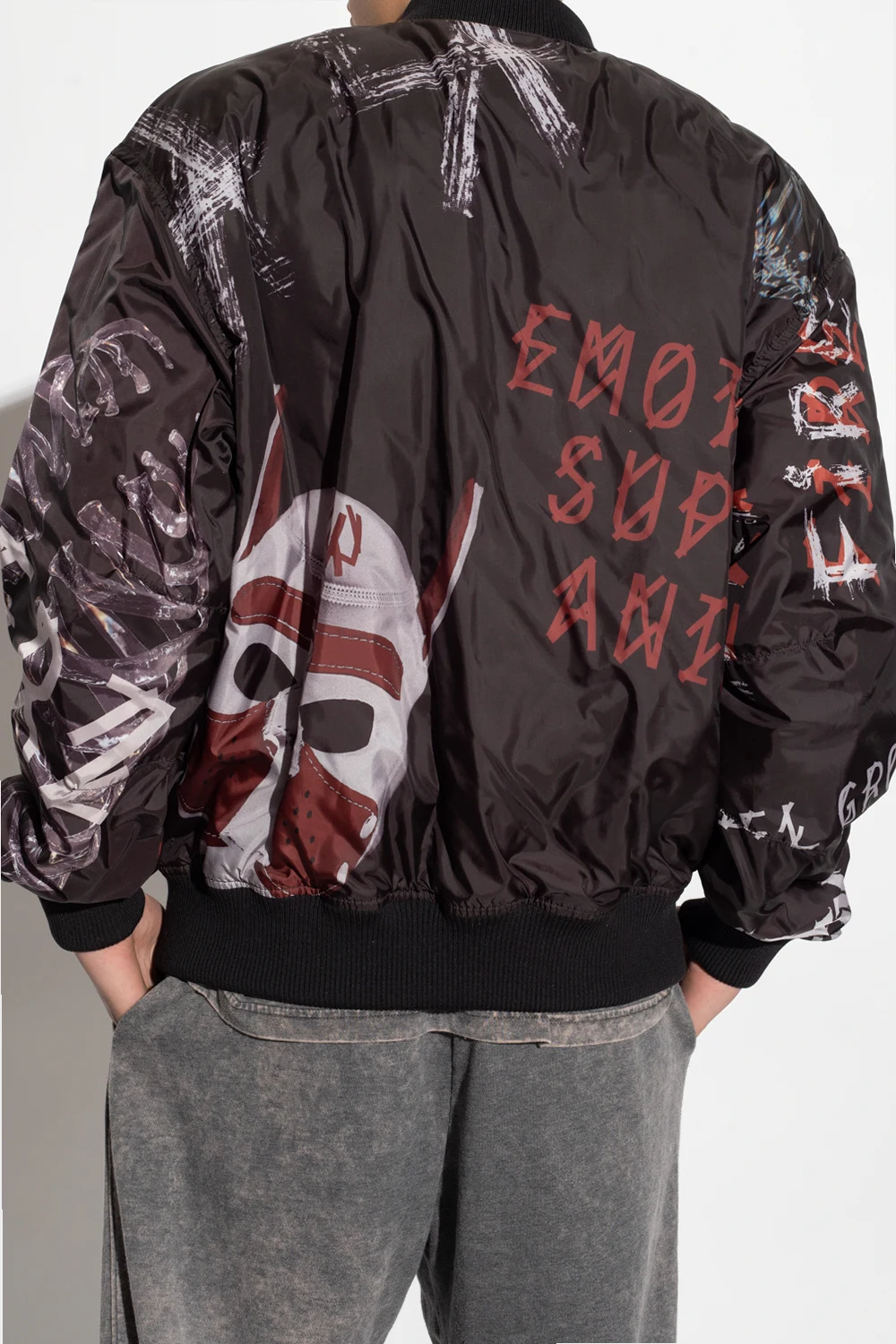 Black bomber jacket from 44 Label Group. Embellished with a logo charm and grey and red graphic prints, this style features a zip fastening, two flapped pockets with snaps and ribbed trims on the collar, bottom hem and long sleeves.