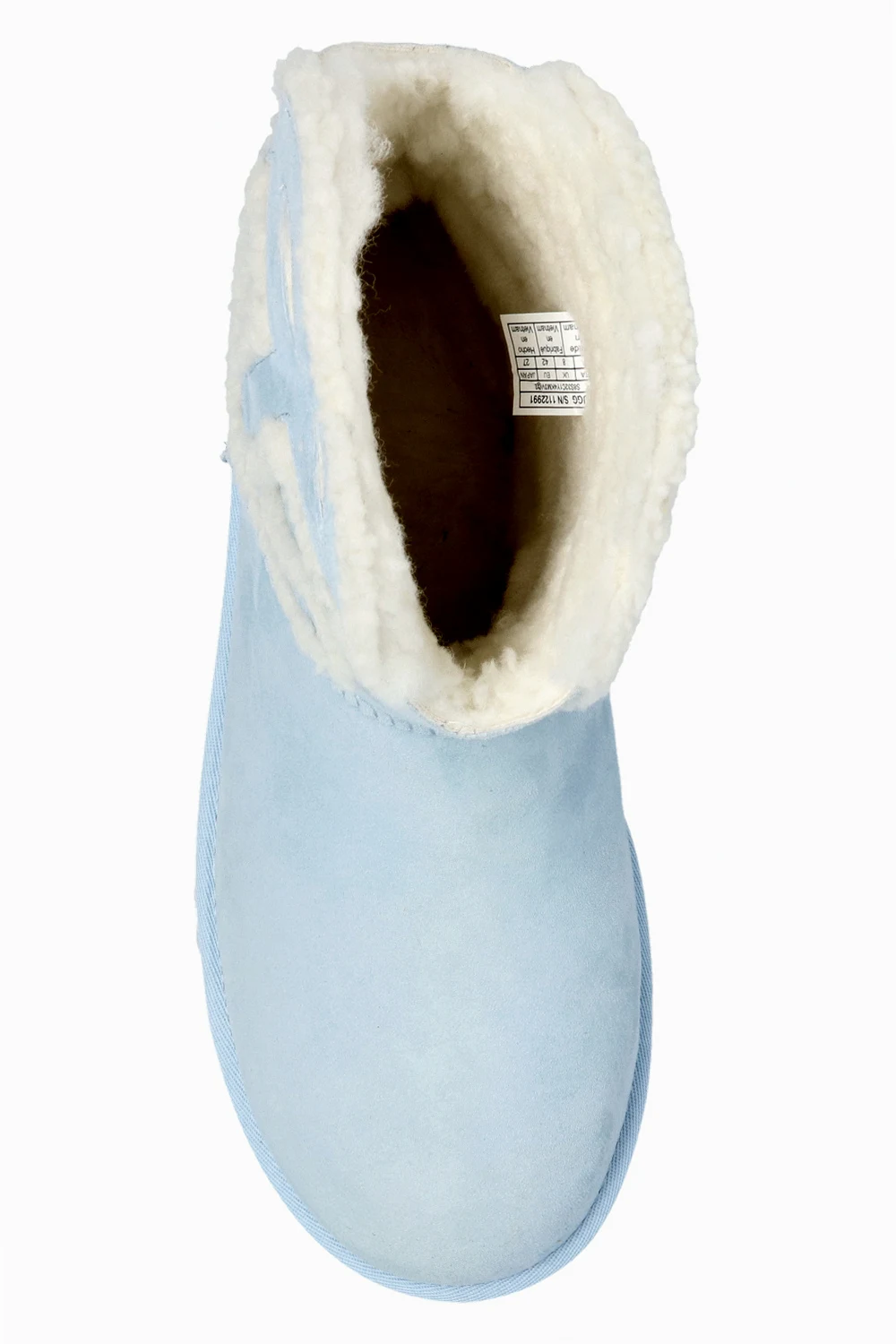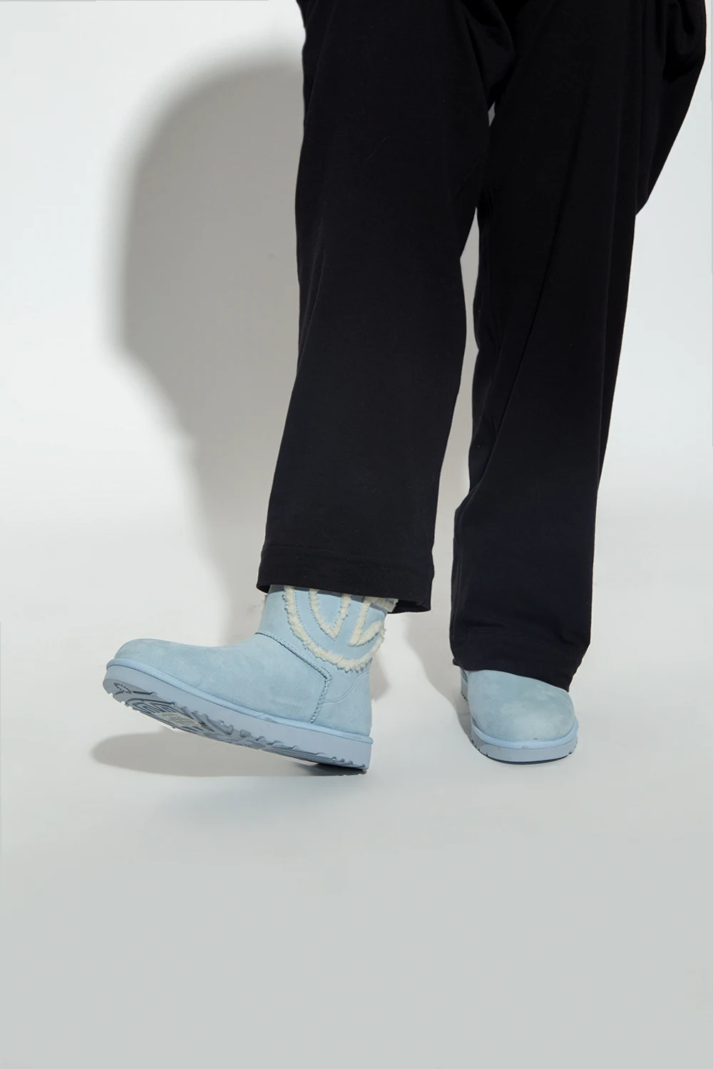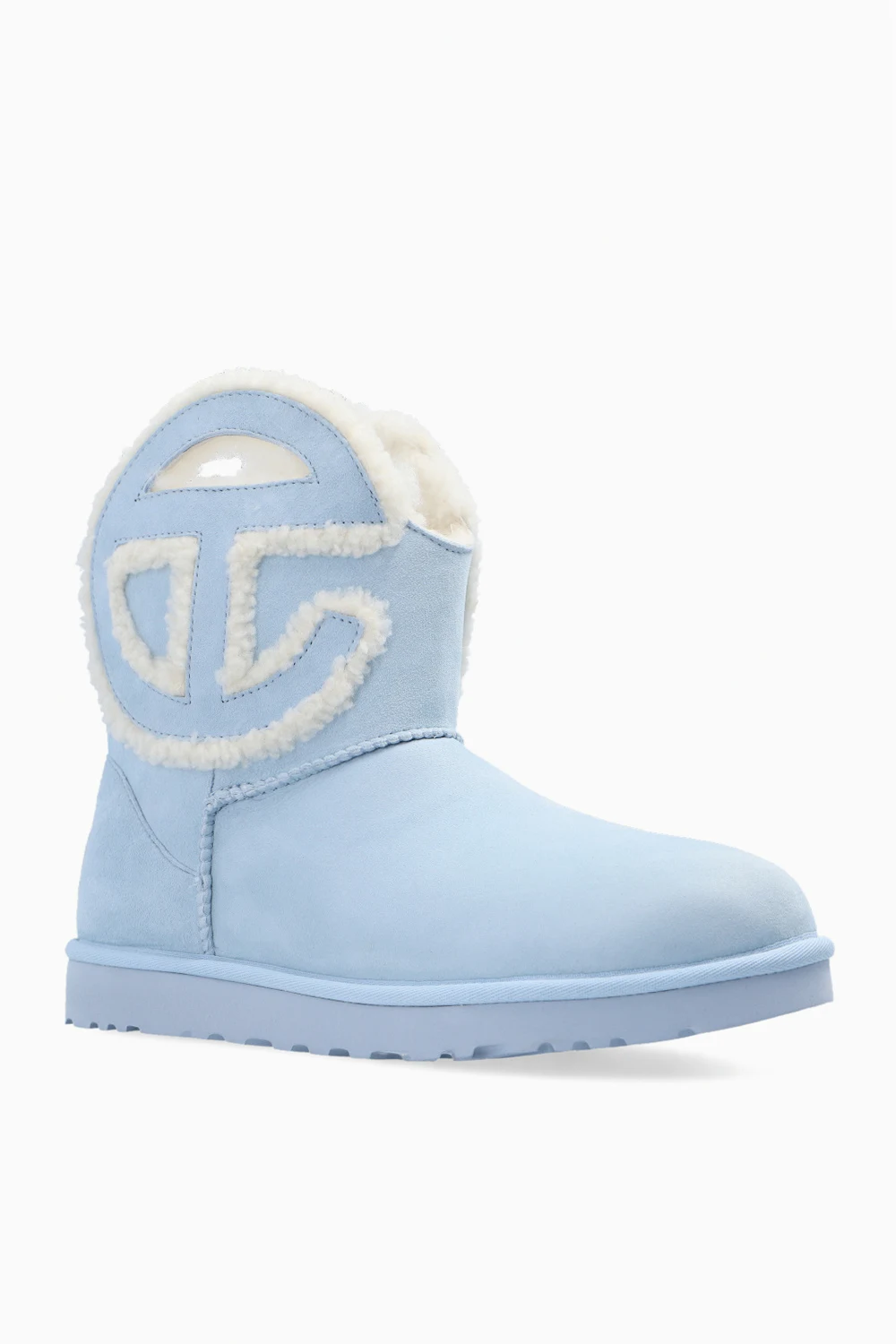 Blue snow boots from UGG x Telfar. Made of suede with wool trims, this almond toe pair features a cut-out logo pattern and a pink rubber sole.