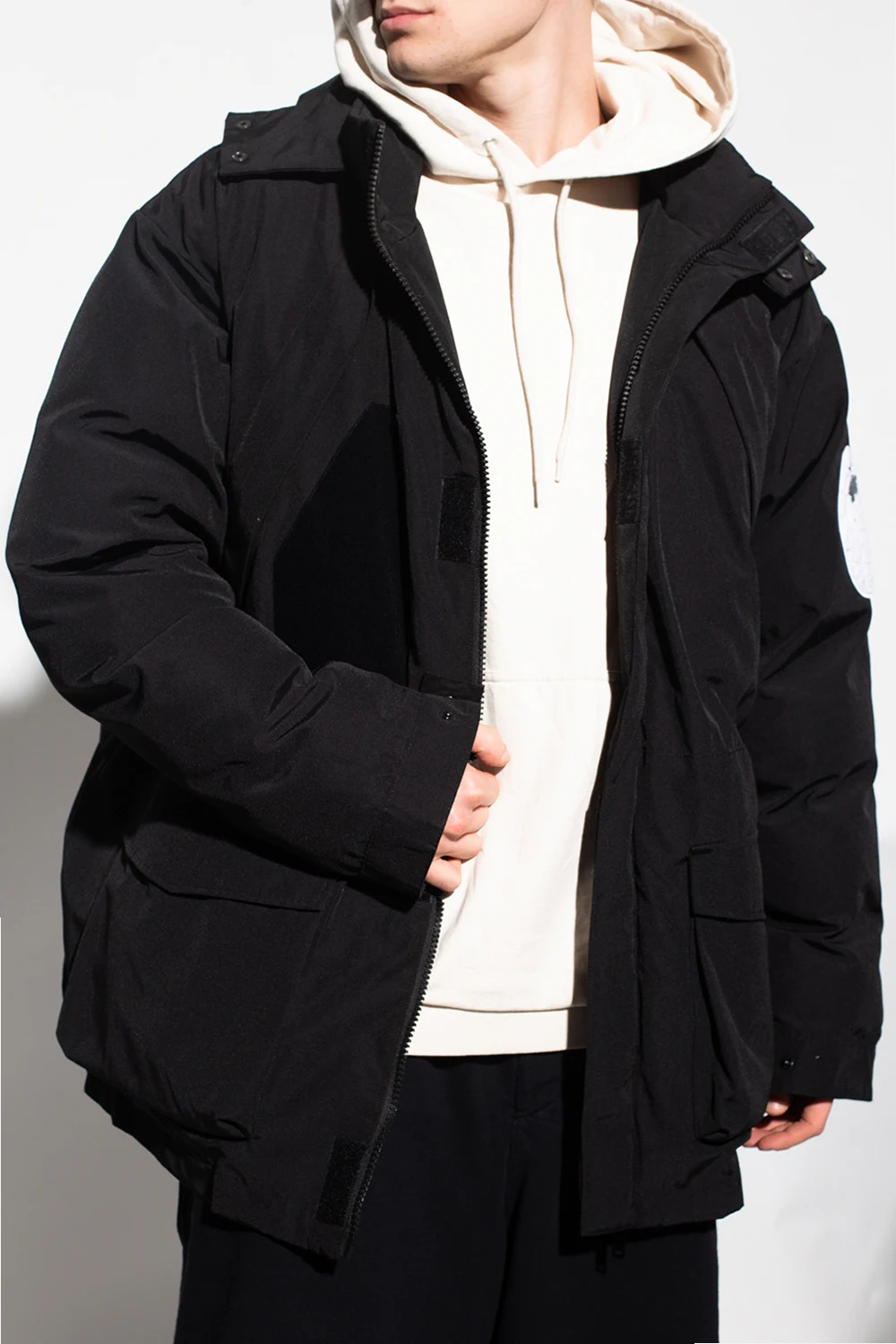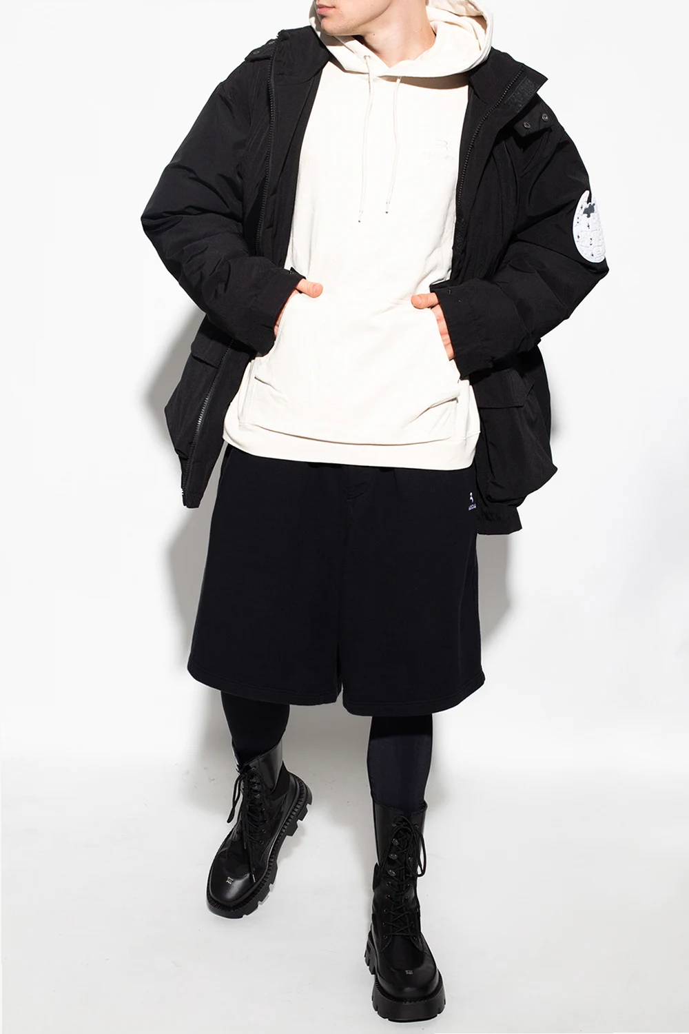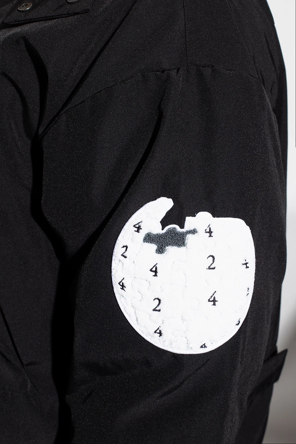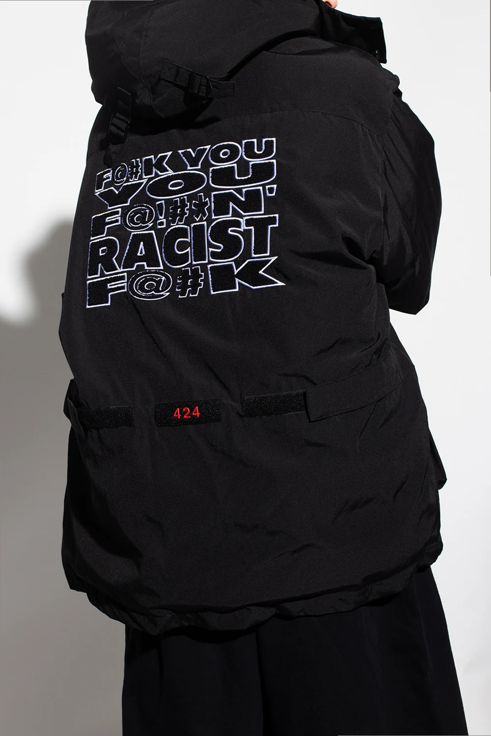 Black jacket with a detachable hood from 424. Embroidered with lettering and a logo in white, black and red, this style features zippers, snap and velcro closures, textured panelling, long sleeves, a quilted lining and two velcro-fastened flap pockets on the front.