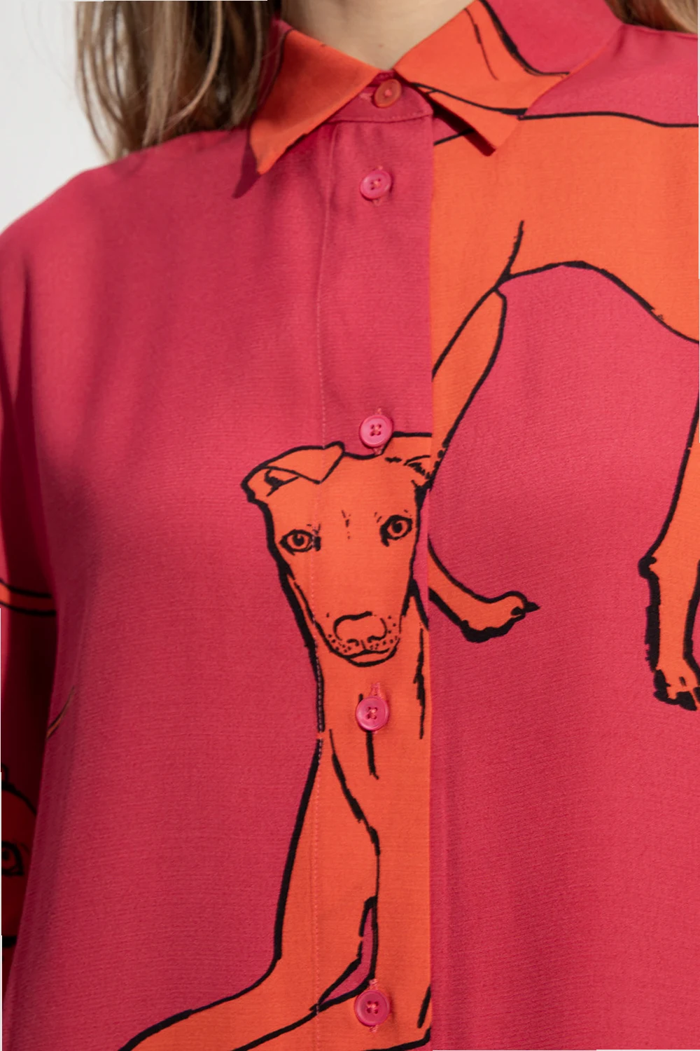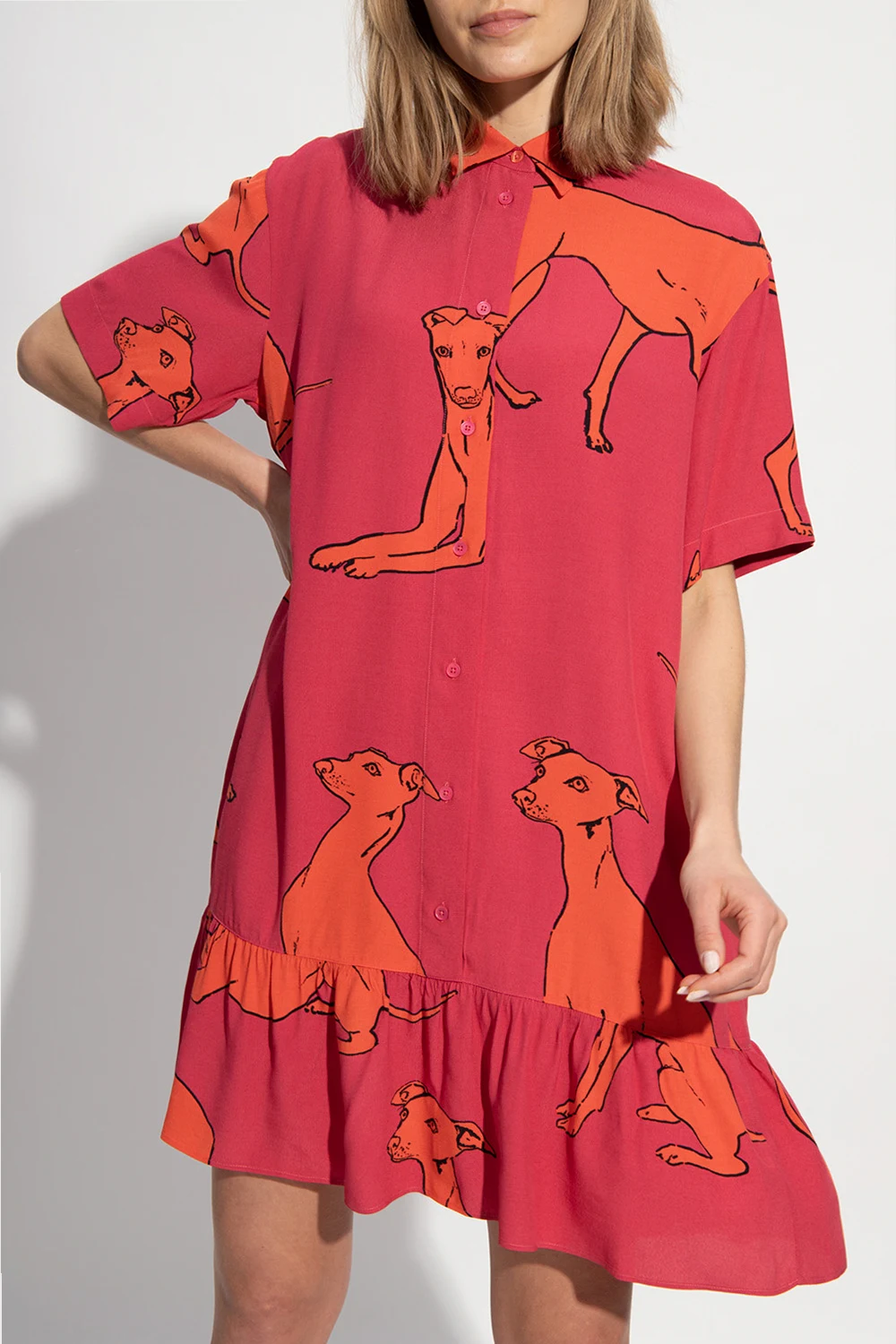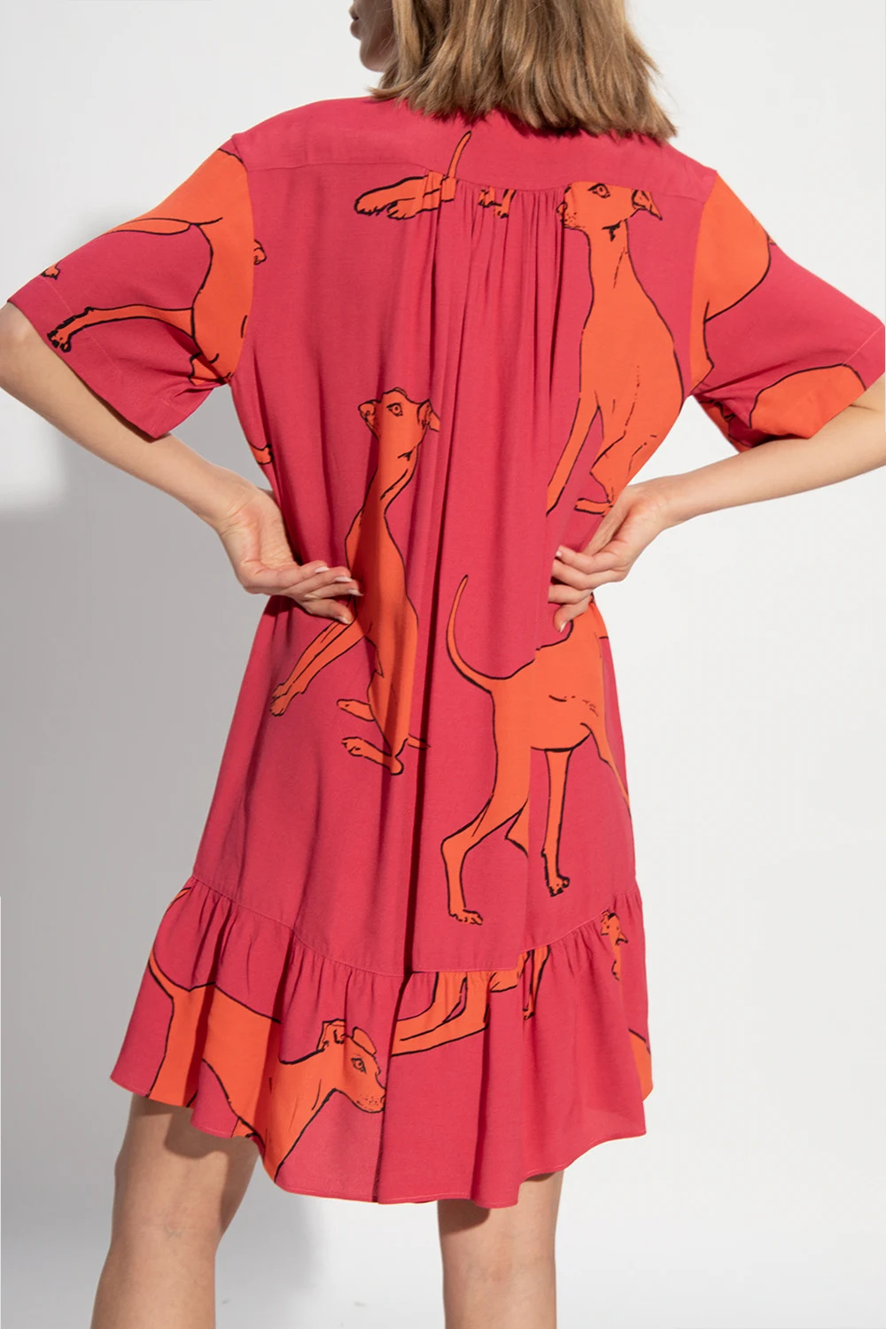 Pink dress from Paul Smith. Embellished with gathers and an orange and black graphic print, this item features button fastenings and short sleeves.