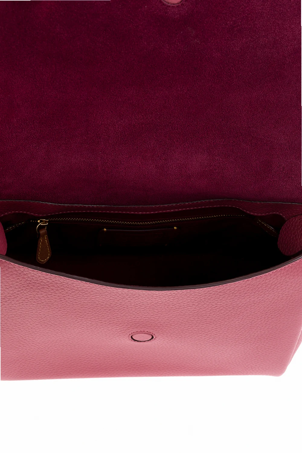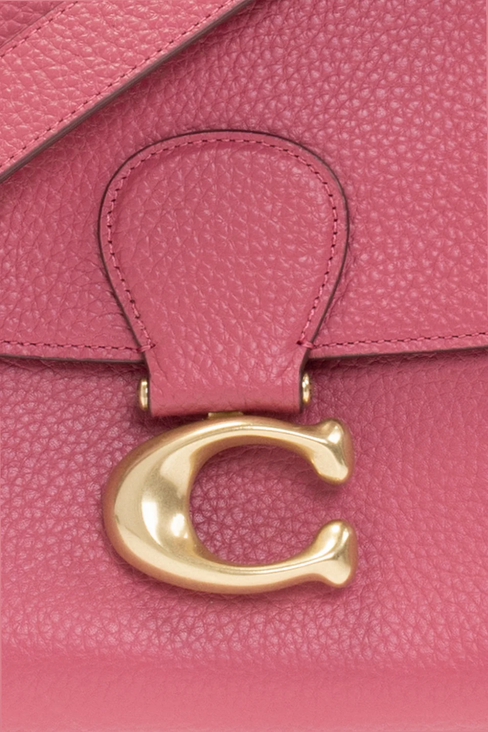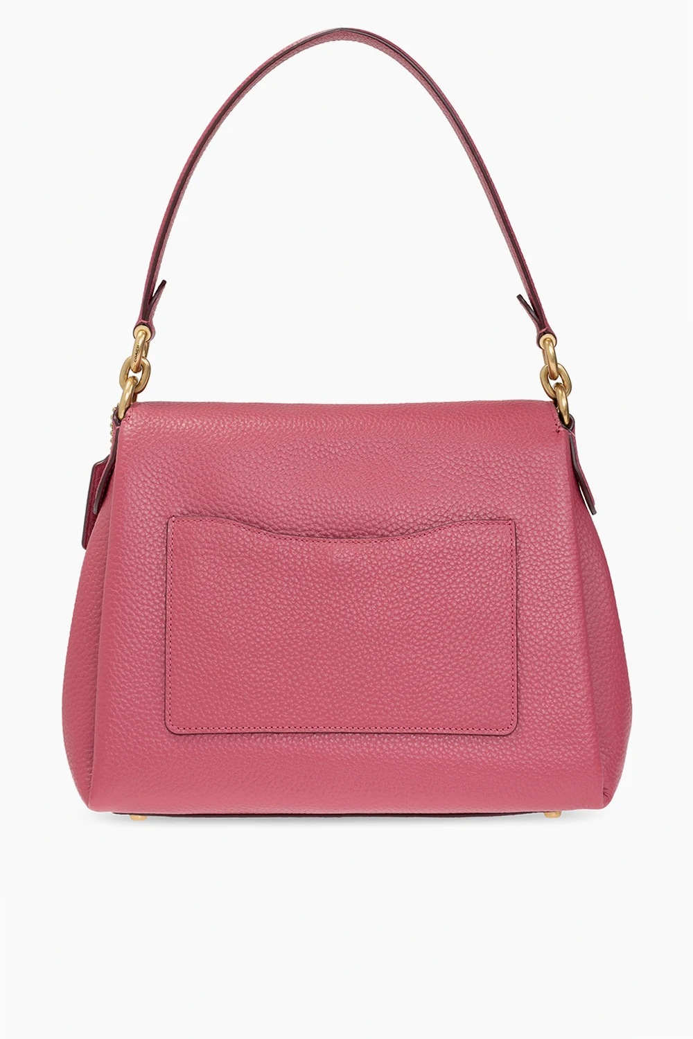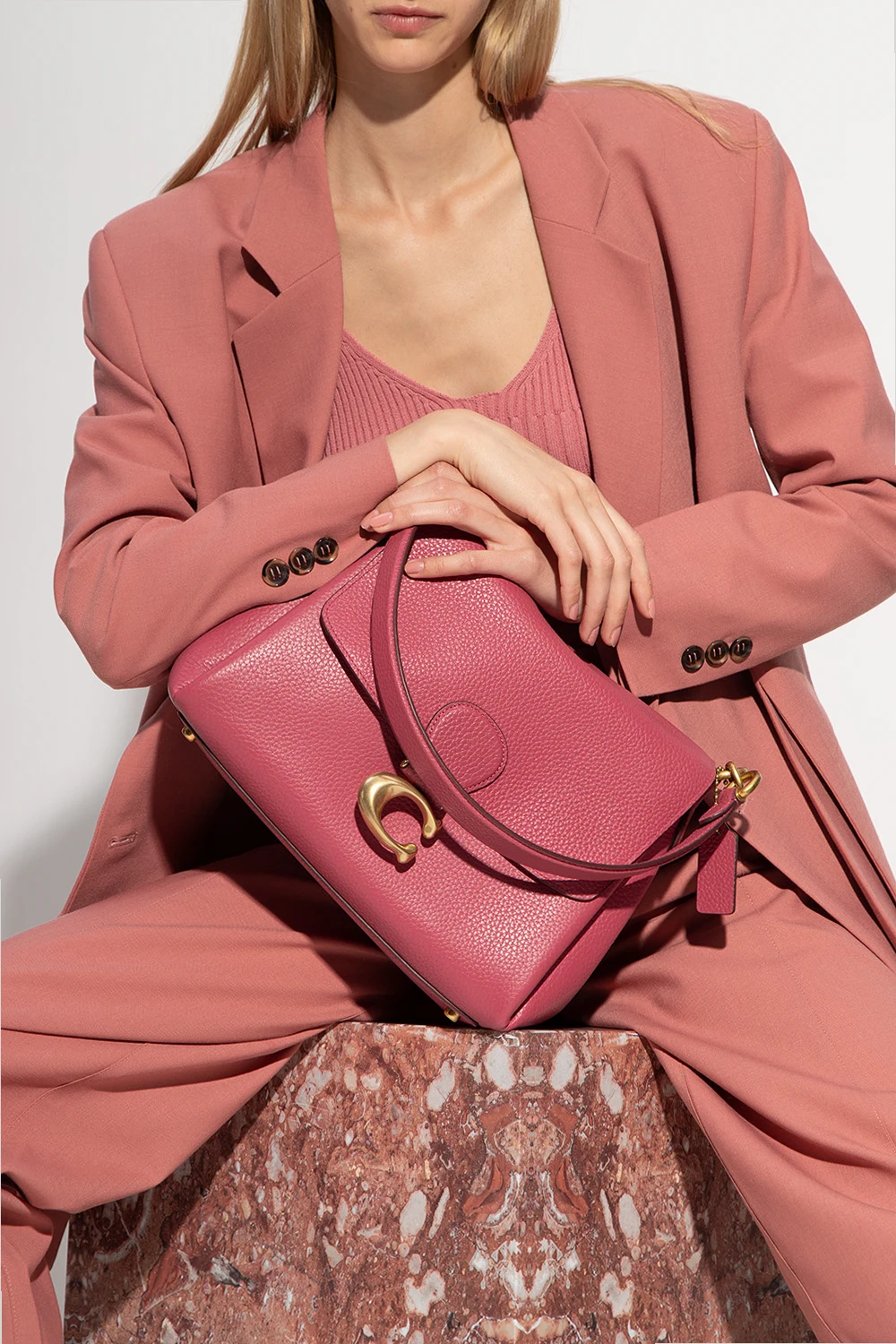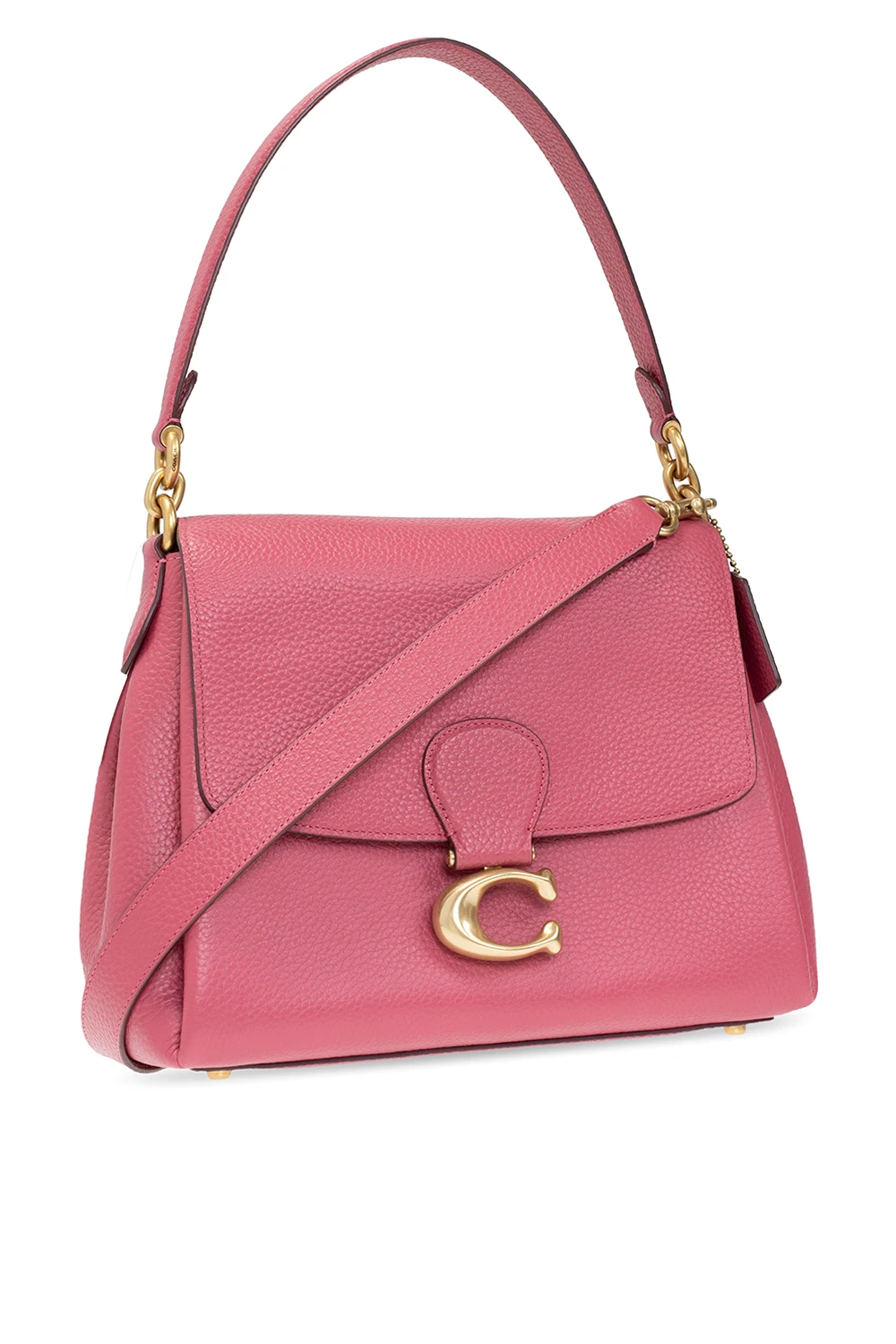 Pink 'May' shoulder bag from Coach. Crafted from grainy leather, this design secures with a magnetic fastener and showcases a metal logo plaque, a snap-fastened pocket at the back, a half-round handle, a detachable and adjustable shoulder strap, gold-tone metal hardware and a purple-clad interior with one compartment and one zip pocket.