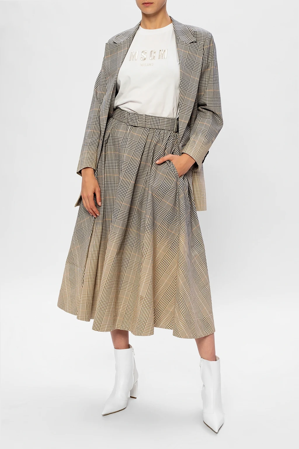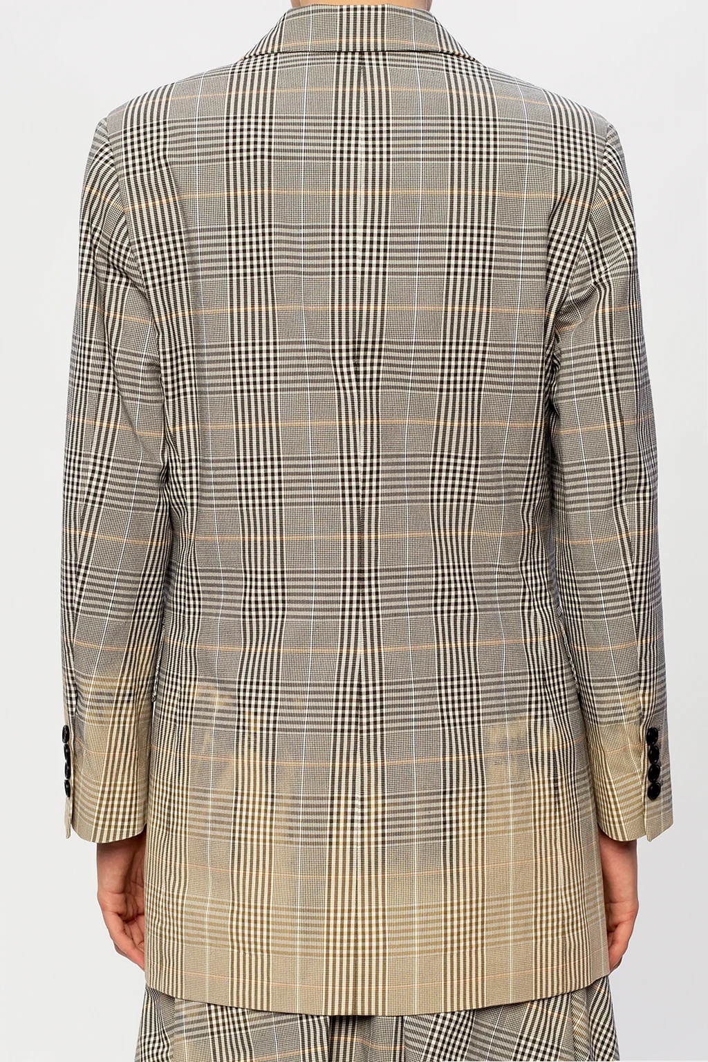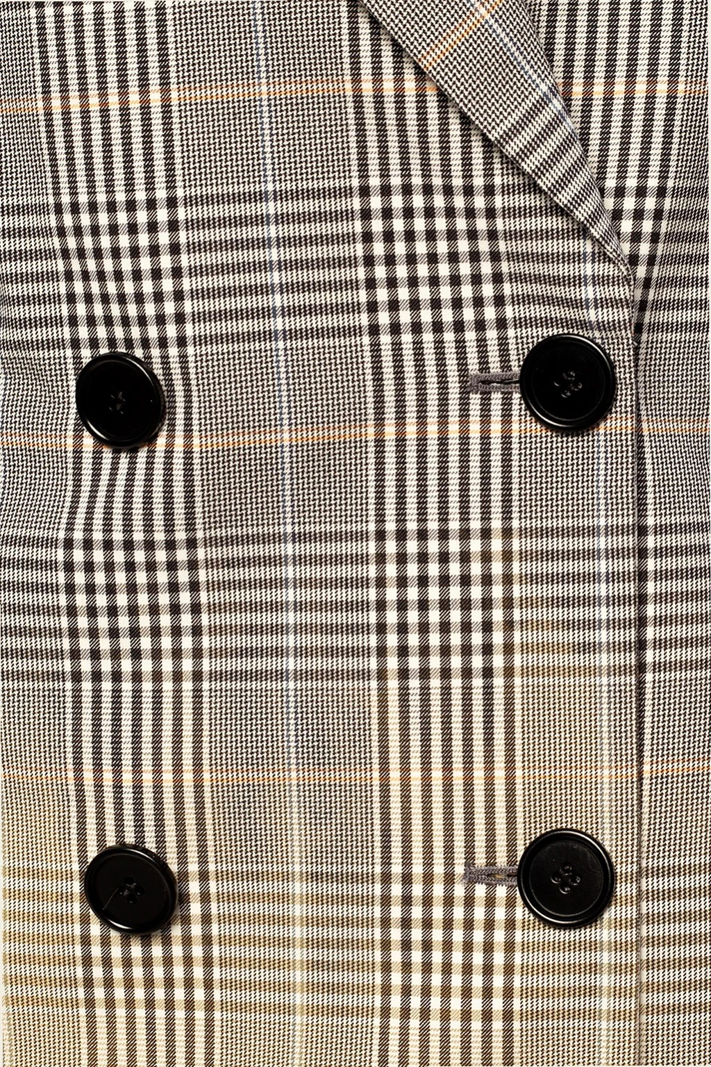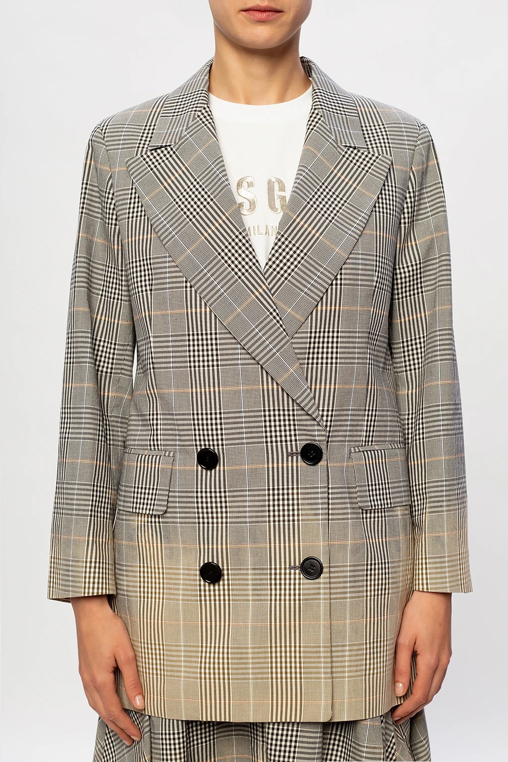 Grey double-breasted blazer from MSGM. Crafted from cotton, this design features button fastenings, an embroidered check pattern in black, white and orange, two flap pockets on the front, notch lapels and padded shoulders.