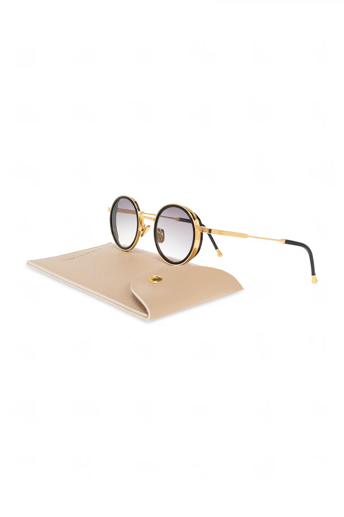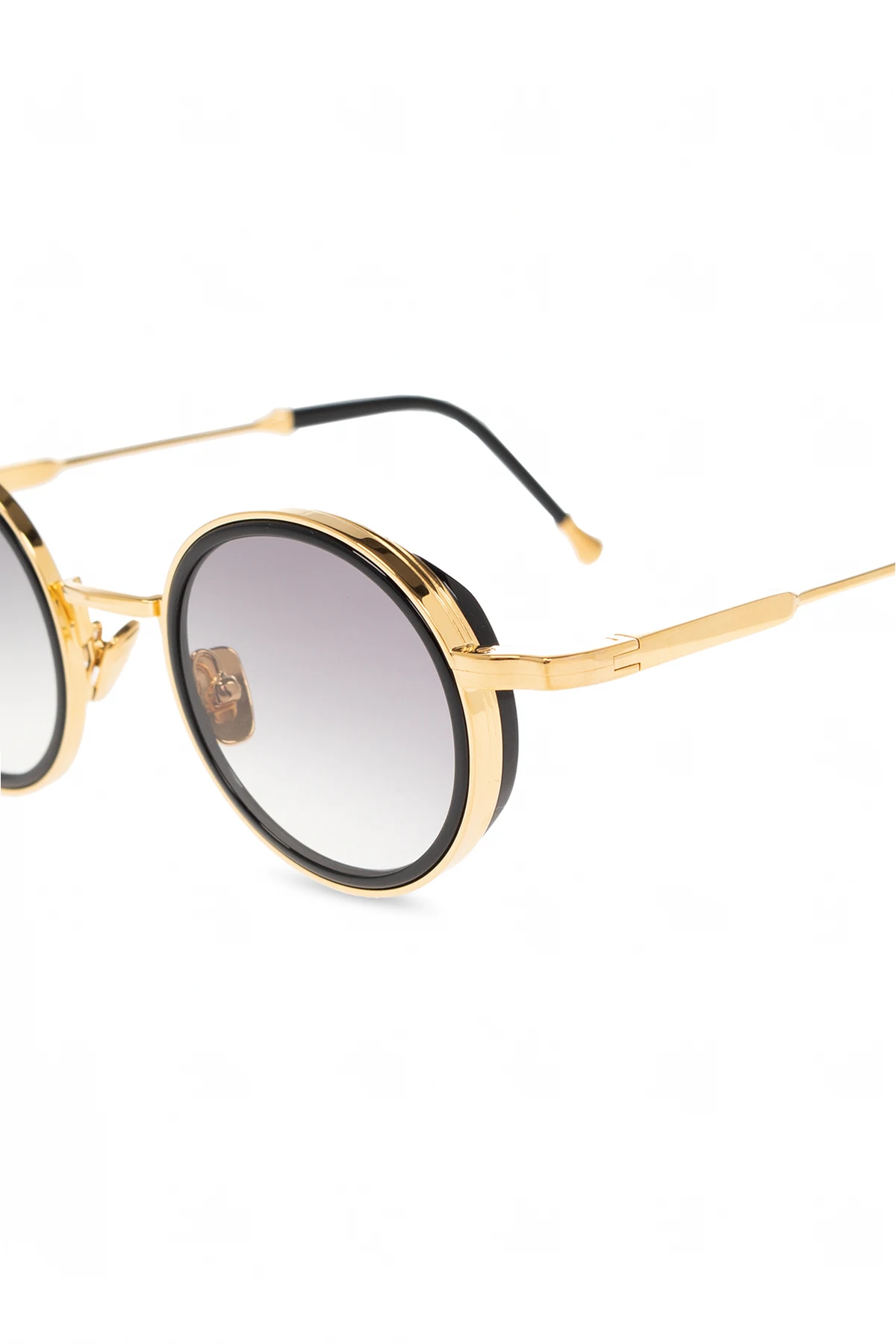 Black and gold-tone ‘Daniel’ sunglasses from John Dalia. A round frame shape with acetate rims cut that stands out from the 4mm streak-engraved metal. Single bridge complete with adjustable branded nose pads. 22-carat yellow gold-plated alloy frame (c. 5µ layer and jewelry stamp inside the temple). Grey gradient CR39 lenses with AR treatment. Case included. Handmade in France.