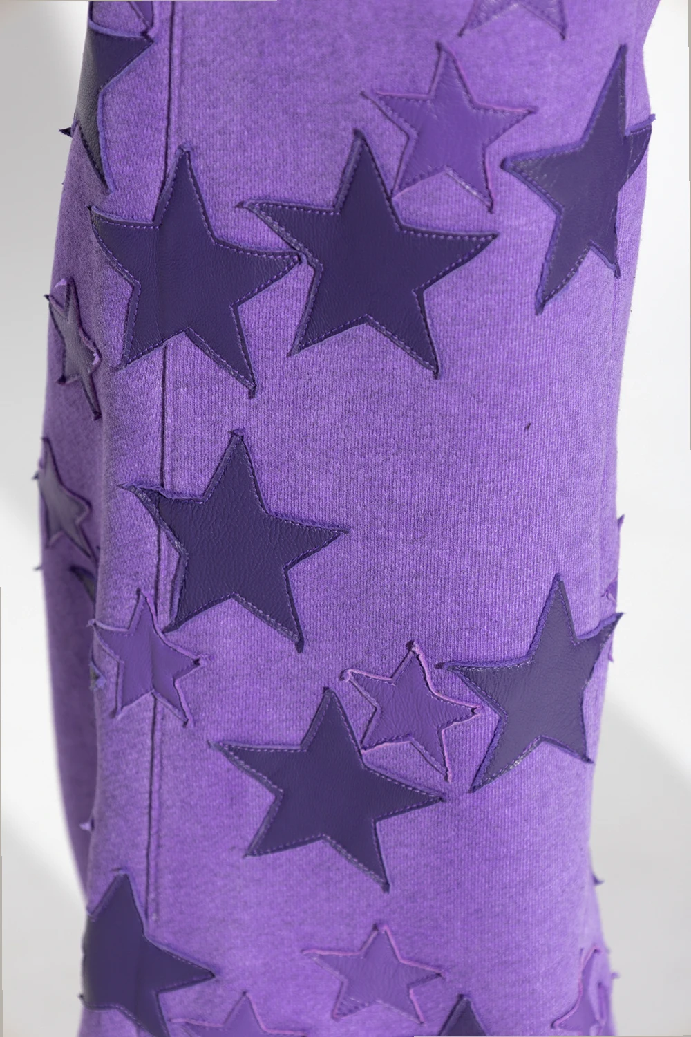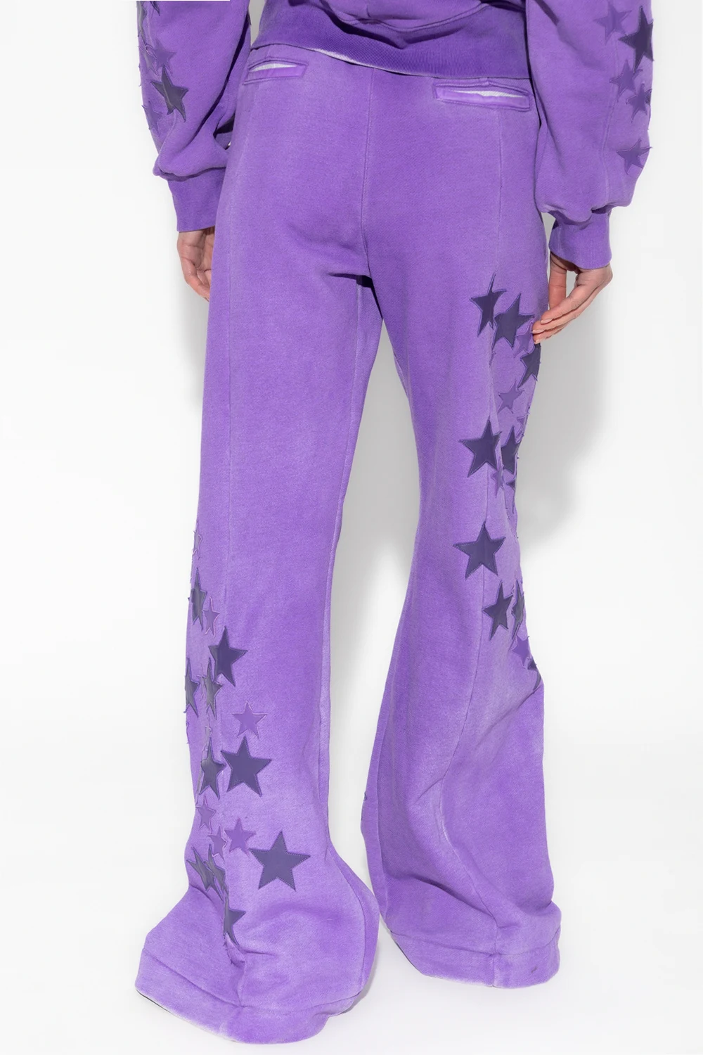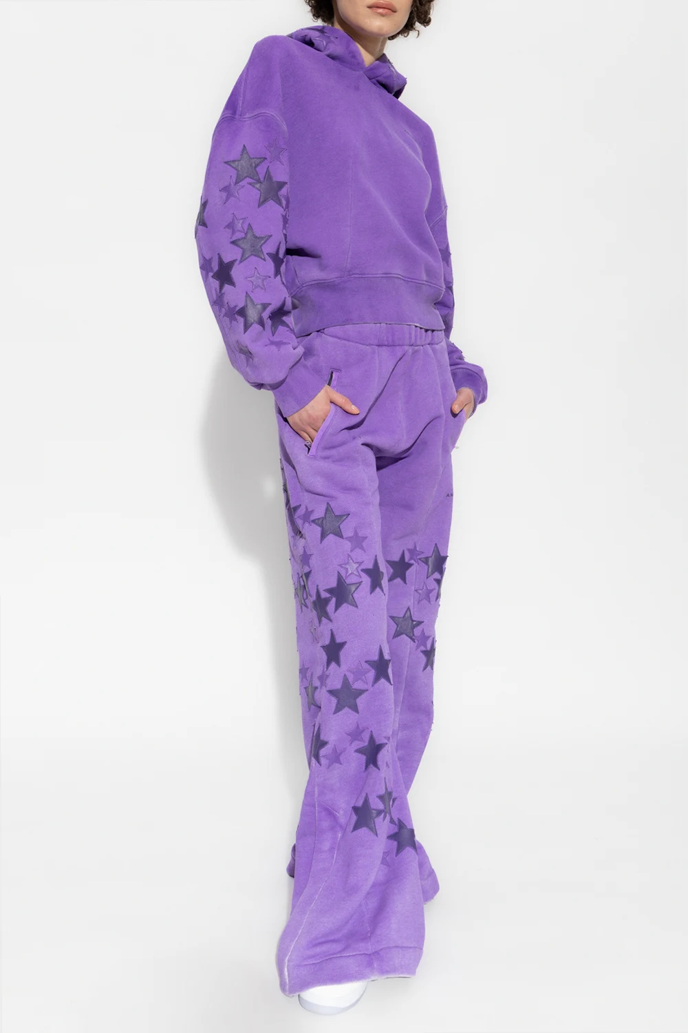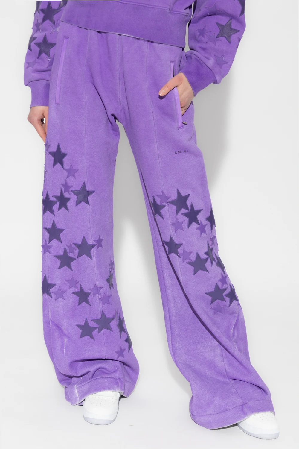 Purple sweatpants from Amiri. Made of cotton, this pair falls with flared legs and showcases the brand's logo and star-shaped patches. It is complete with an elasticated waistband, two front button pockets, two back welt pockets, exposed stitching details and snap closures on the sides.