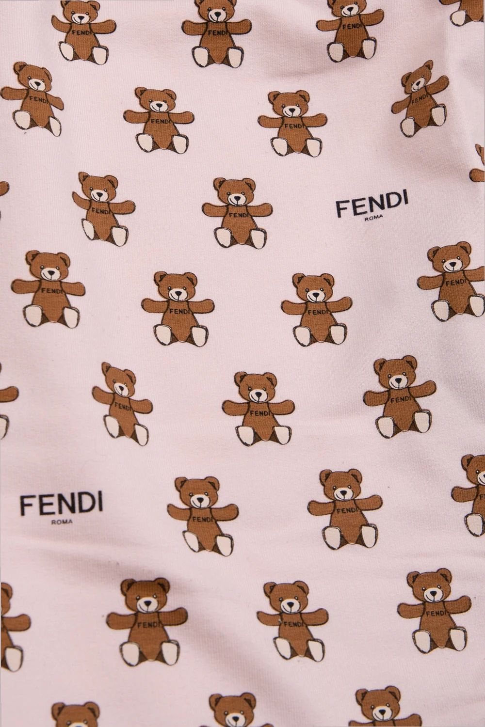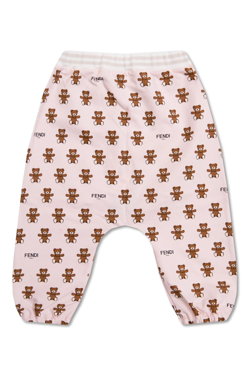 Light pink sweatpants from Fendi Kids. Made of cotton, this pair features an elasticated waistband in white and beige and a logo & teddy bear pattern in brown, beige and black.