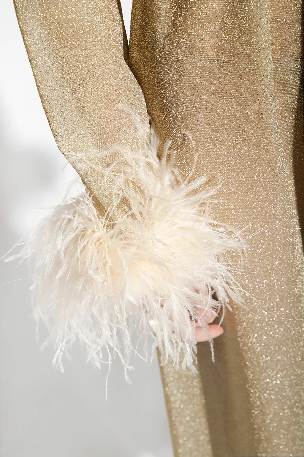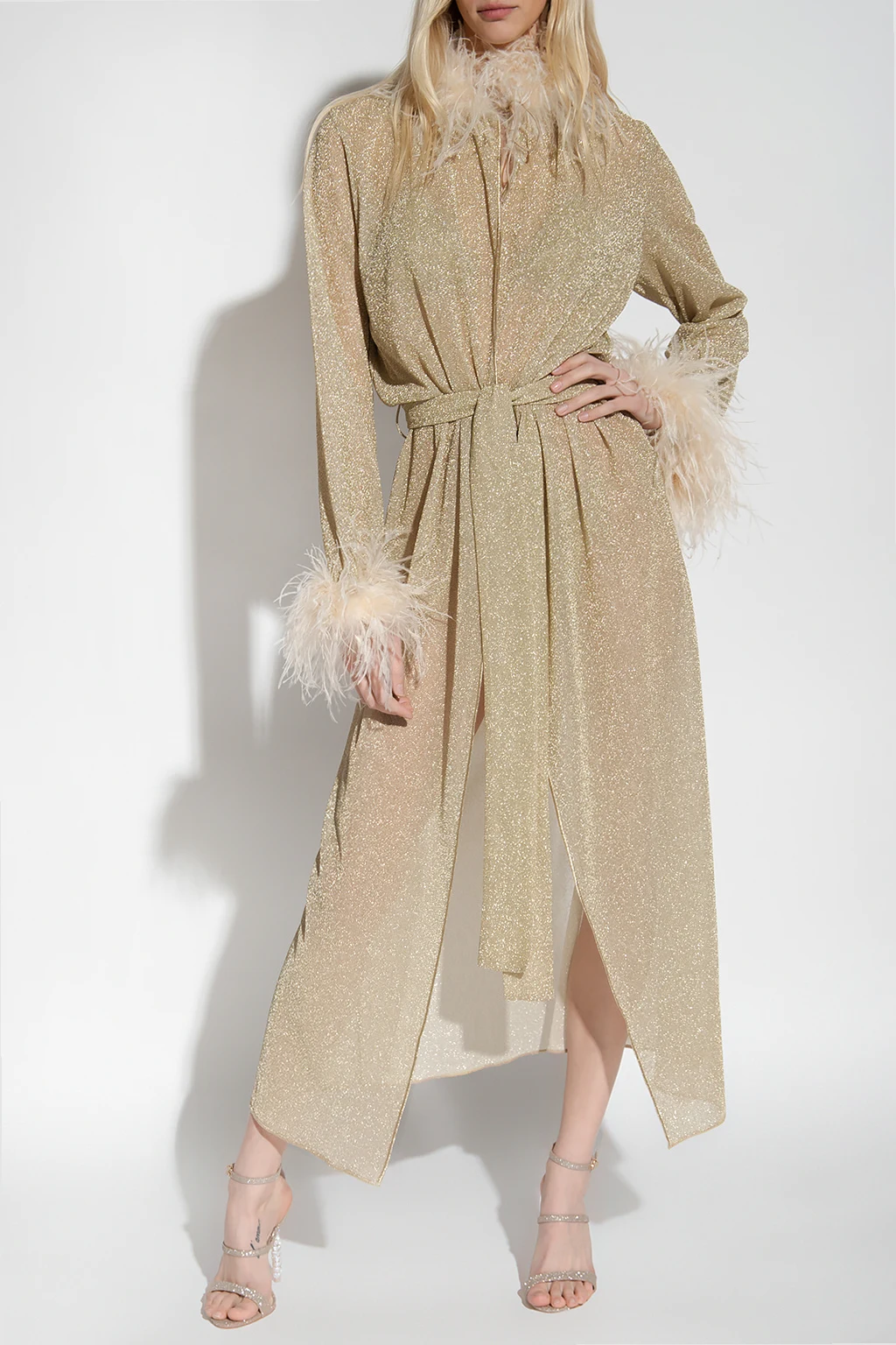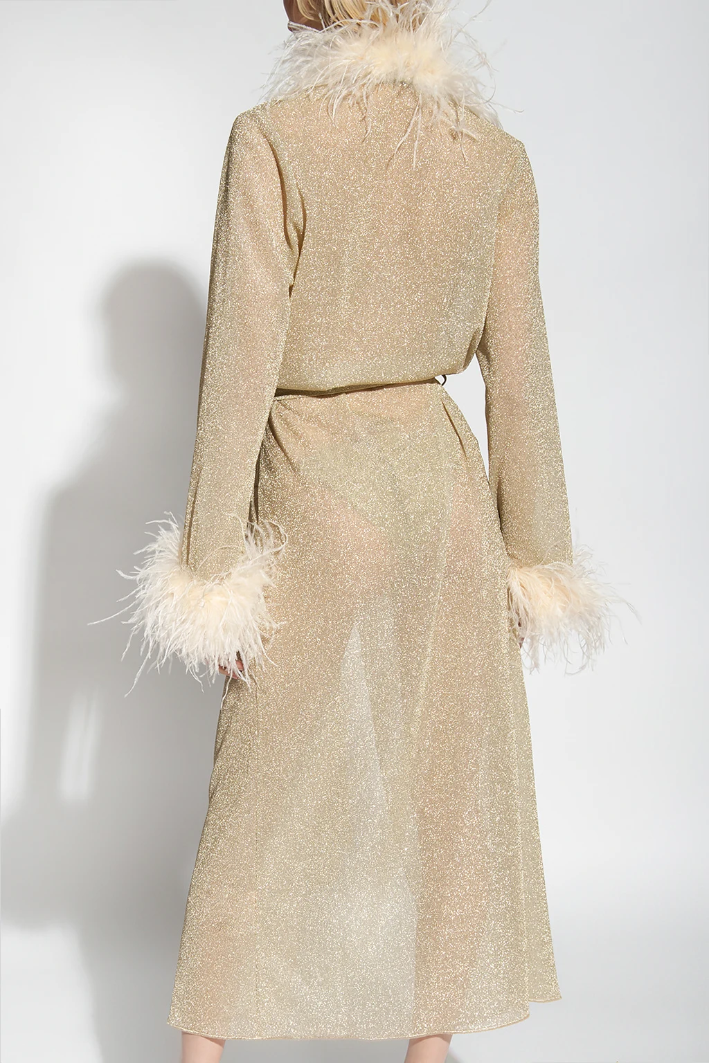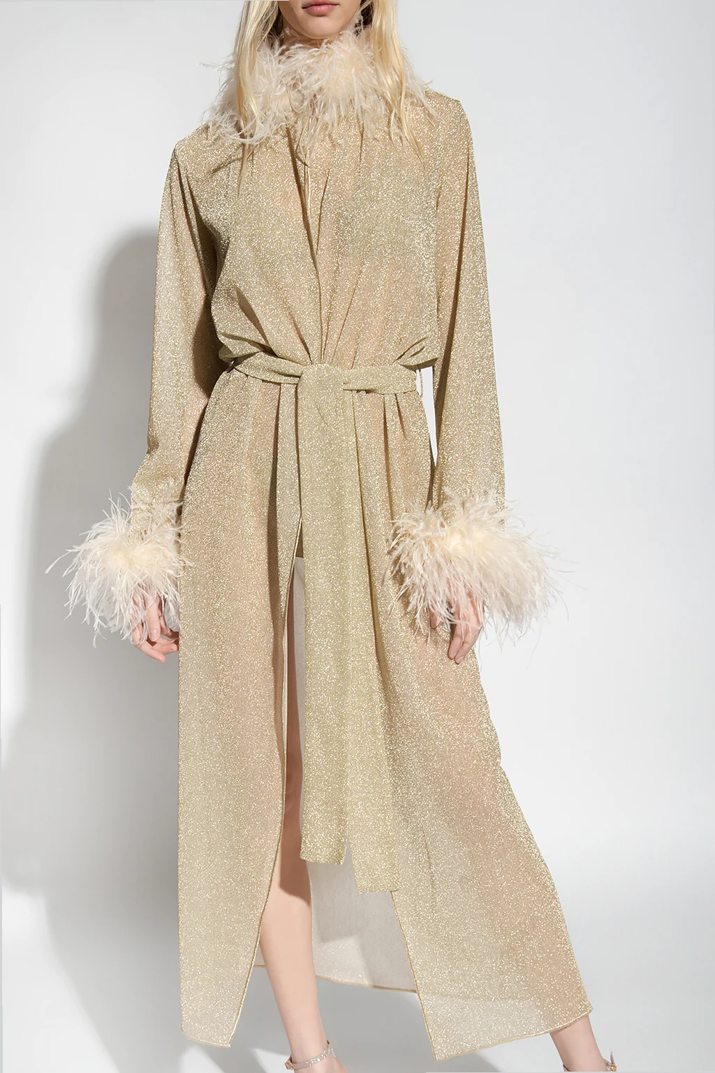 Gold-tone coat from Oseree. Trimmed with ostrich feathers, this style features a waist-cinching tie belt and long sleeves.