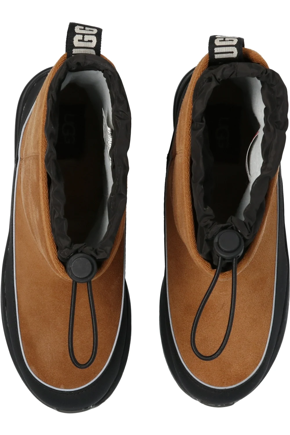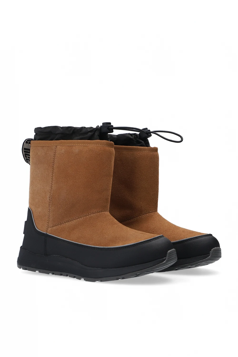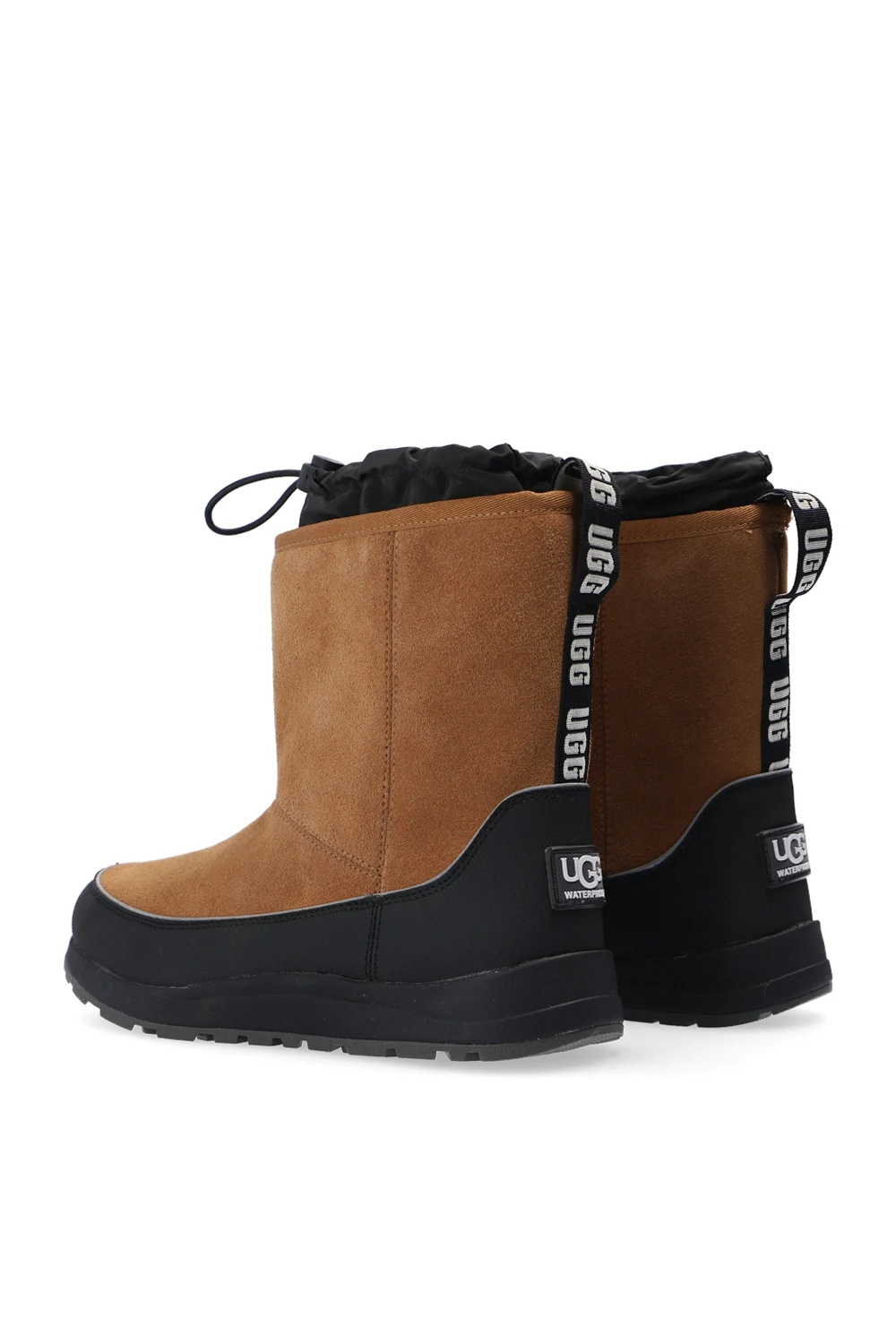 Brown, black and grey ‘K Kirby Wp’ snow boots from UGG Kids. Finished with waterproof suede and lined with sheep wool, this pair features drawstrings, a black grosgrain pull strap embroidered with a white logo and a raised logo appliqué at the heel as well as a grey rubber sole at the base. Cold-weather rated to -20° C.
