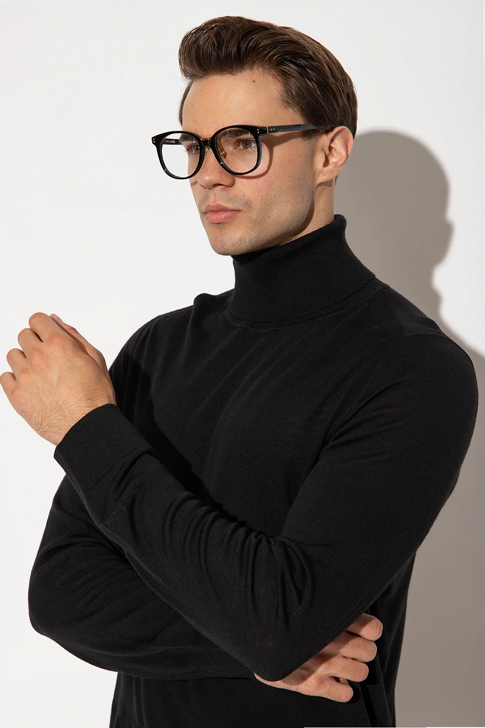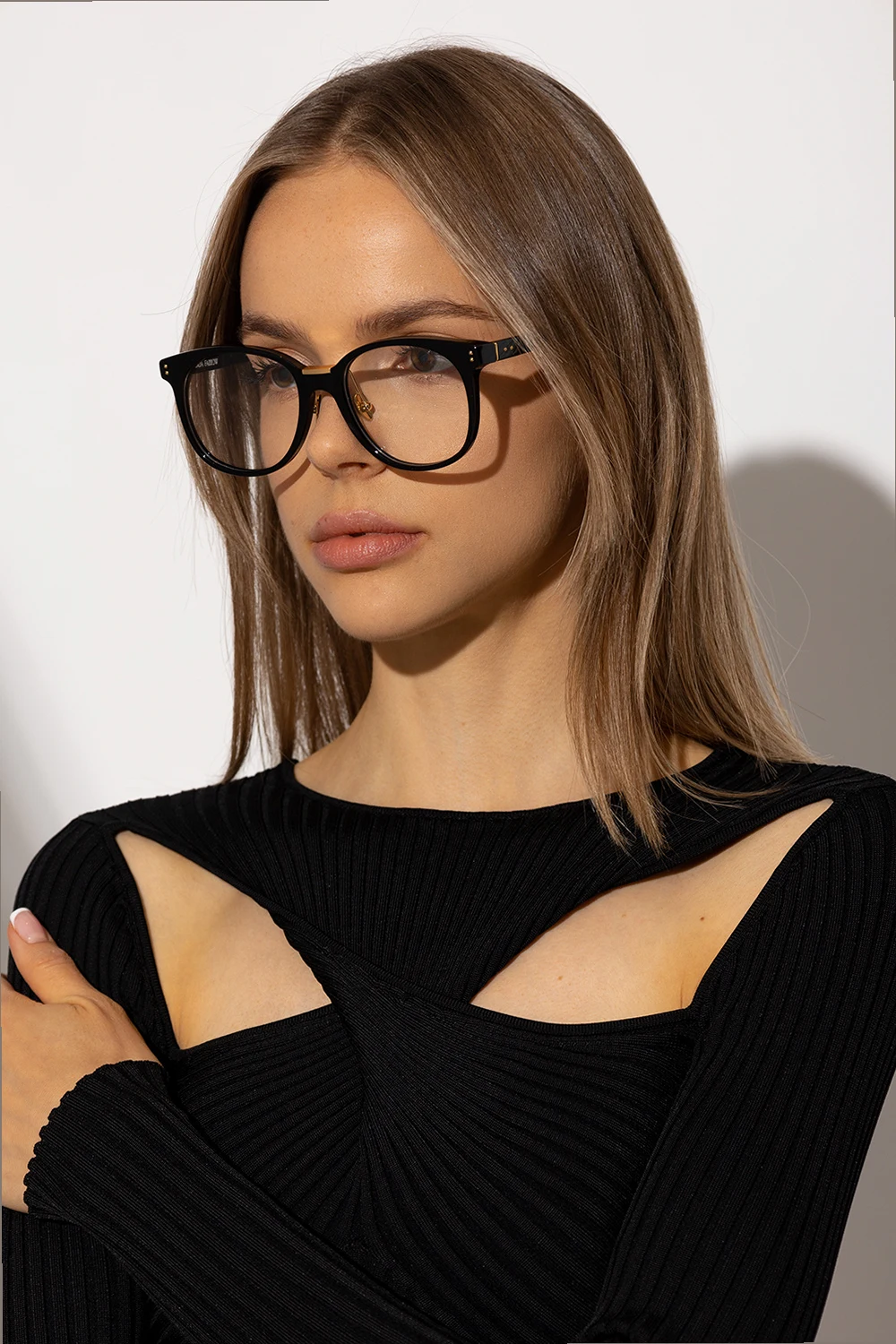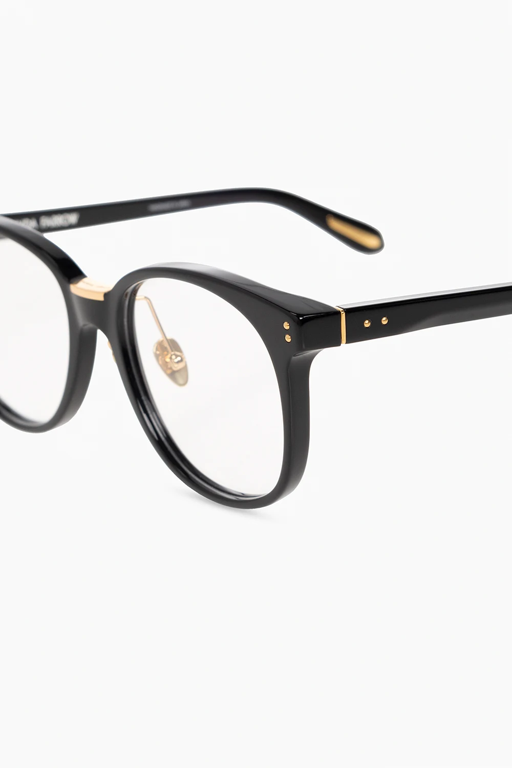 Black ‘Palla’ optical glasses from Linda Farrow. This D-frame design is capped at the nose bridge with carefully engineered 22 carat gold plated titanium nose pads and subtle logo details. Comes with a case. Handcrafted in Japan.