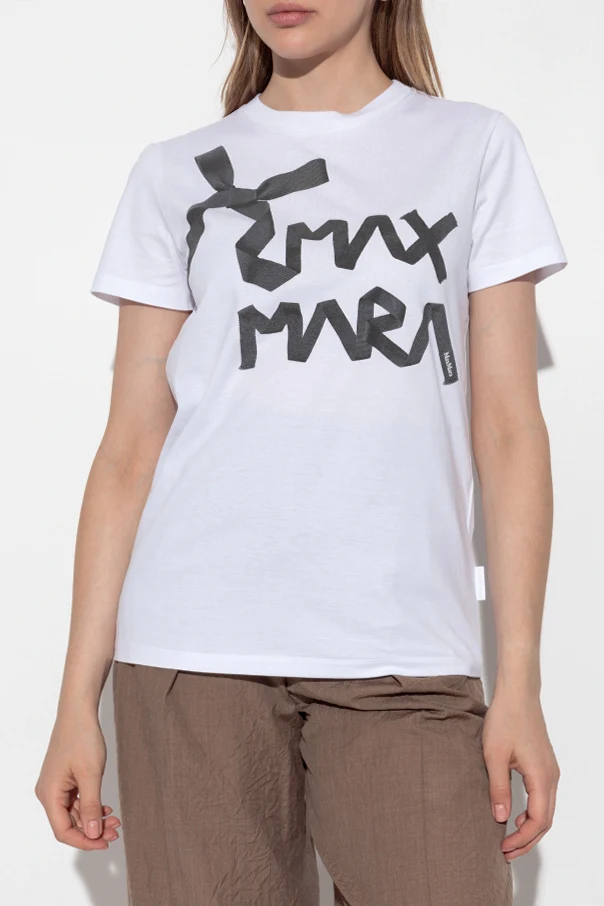 Das T-Shirt ist aus besonders feiner, edler Baumwolle gefertigt, die Atmungsaktivität und eine Weichheit garantiert, die den höchsten Standards der Premium-Mode entspricht. Die Vorderseite ziert ein origineller, grafischer Print mit dem stilisierten Schriftzug „Max Mara“ – künstlerisch inspiriert von handgeschriebener Schrift, wodurch jedes Outfit einen individuellen Charakter erhält.