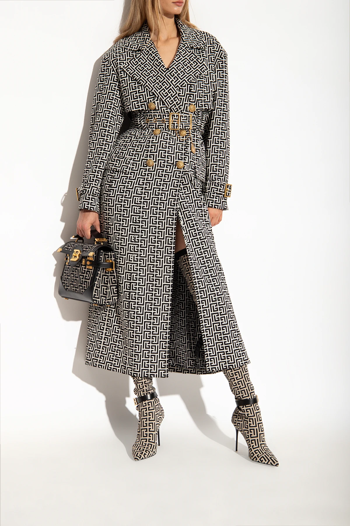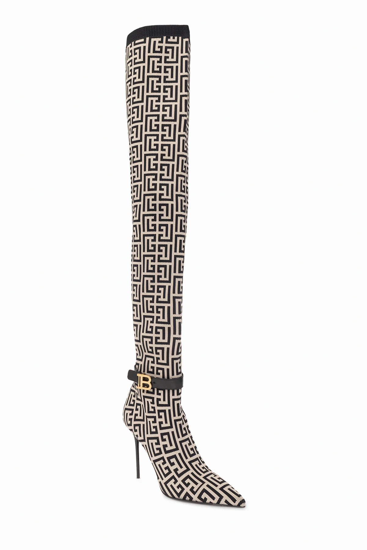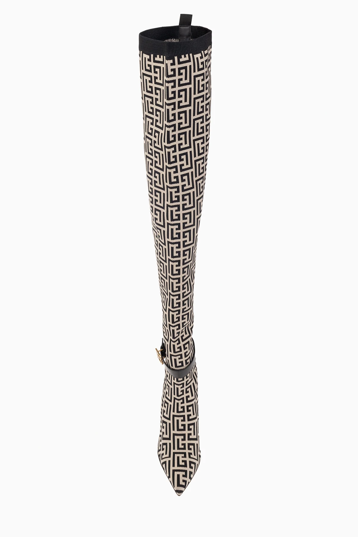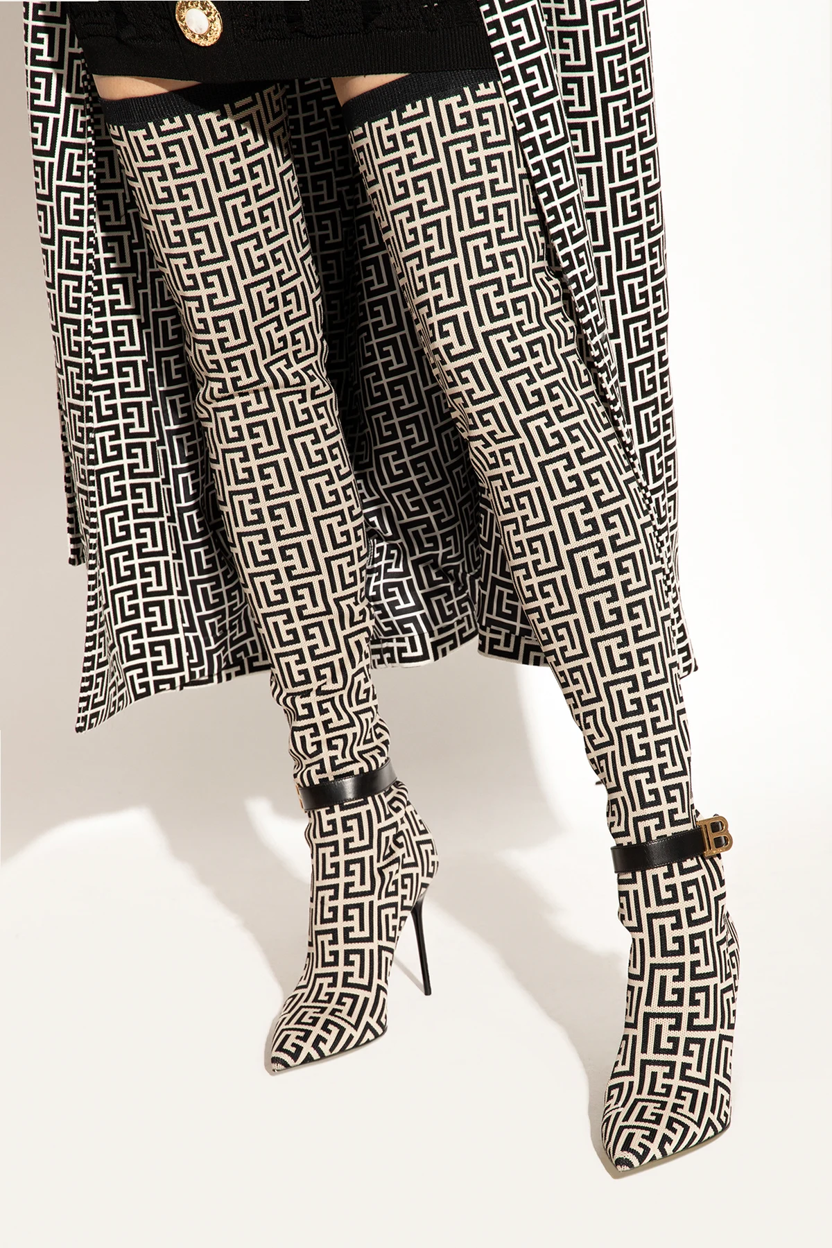 Black and beige ‘Raven’ heeled boots from Balmain. Crafted from knitwear with leather trims, this design features a jacquard monogram pattern, adjustable ankle strap with a decorative metal logo buckle, pointed toe and black leather sole.