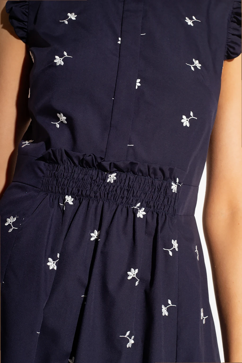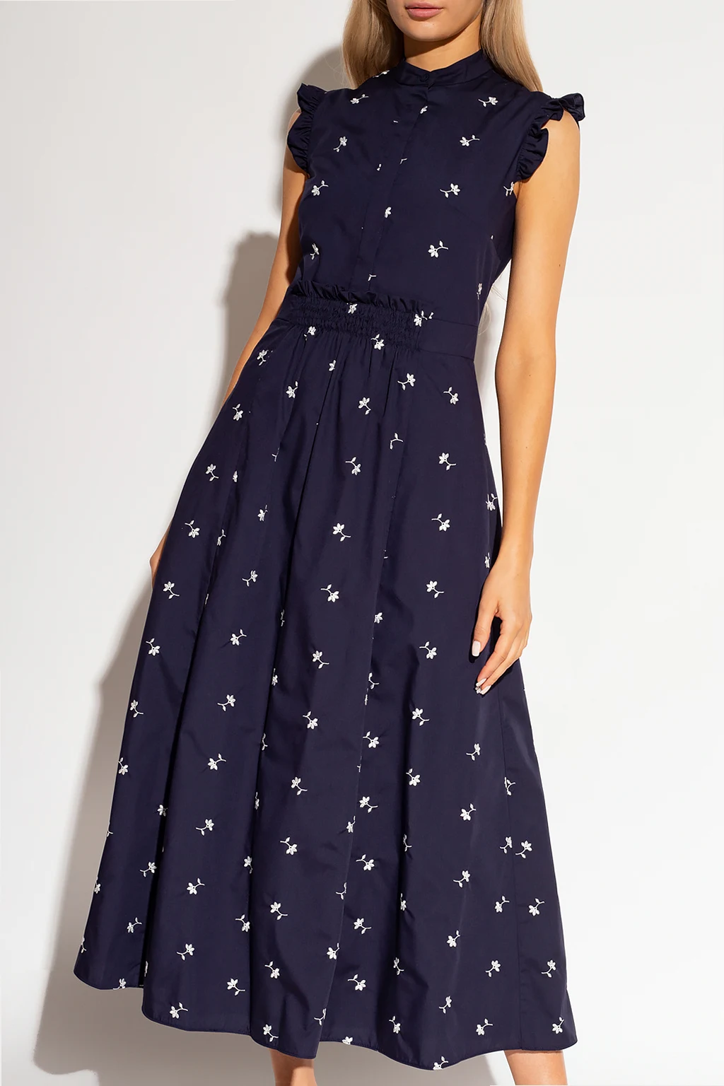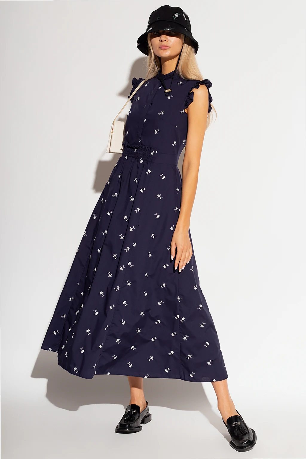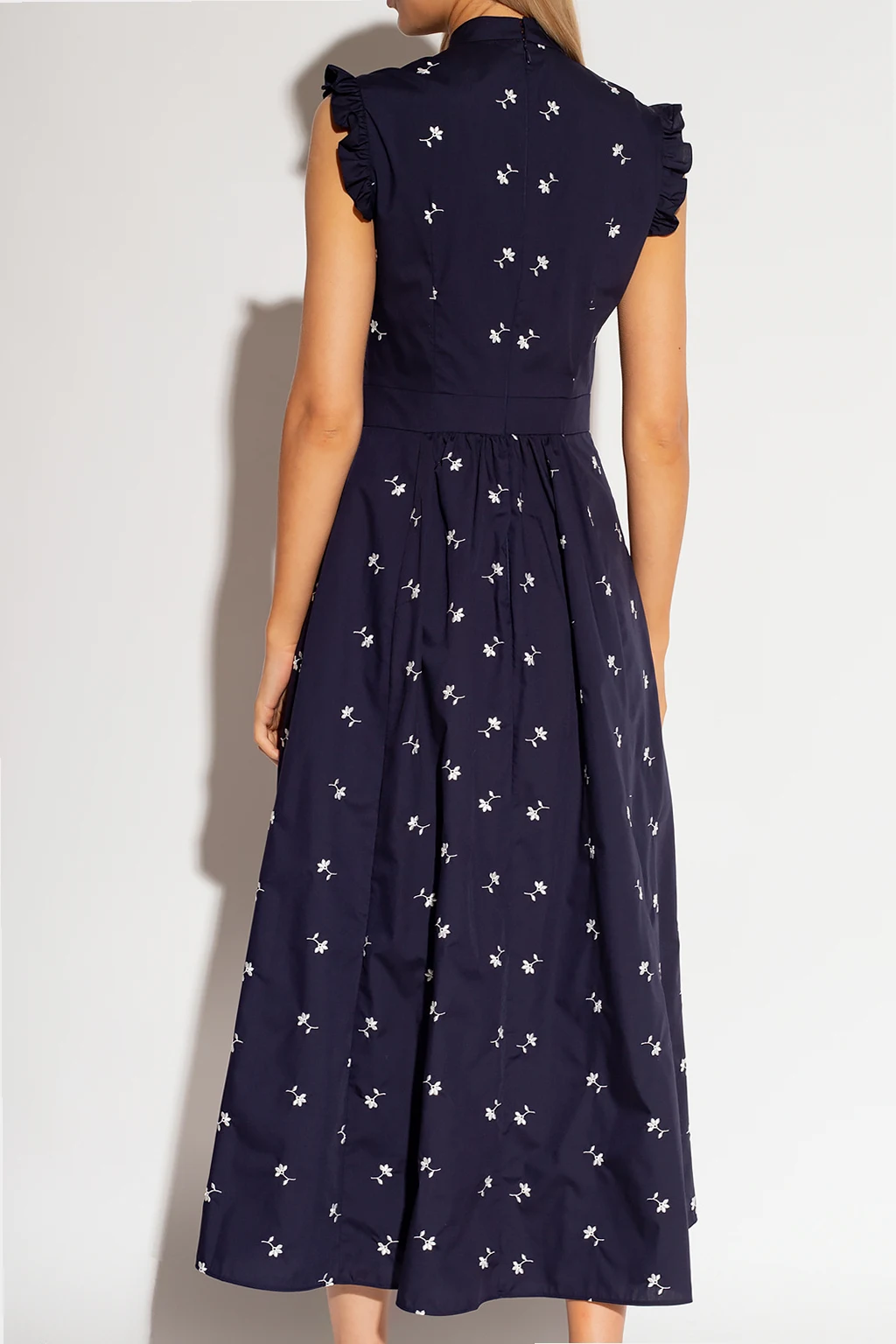Navy blue ‘Evie’ dress from Erdem. Cut from cotton poplin embroidered with a white ’Ditsy’ floral motif, this style features a a back zipper with buttons at the back, a mock neck with concealed buttons and ruffled trims on the shoulders. Fitted at the waist, it is complete with a flared midi skirt with two slip pockets.
