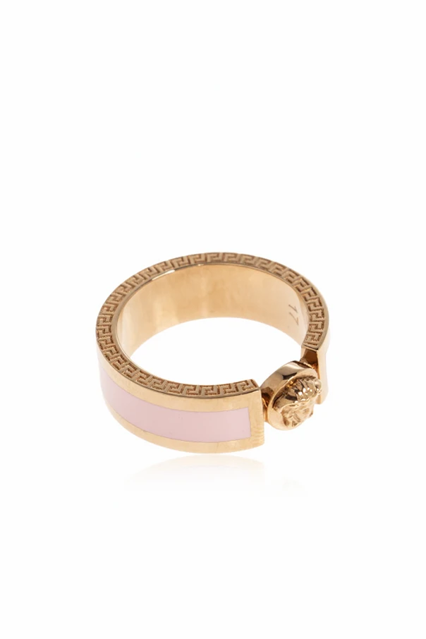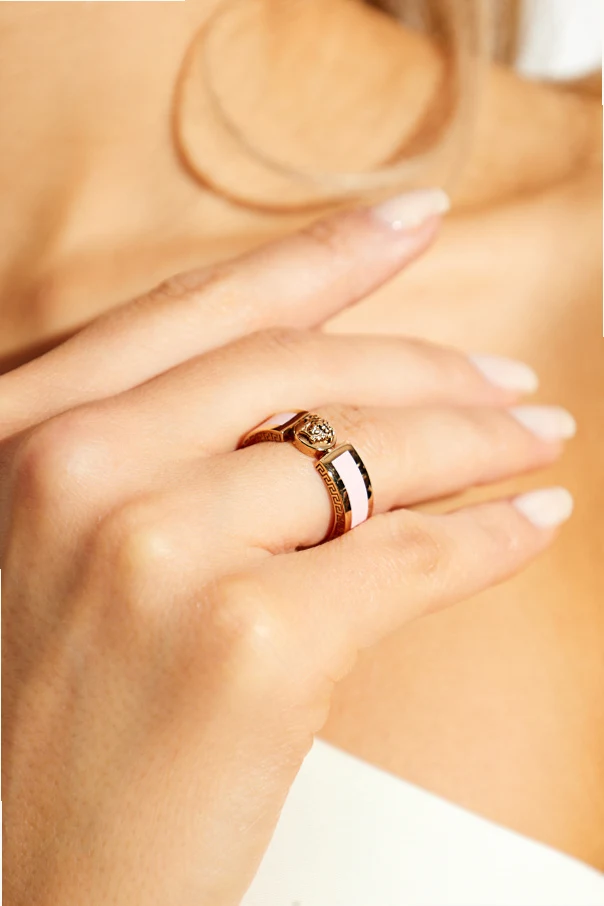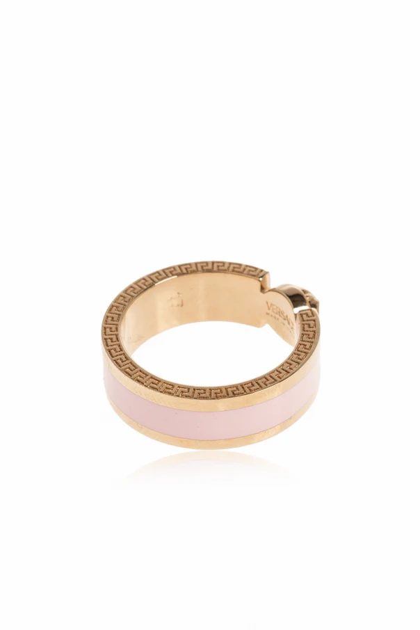 Das rosa Emaille-Panel umrahmt den Ring und harmoniert perfekt mit dem Finish in Goldton. Auf den Rändern des gesamten Designs befindet sich ein präziser griechischer Mäander, der den luxuriösen Charakter des Schmuckstücks vollendet. Der verwendete Messing sowie höchste Verarbeitungsqualität garantieren Haltbarkeit und einzigartigen Glanz, wie sie für Versace-Kreationen typisch sind.