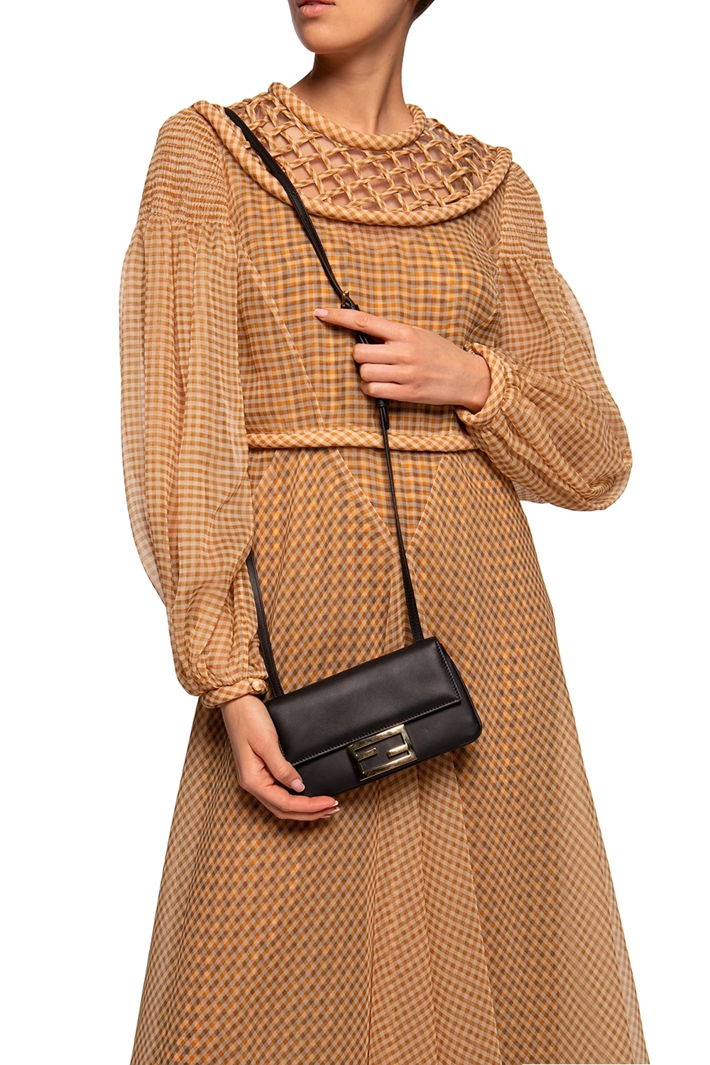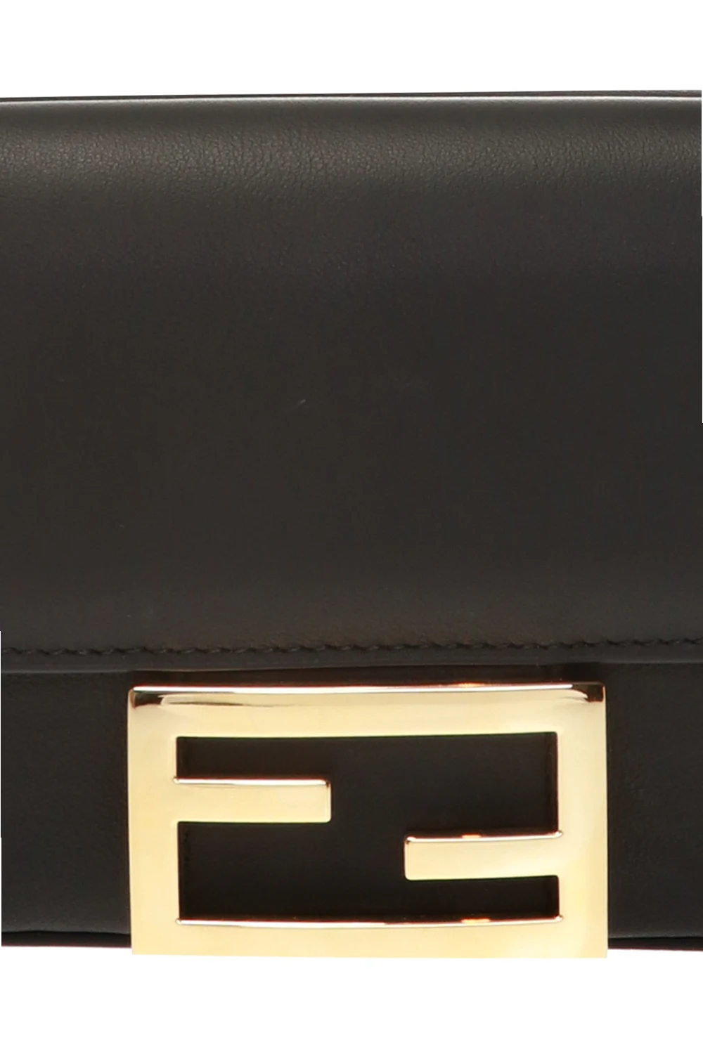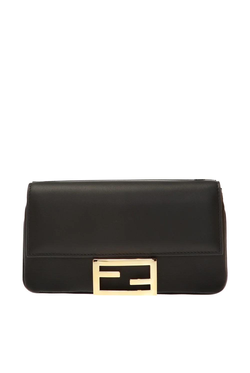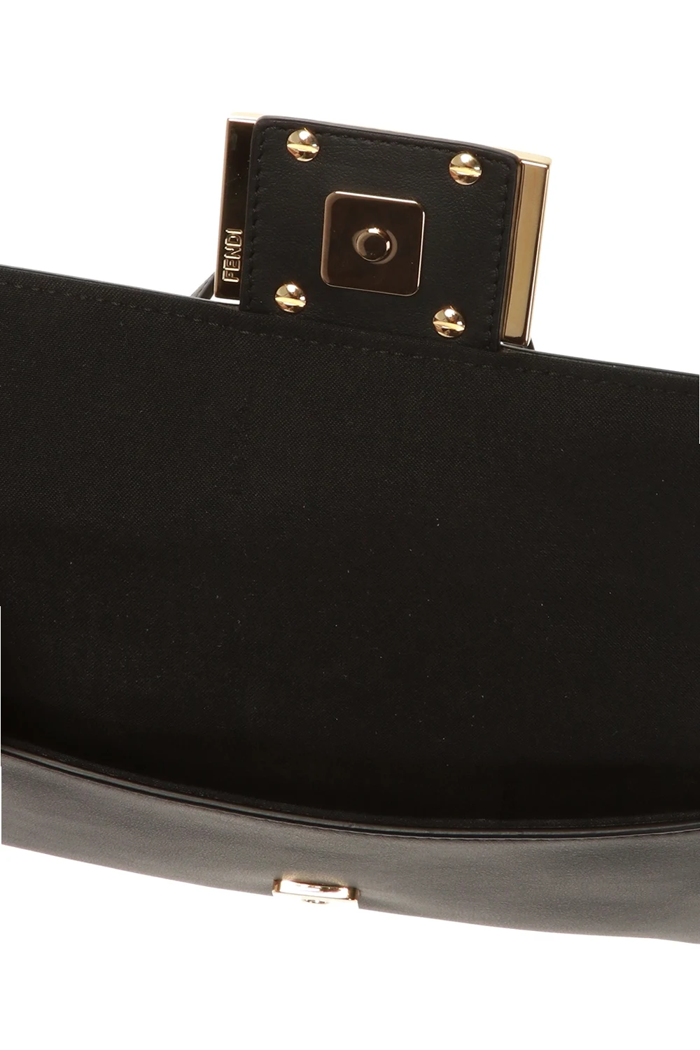 Black reversible shoulder bag from Fendi. Made of calf leather. Features an antiqued gold-tone fastener with logo, a detachable and adjustable shoulder strap as well as black, lined interior with two separate compartments and three card slots inside.