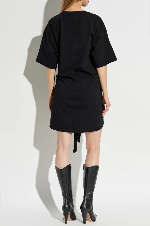 In einheitlichem Schwarz, ohne sichtbare Muster, erhält das Kleid einen besonderen Charakter durch breite Bänder, die effektvoll in der Taille gebunden werden können und so die Figur vorteilhaft betonen. Abgerundet wird das Design durch das dezente, gestickte Designer-Logo in Form einer Ellipse mit dem Buchstaben „H“, das sich direkt am Ausschnitt befindet. Dieses Kleid ist ein exzellentes Beispiel für die Harmonie zwischen Schlichtheit und raffinierter Form.