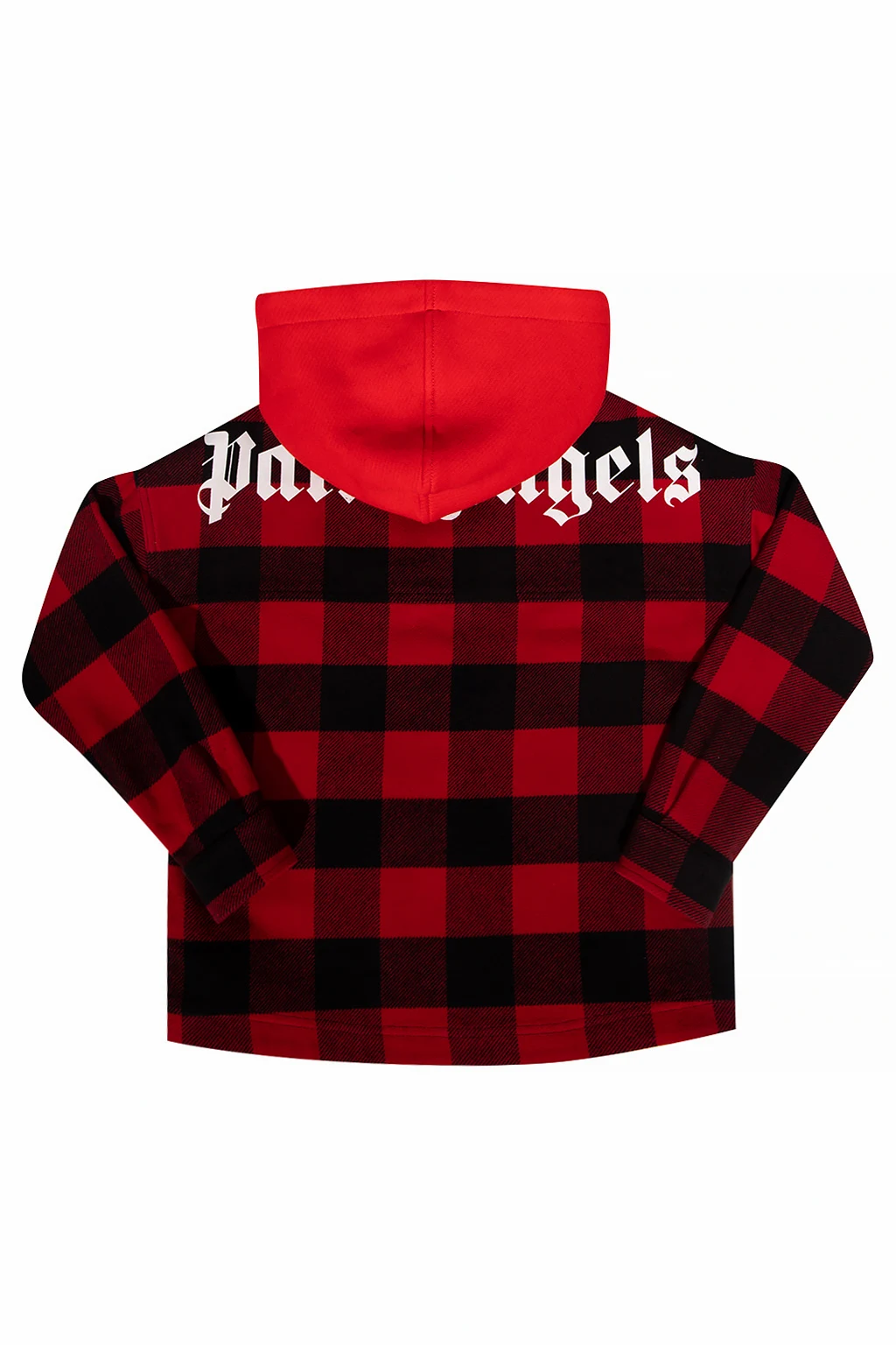 Black and red jacket from Palm Angels Kids. Made of checked cotton, this style features snap fastening, a detachable hood and long sleeves with snap closures on the cuffs.