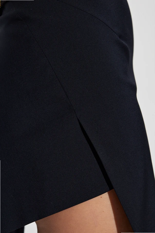 Wollrock von Vivienne Westwood präsentiert eine raffinierte Interpretation femininer Eleganz. Im tiefen Navyton gehalten, besticht er durch einen kurzen, modernen Mini-Schnitt mit einem markanten, asymmetrischen Saumabschluss. Die minimalistische, einfarbige Silhouette ohne sichtbare Verzierungen oder Logos unterstreicht dezent die meisterhafte Schneiderkunst sowie die hohe Qualität der glatten, weichen Wolle, die sowohl Komfort als auch eine perfekte Passform gewährleistet.