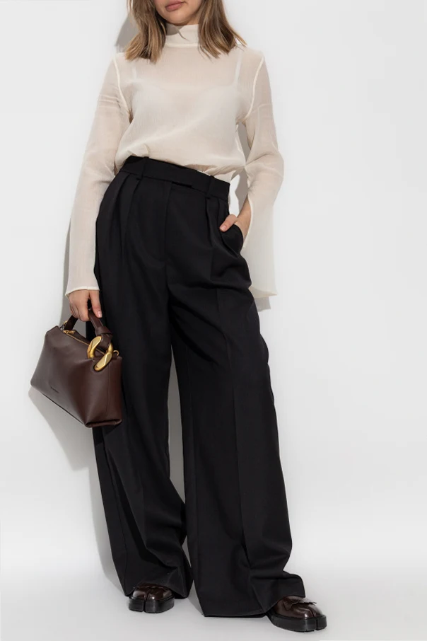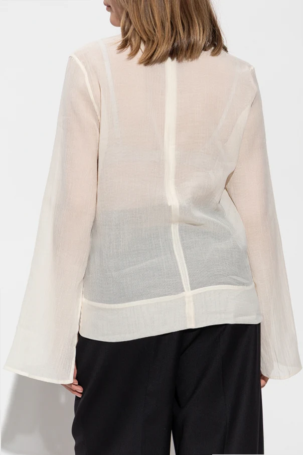 Der gerade, lockere Schnitt wird durch lange, weit ausgestellte Ärmel ergänzt, die die Handgelenke dezent umspielen. Die leicht überschnittene Schulterpartie sowie der weiche Rollkragen, der sanft vom Hals absteht, betonen den minimalistischen Charakter der Bluse und verweisen auf zeitgenössische Ästhetik in ihrer besten Form.