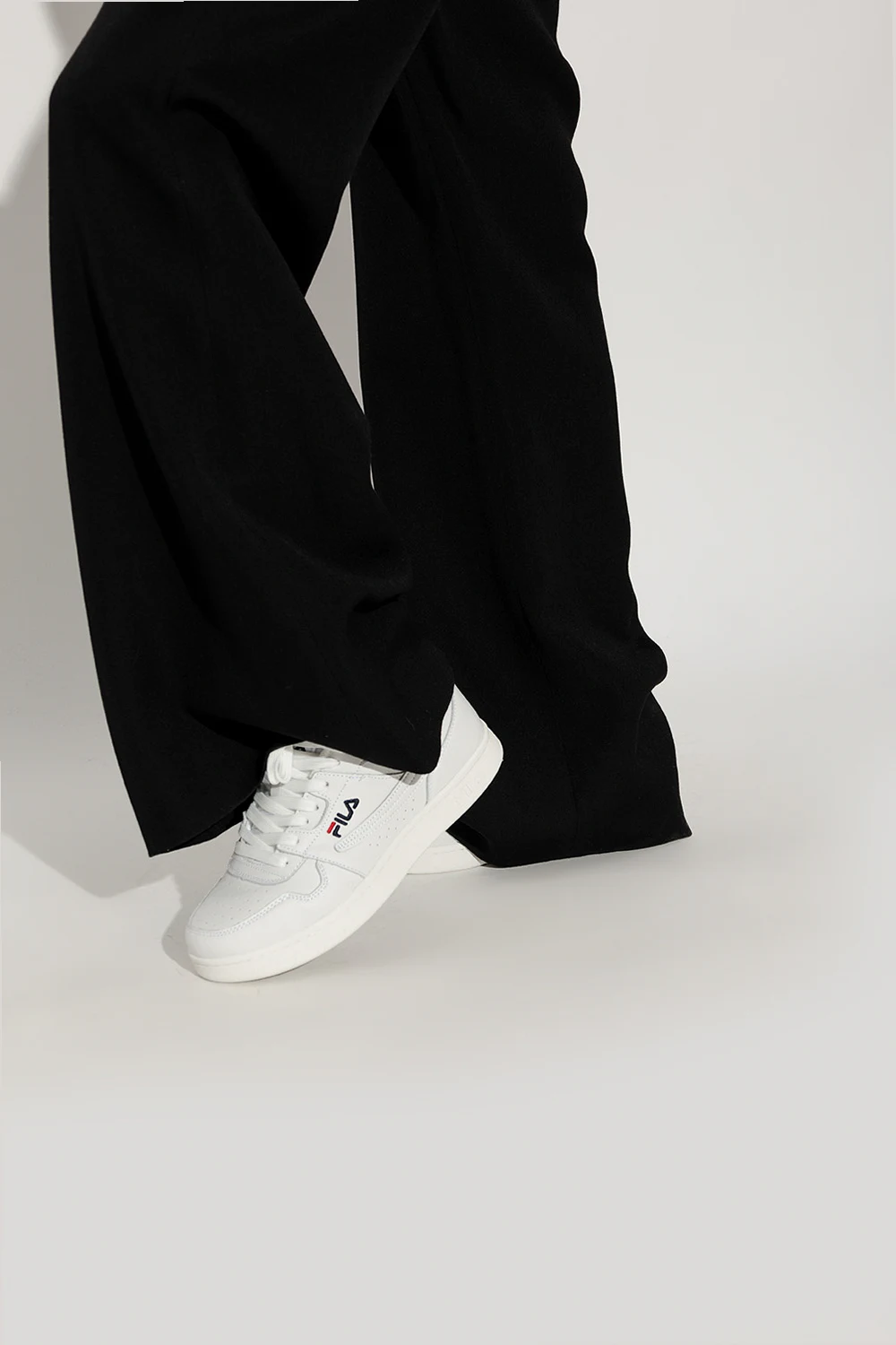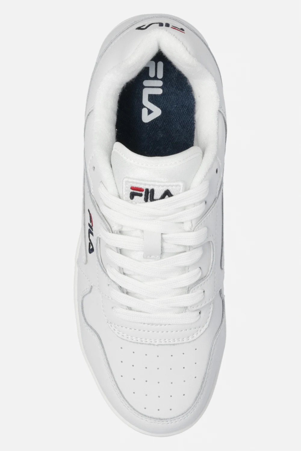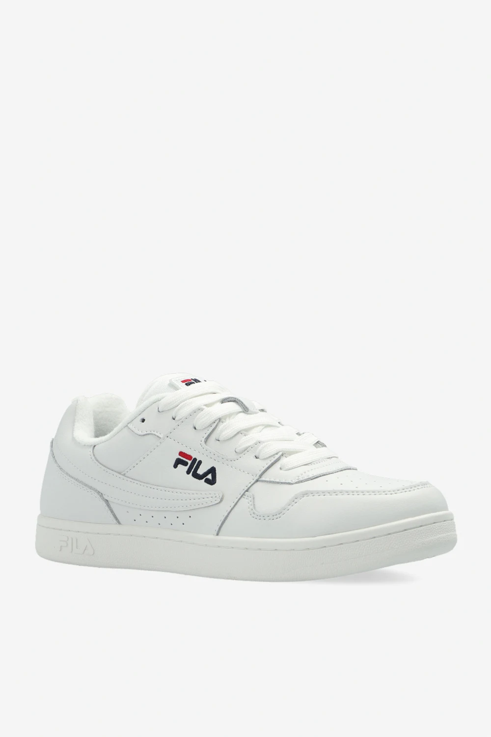 White ‘Arcade’ sneakers from Fila. Crafted from leather, this lace-up model sits on a white rubber sole and showcases an embroidered logo and decorative perforations.