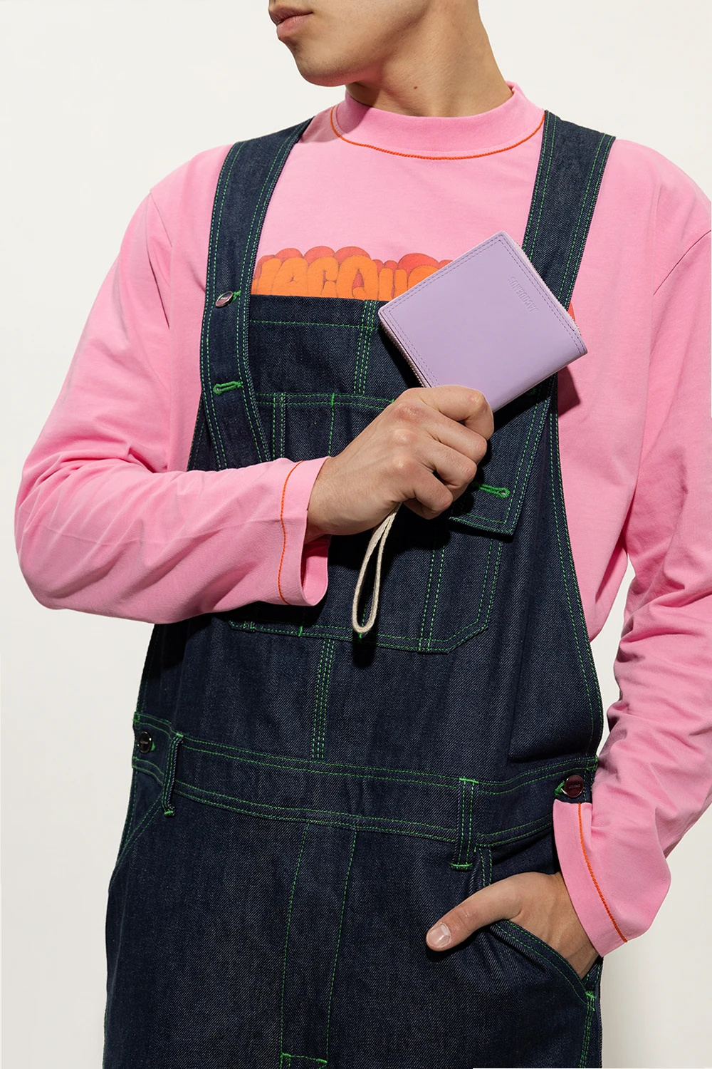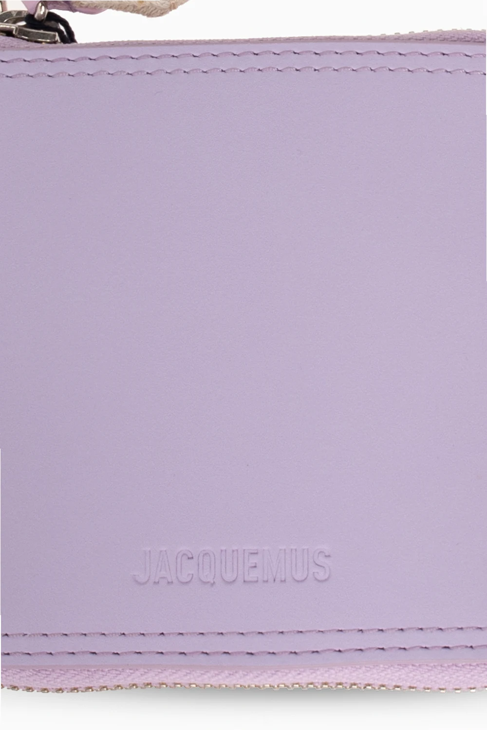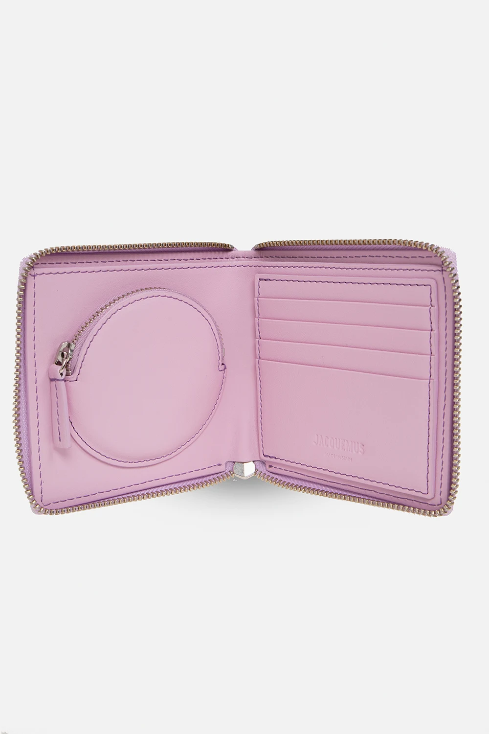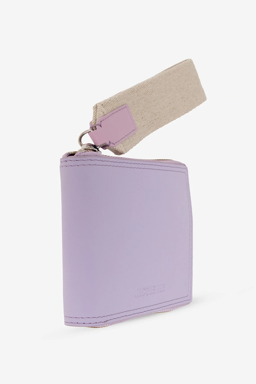 Light purple ‘Le Carre Rond’ wallet from Jacquemus. Crafted from leather, this design secures with a zipper with a cream canvas wrist strap and features an embossed logo on the front and a bill compartment, one slip pocket, a round zip coin pocket and four card slots inside.