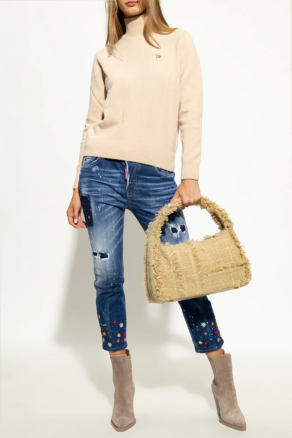 Light beige turtleneck sweater from Maison Kitsune. Crafted from wool, this design features a multicolored Baby Fox logo patch and ribbed trims.