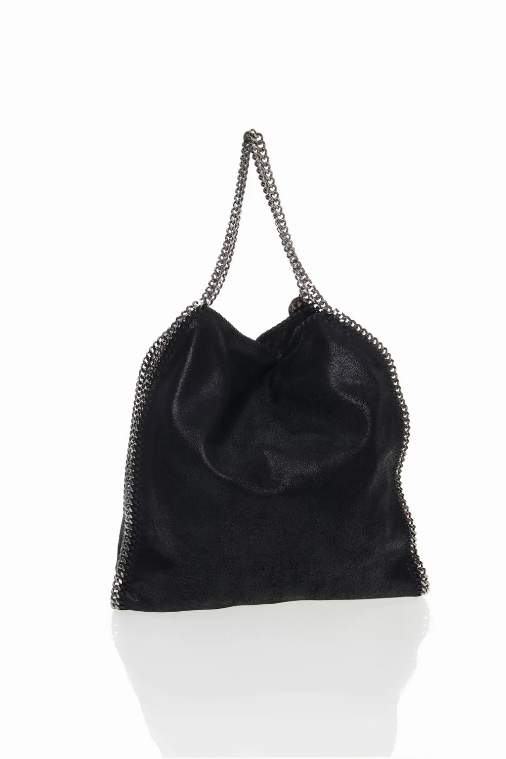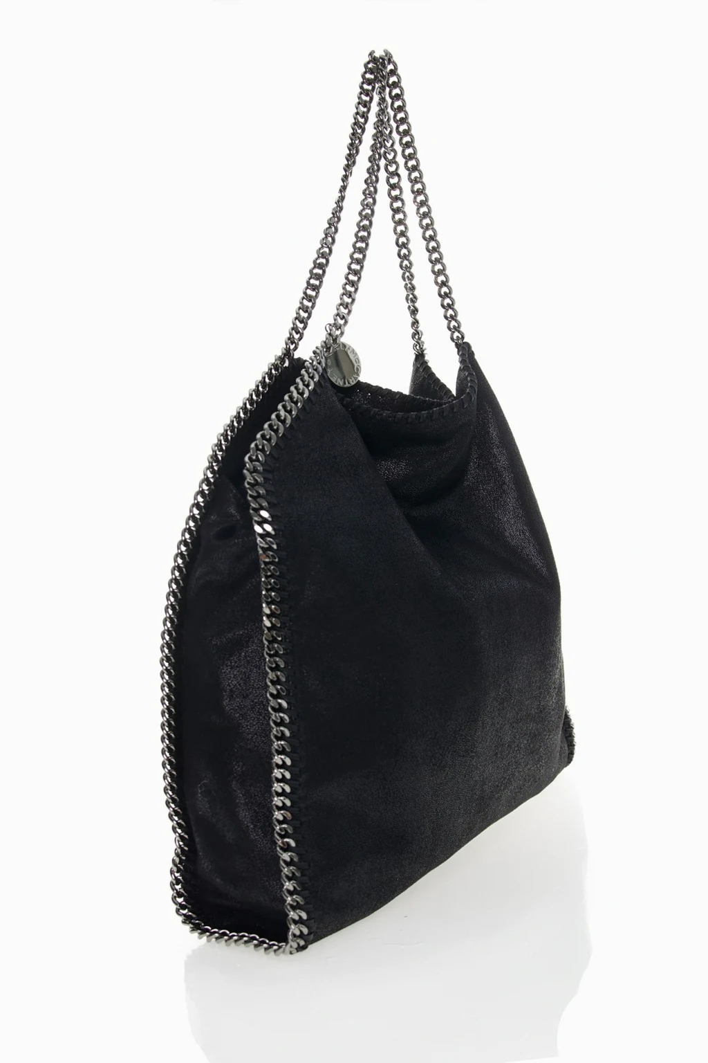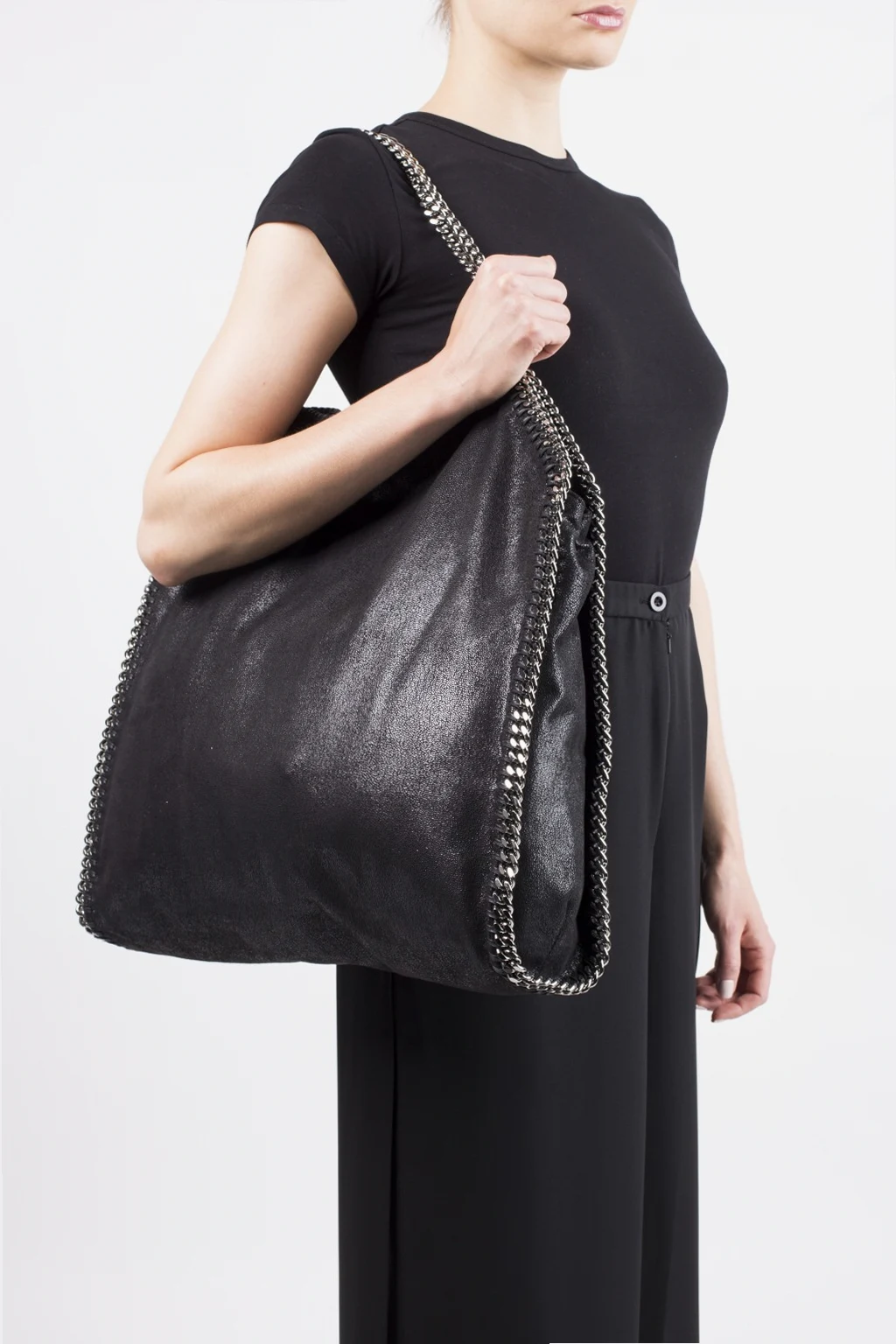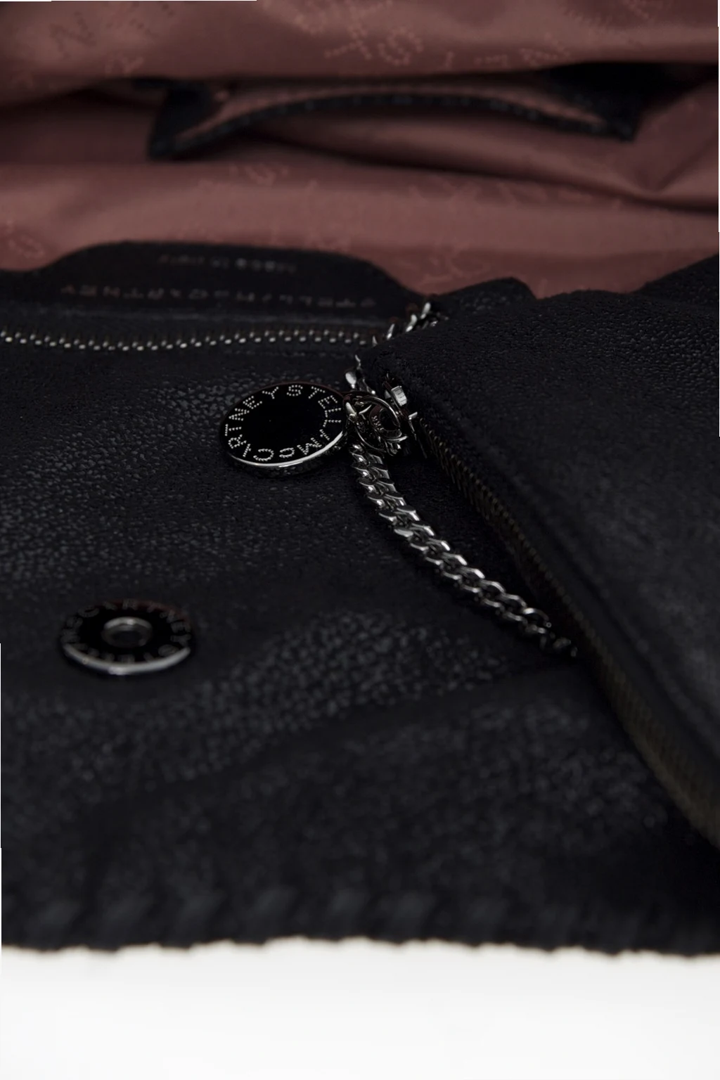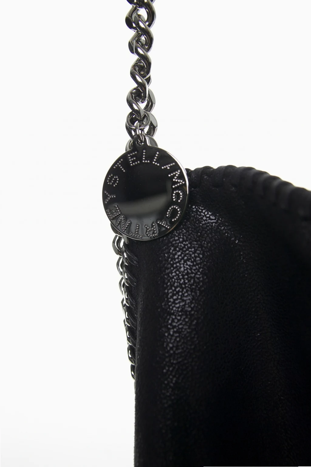 Black textured fabric 'Falabella' shoulder bag from Stella McCartney. Chain finish. Snap fastening. Two long metal silver toned shoulder chains with metal logo.