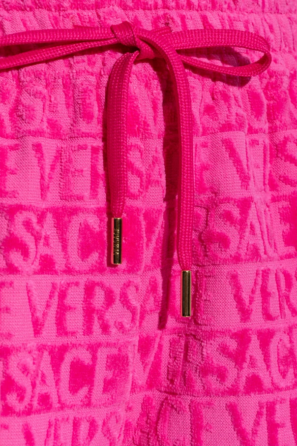 Das gesamte Modell ist aus hochwertiger, weicher Baumwolle mit einer faszinierenden Schlingenstruktur gefertigt, die sich angenehm an die Haut schmiegt. Die intensive, einheitlich leuchtend pinke Farbe unterstreicht den einzigartigen Charakter dieses Designs. Der sich wiederholende geprägte Schriftzug „ VERSACE “ ist eine markante Referenz an die zeitlose Ästhetik der Marke und ihr unverwechselbares Erbe.