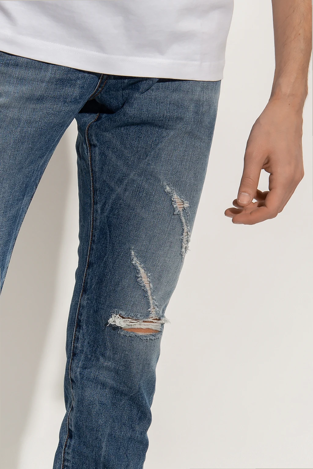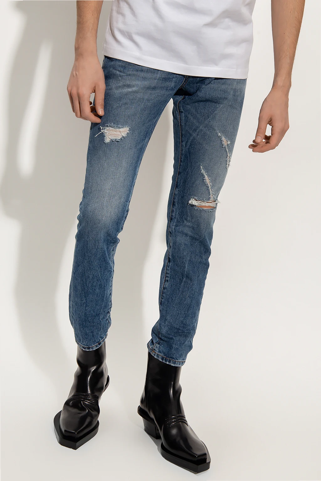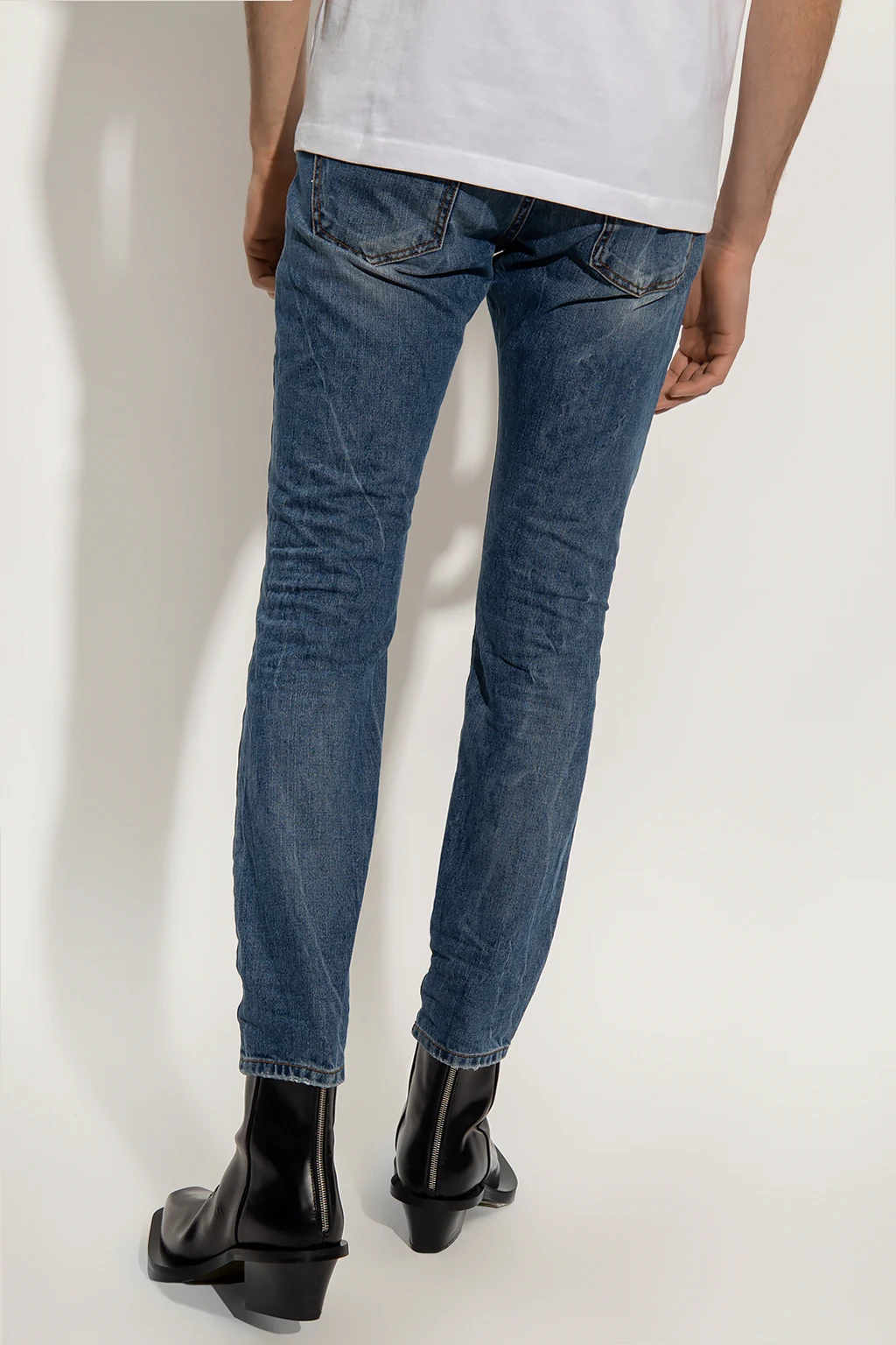 Blue jeans from John Richmond. Made of cotton, this pair falls with slightly tapered legs and features button closures, classic five pockets and a back logo patch.