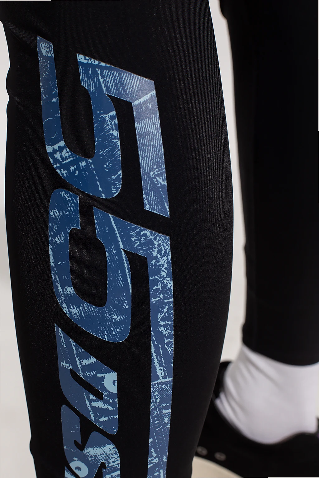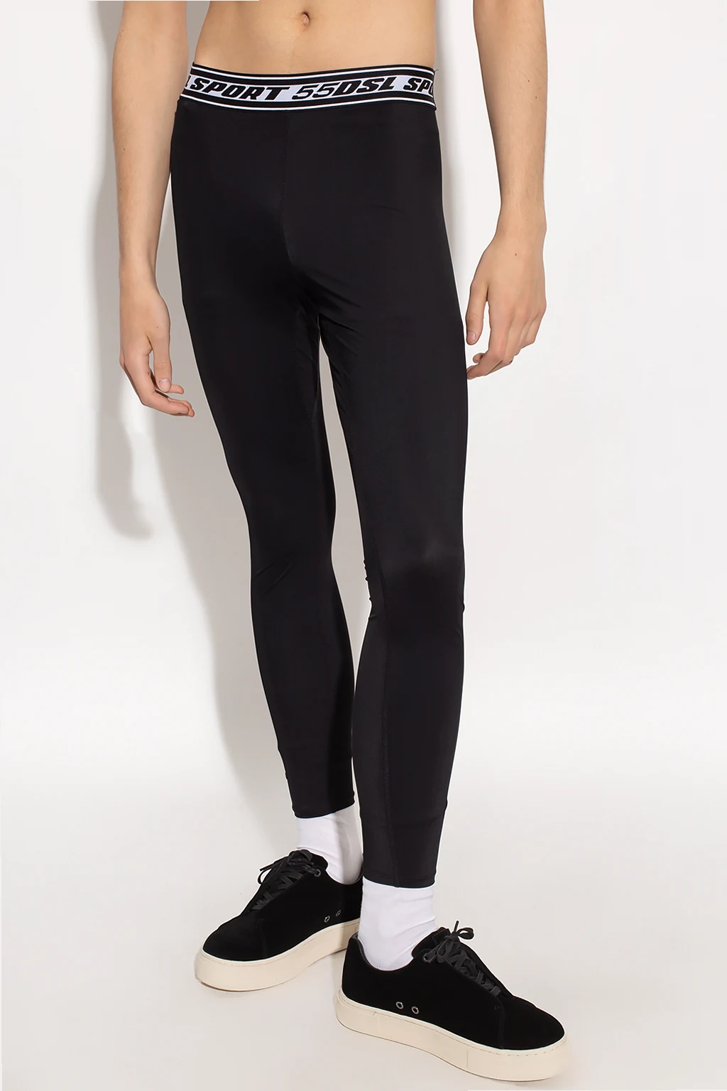 Black 'AMSB-ATTUCK-WT19' training leggings from Diesel, the ‘Sport 55DSL’ collection. Embellished with the brand's 55DSL print in blue denim effect, they feature a drawstring waistband with white logo embroidery and narrow legs.