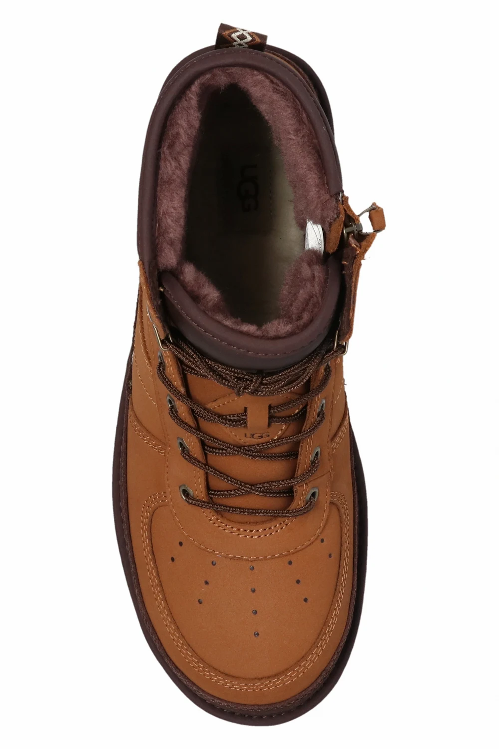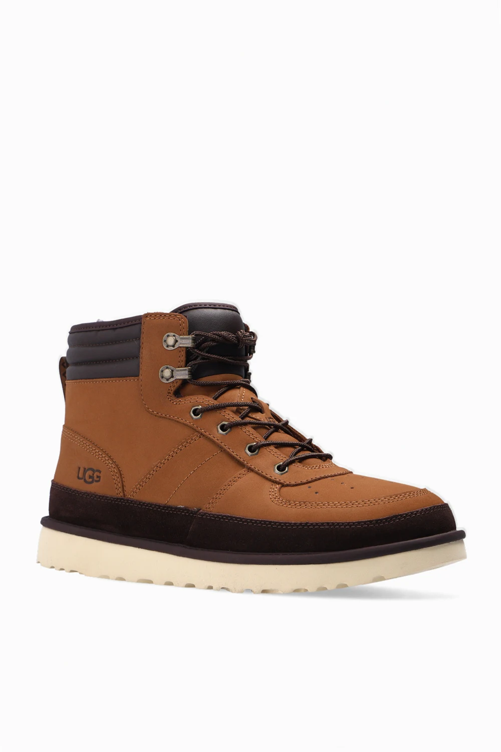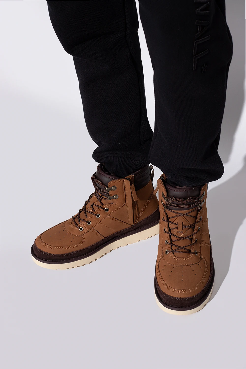 Brown ‘M Highland Sport Ez’ boots from UGG. Crafted from leather and UGGPlush™ - a cozy wool blend fabric patented by the brand, this model features an embossed logo, perforations, faux-fur trims and a cream rubber outsole with Treadlite technology that ensures superb cushioning.