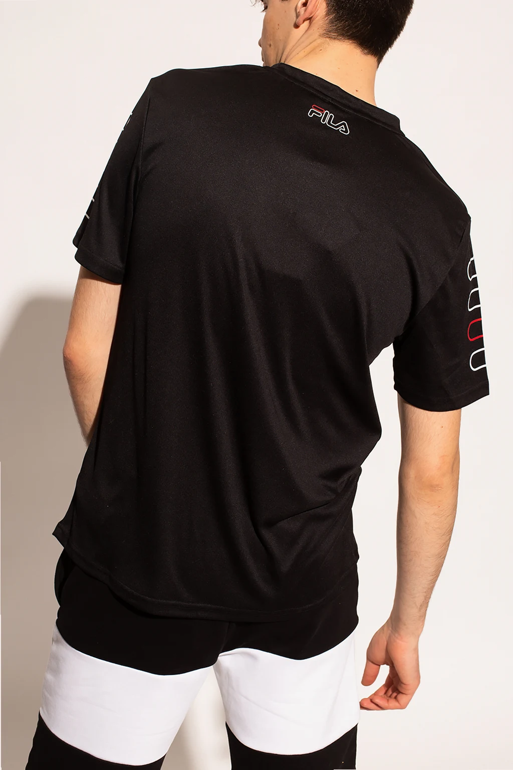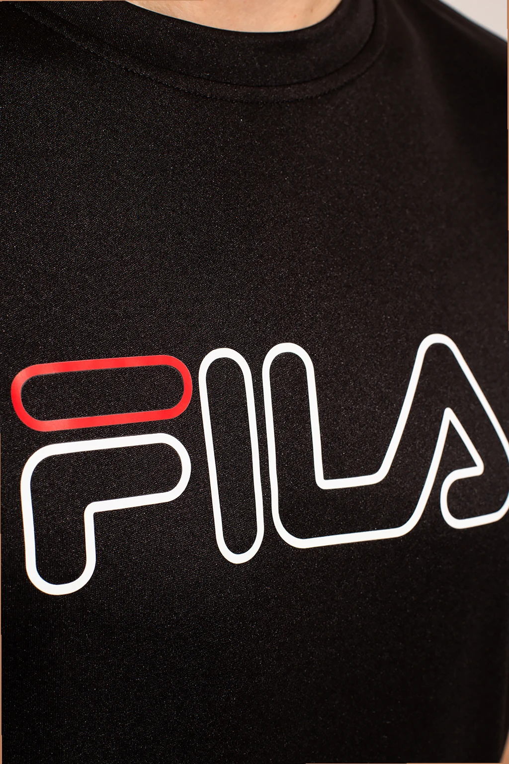 Black crewneck training T-shirt from Fila. Spun from synthetic yarns, this item features a white and red graphic print with the brand's logo.
