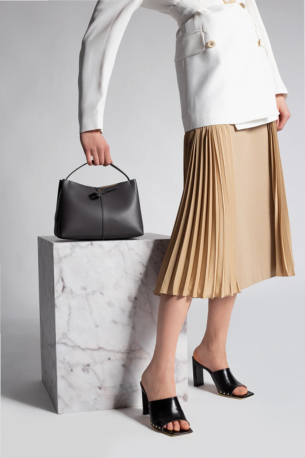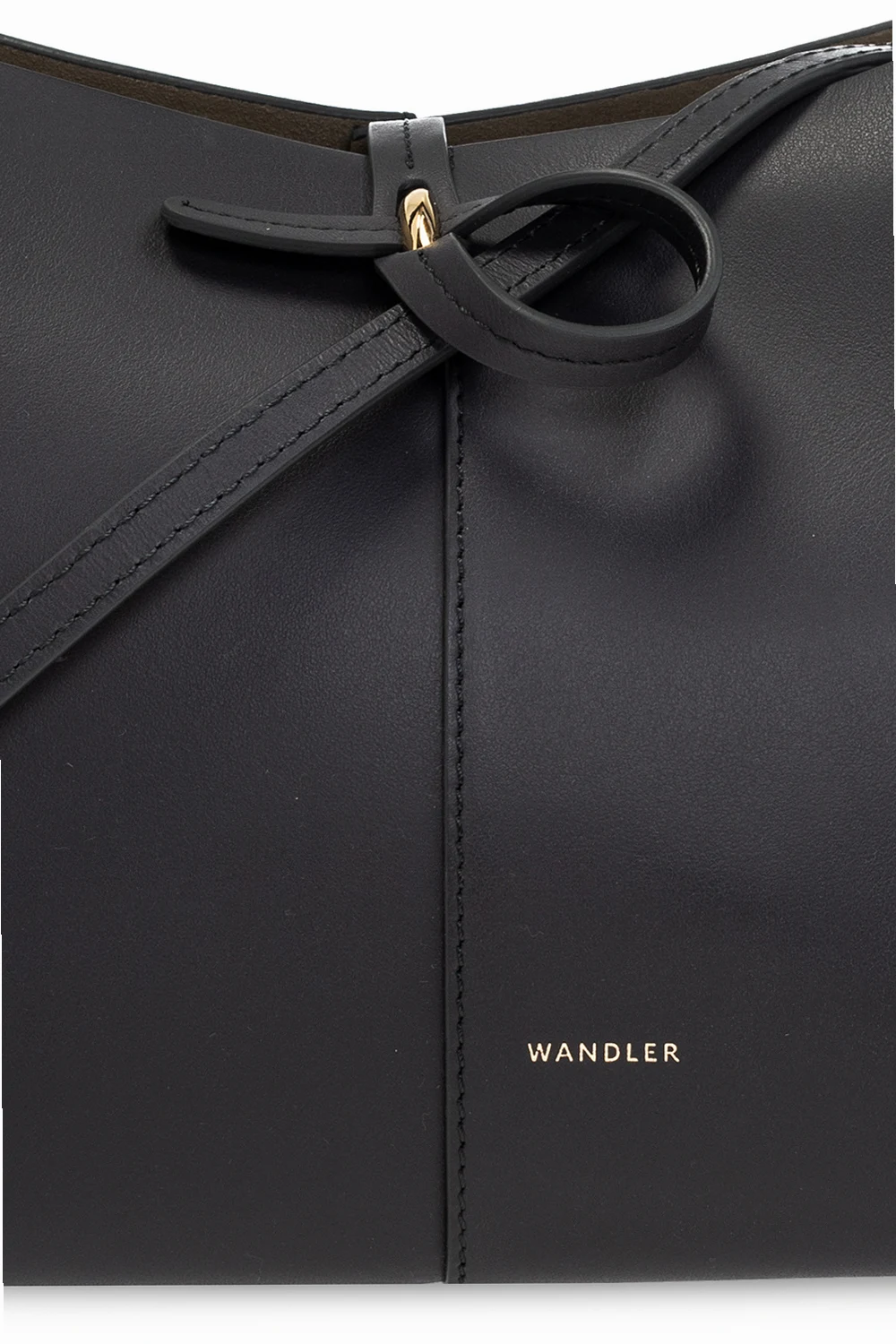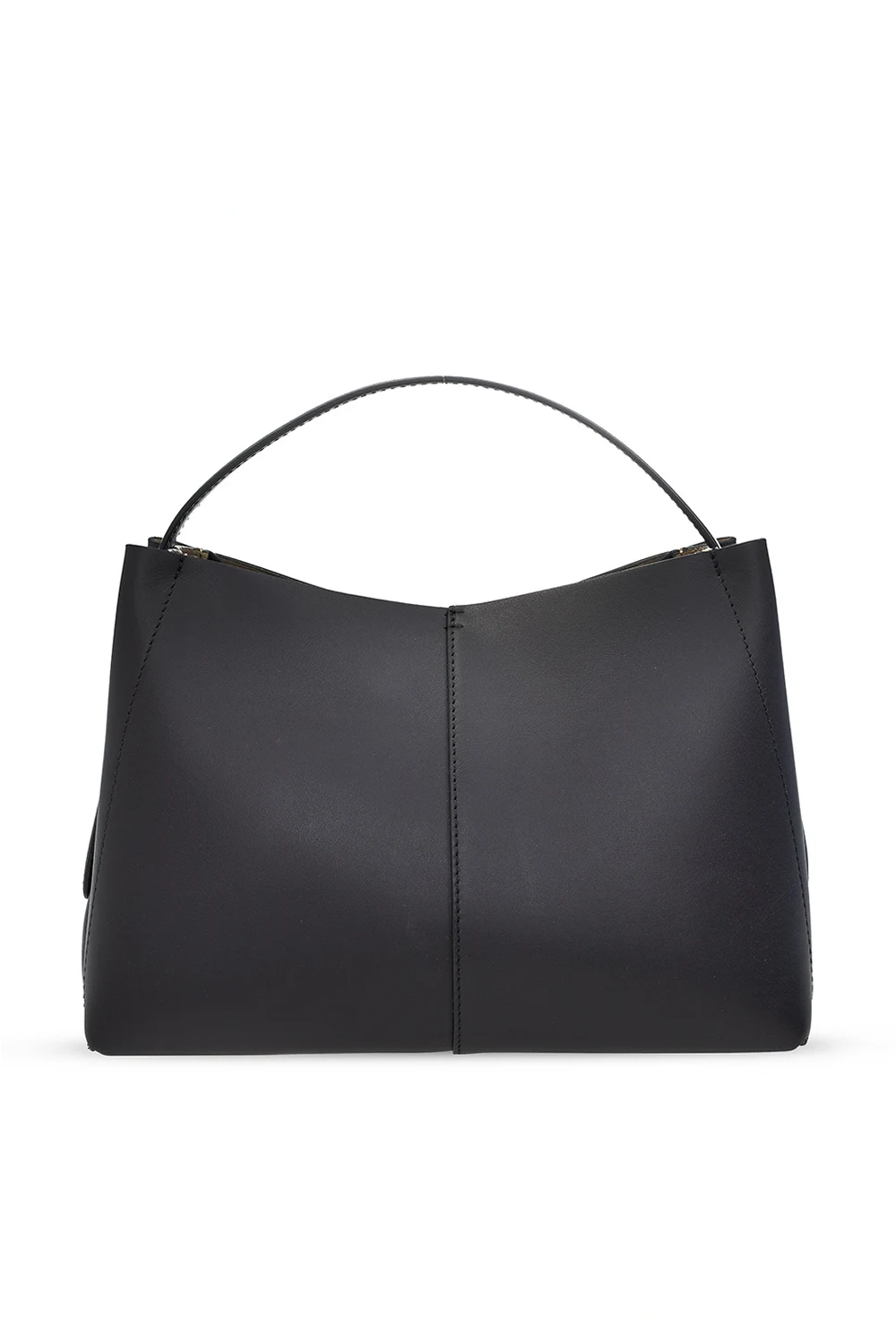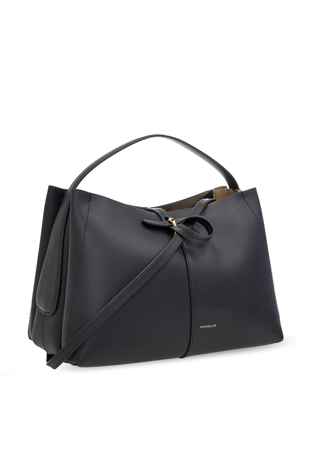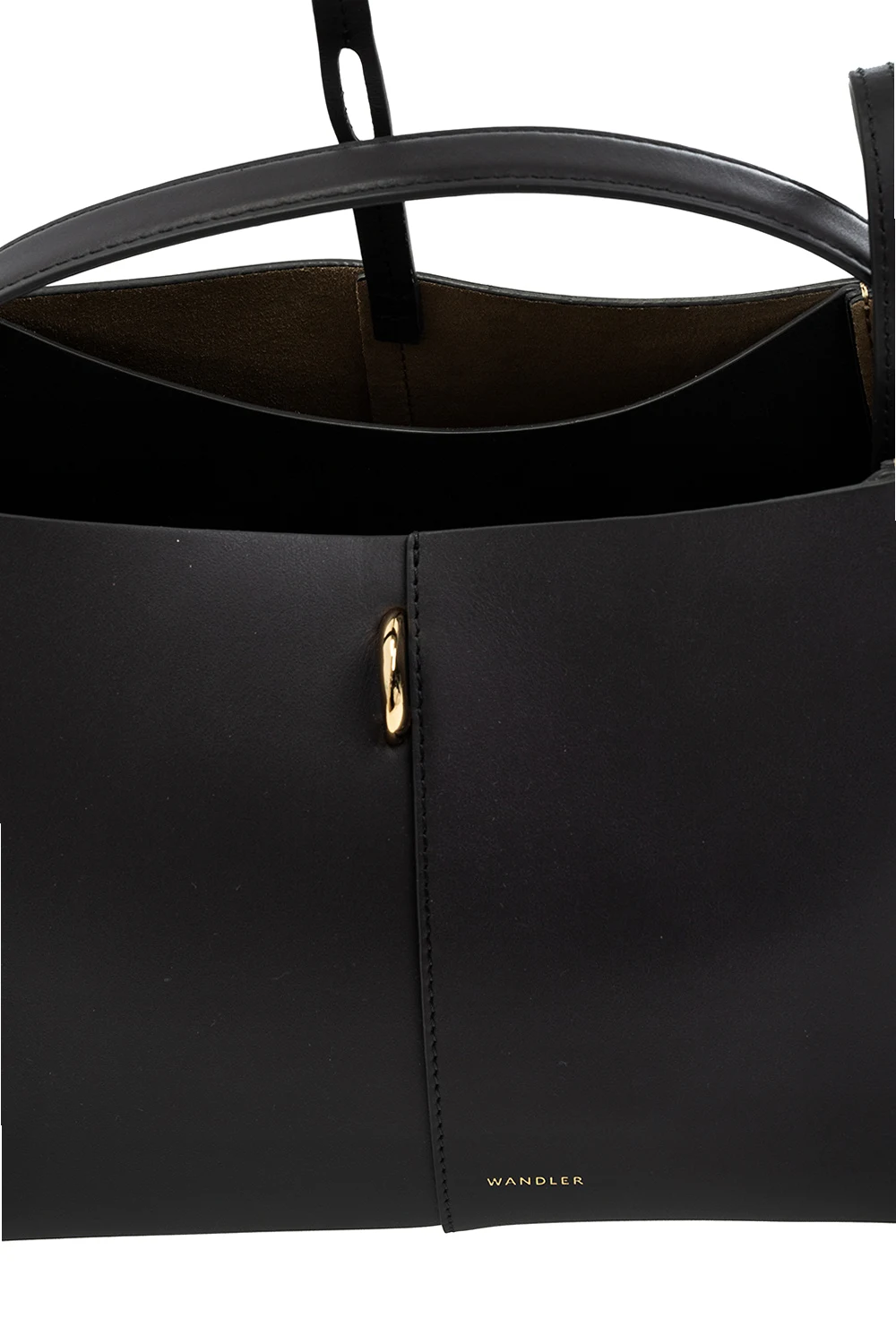 Dark grey ‘Ava’ tote bag from Wandler. Made of calf leather, this design secures with a distinctive slot-tab fastening and showcases a logo print, a half-round handle, a detachable and adjustable shoulder strap, gold-tone metal hardware and one internal compartment with two slip pockets.