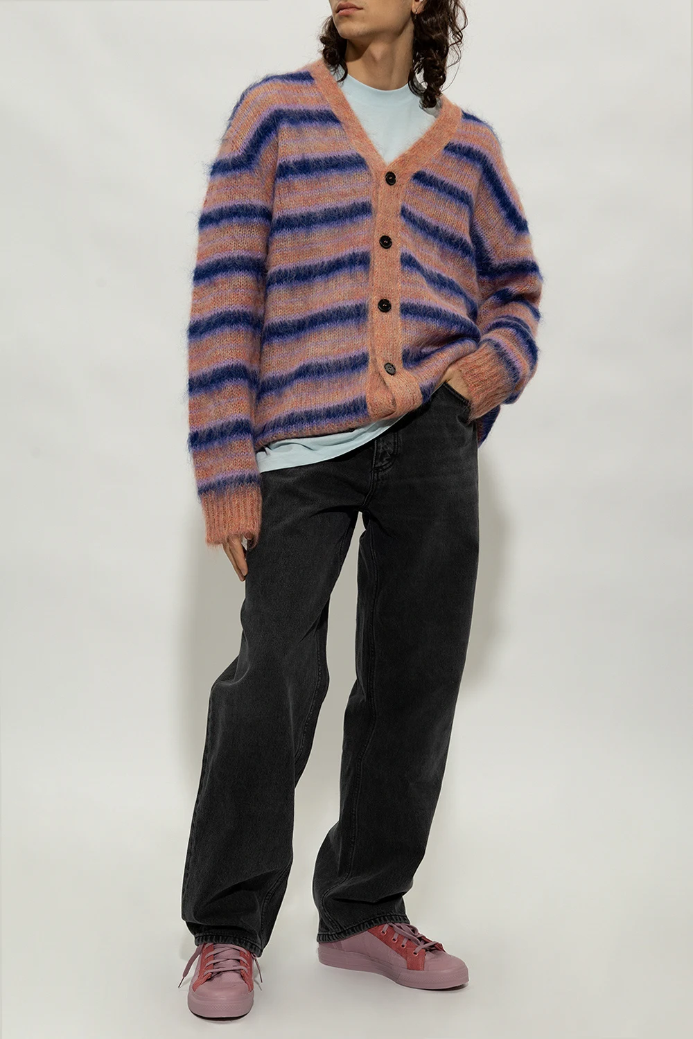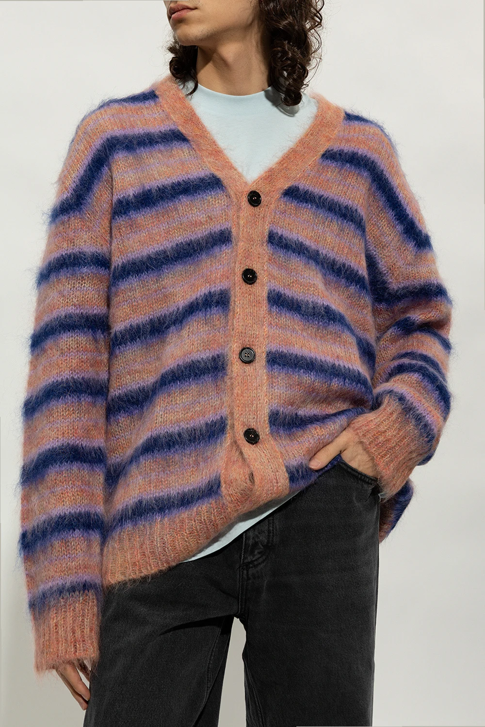 Multicoloured cardigan from Marni. Crafted from a mohair blend, this style showcases a stripe pattern, a V-neckline, button fastenings, long sleeves and a ribbed collar, bottom hem and cuffs.