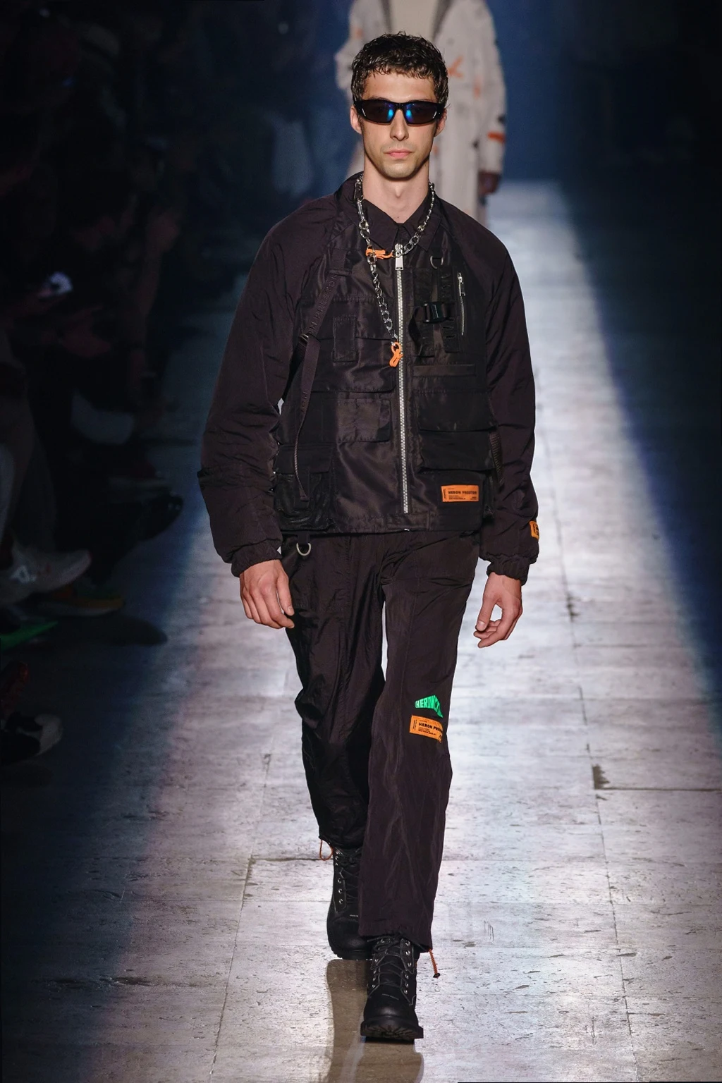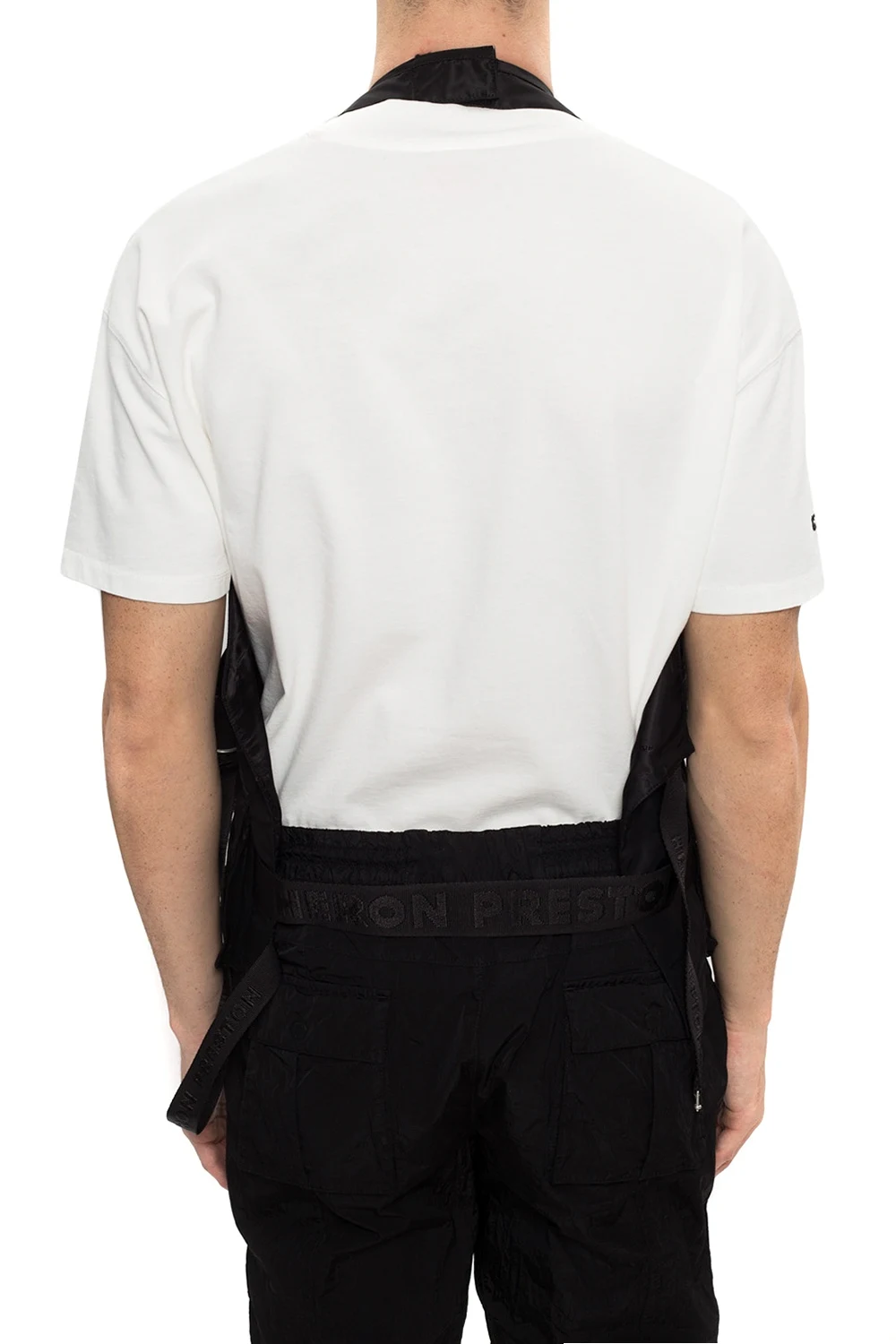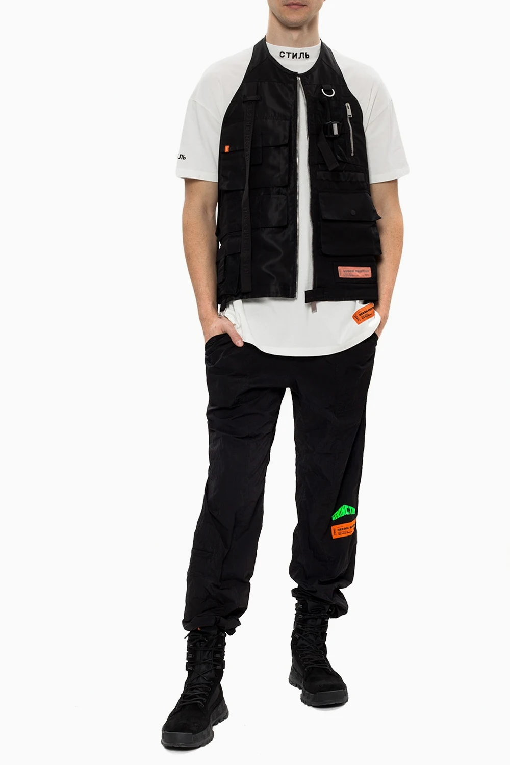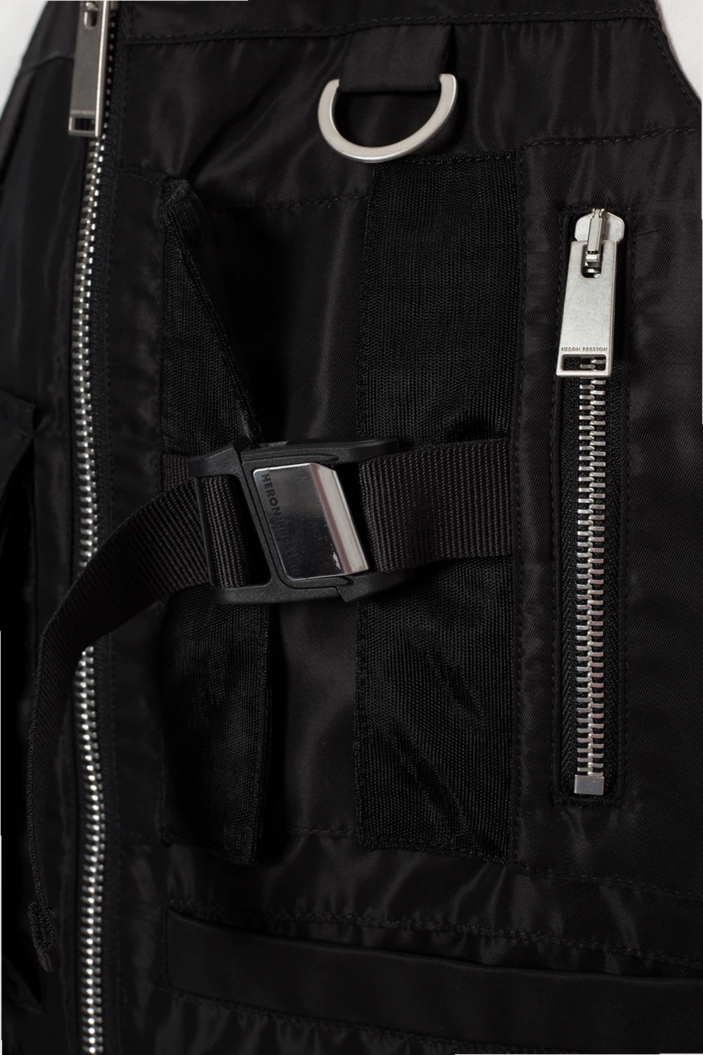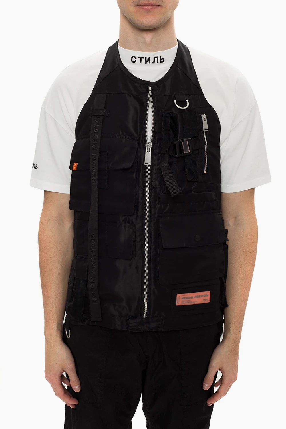 Black vest with an open back from Heron Preston. Fastened with zip on the front and velcro at the neck. 6 pockets and an orange logo insert in black on the front. Grosgrain strap at the back.