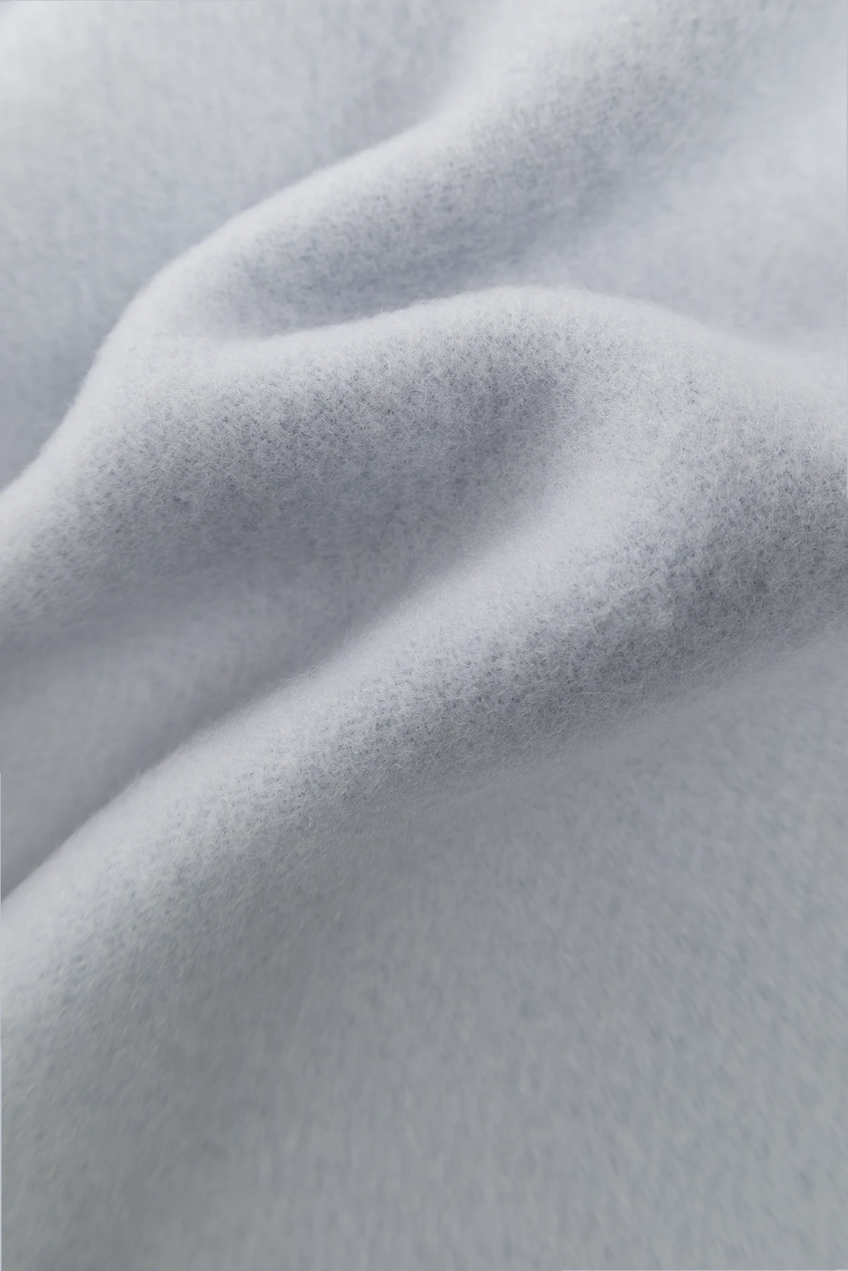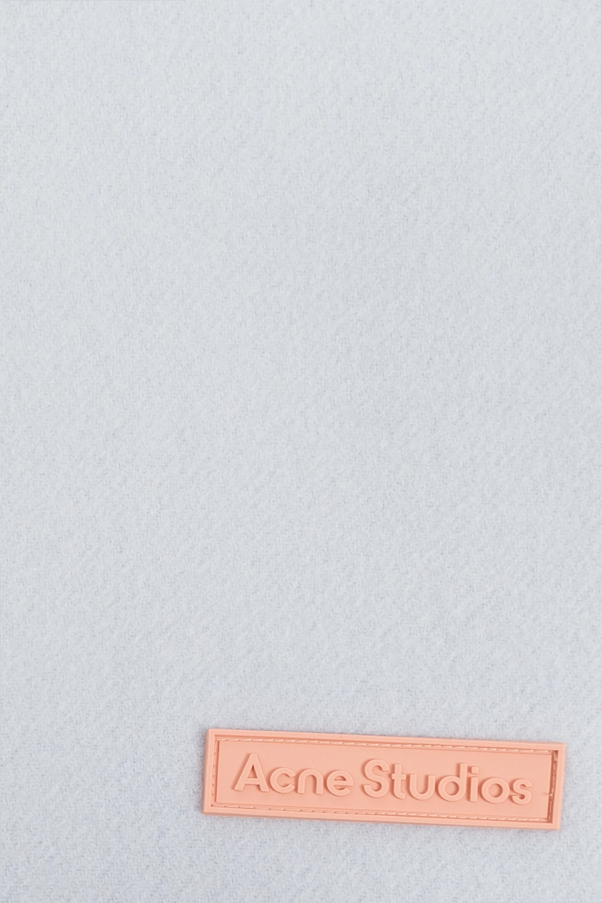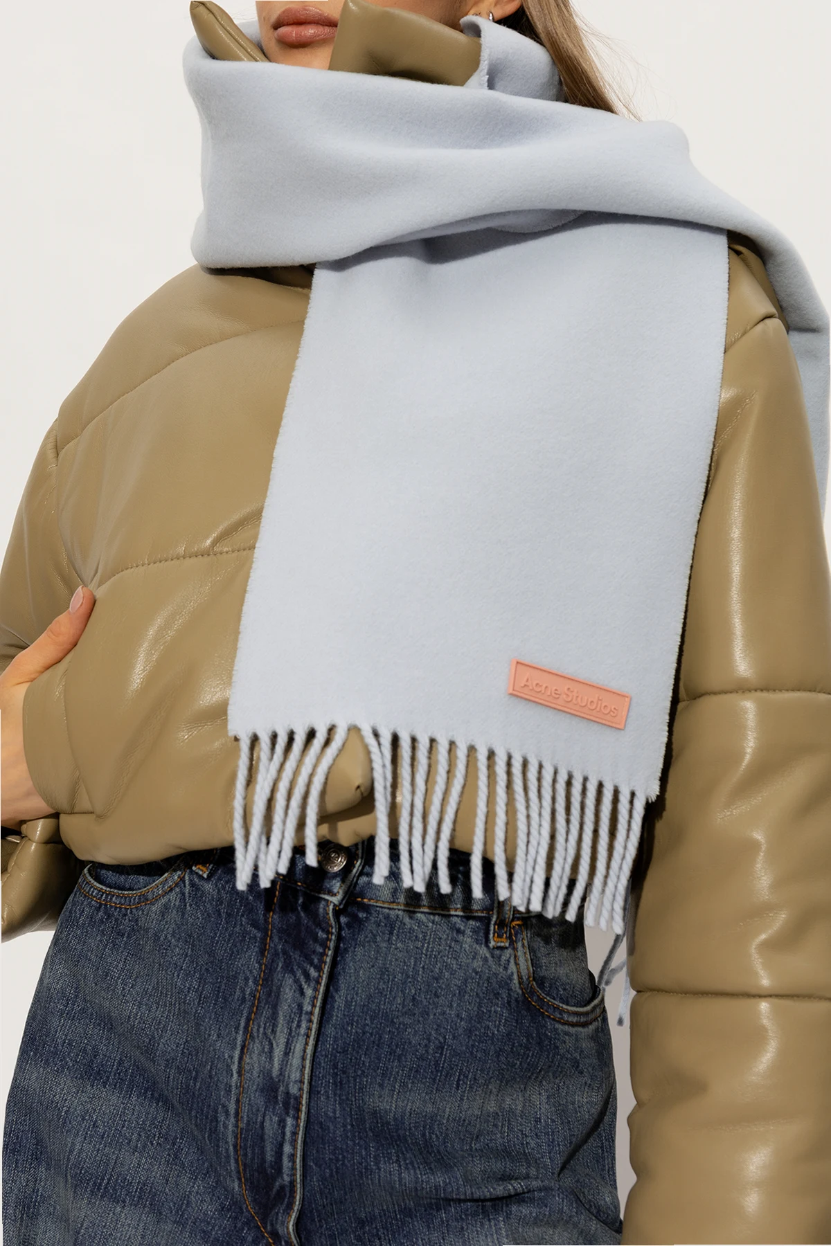 Light blue scarf from Acne Studios. Made of RWS-certified wool, this item showcases a pink logo patch and fringed edges.