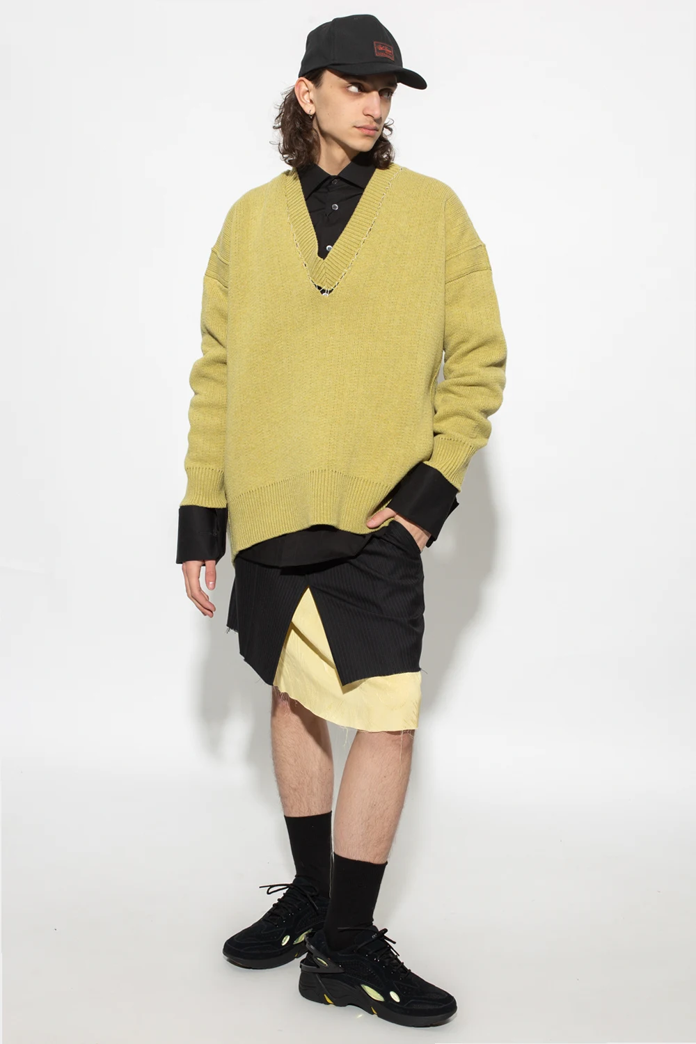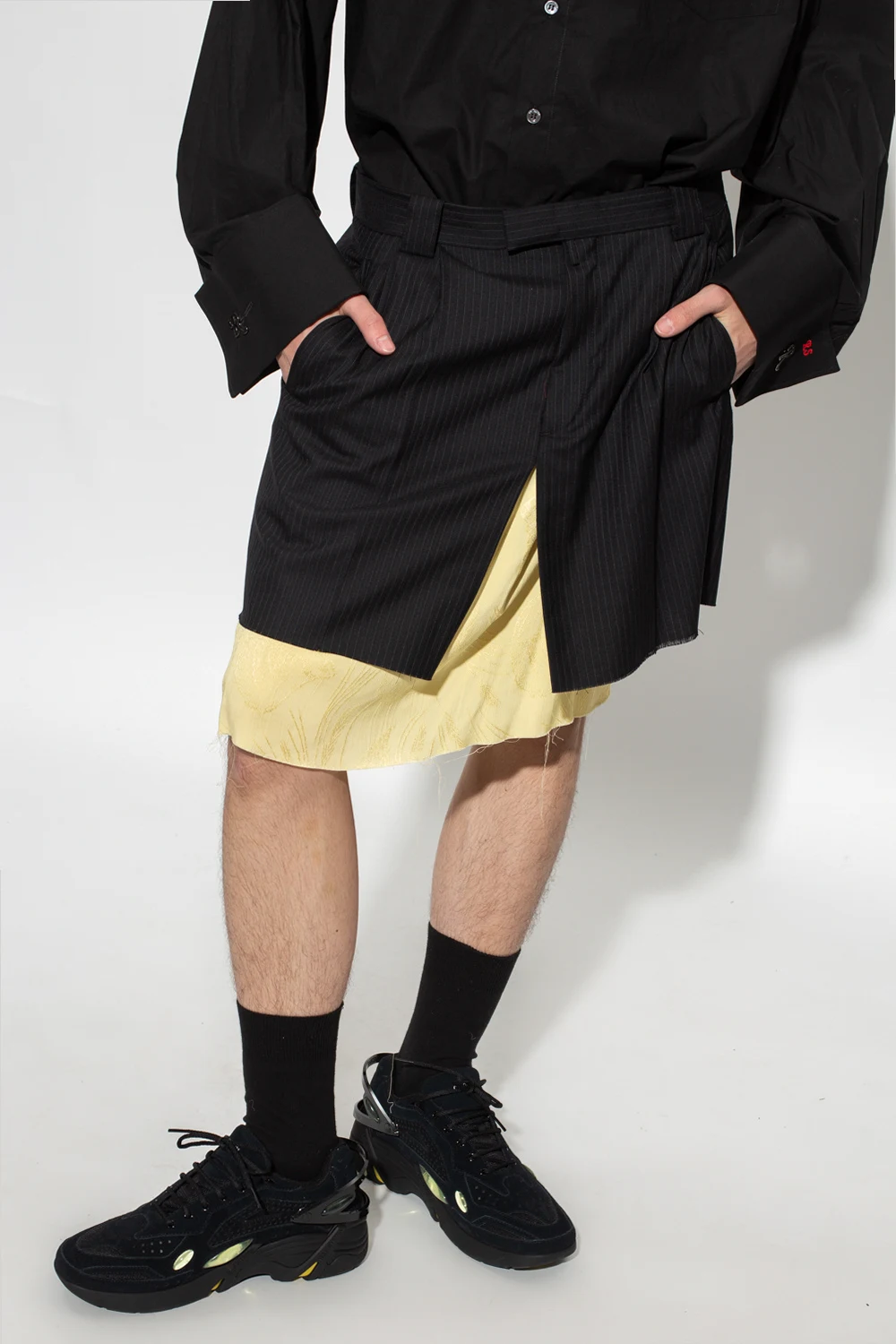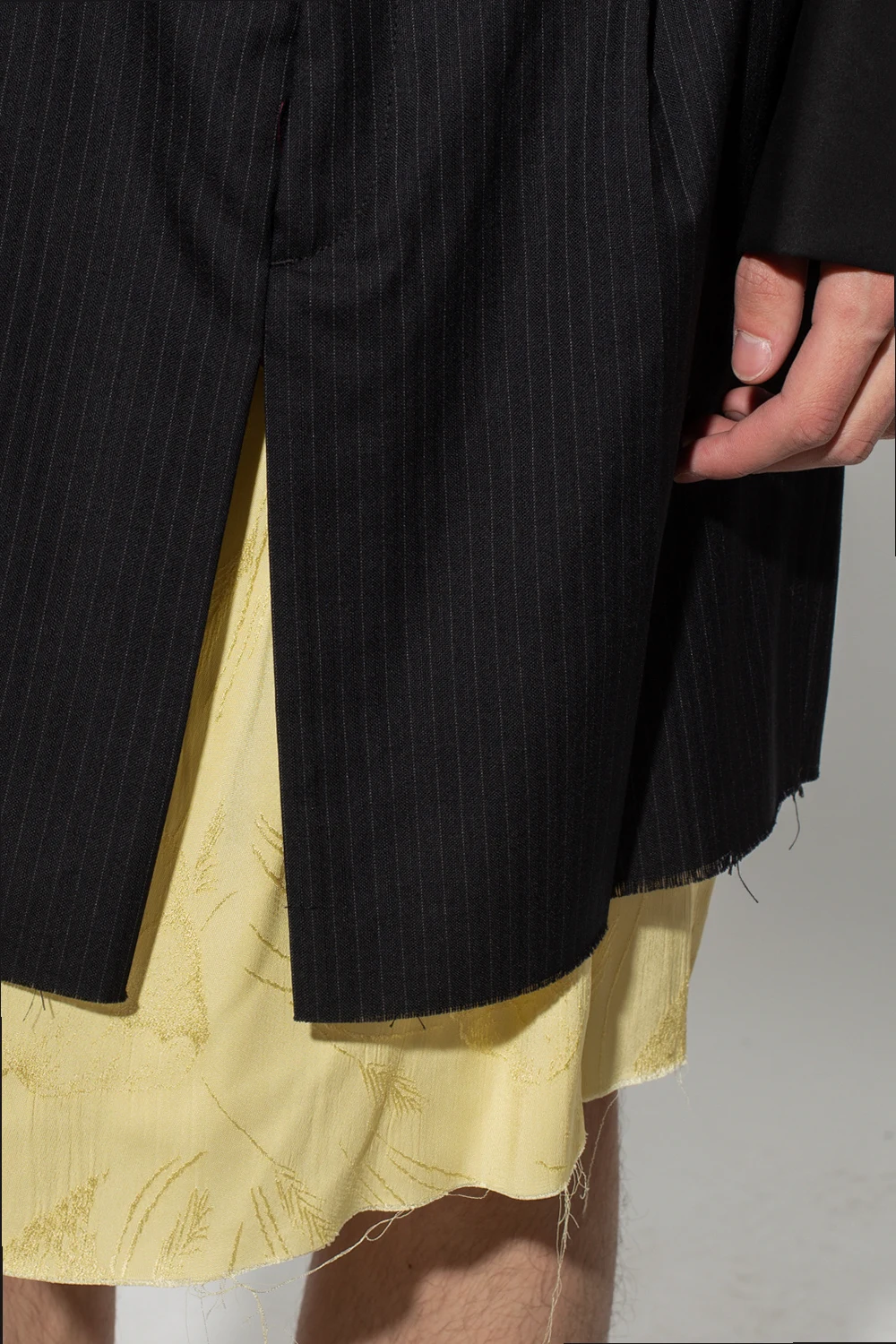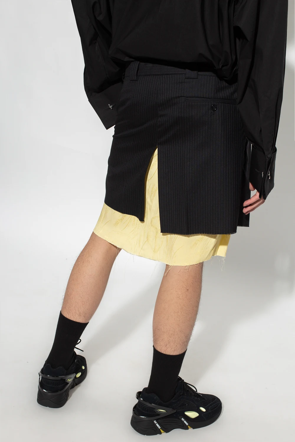 Black and yellow skirt from Raf Simons. Made of wool, this style features a stripe pattern, a zip fly with a hook & eye closure, two slip pockets, one button pocket and a bottom slit accompanied by a yellow insert.
