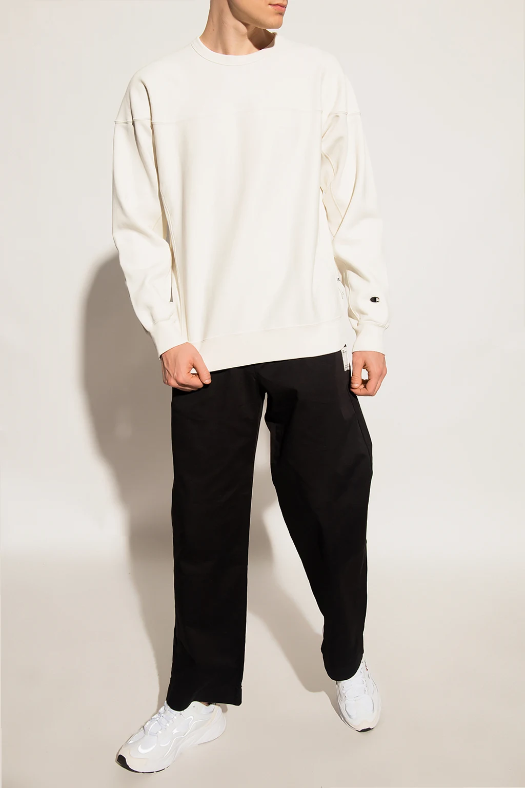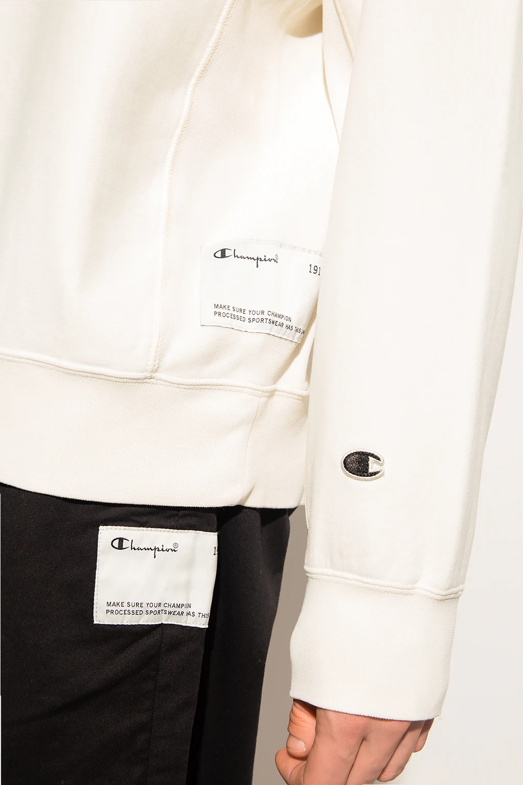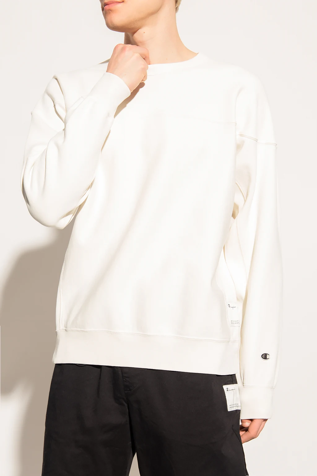 White crewneck sweatshirt from Champion. Crafted from cotton jersey, this style features a logo patch on the side and sleeve and elasticated trims on the edges.