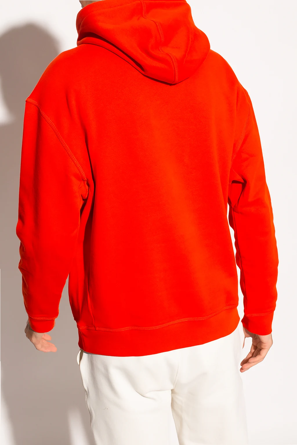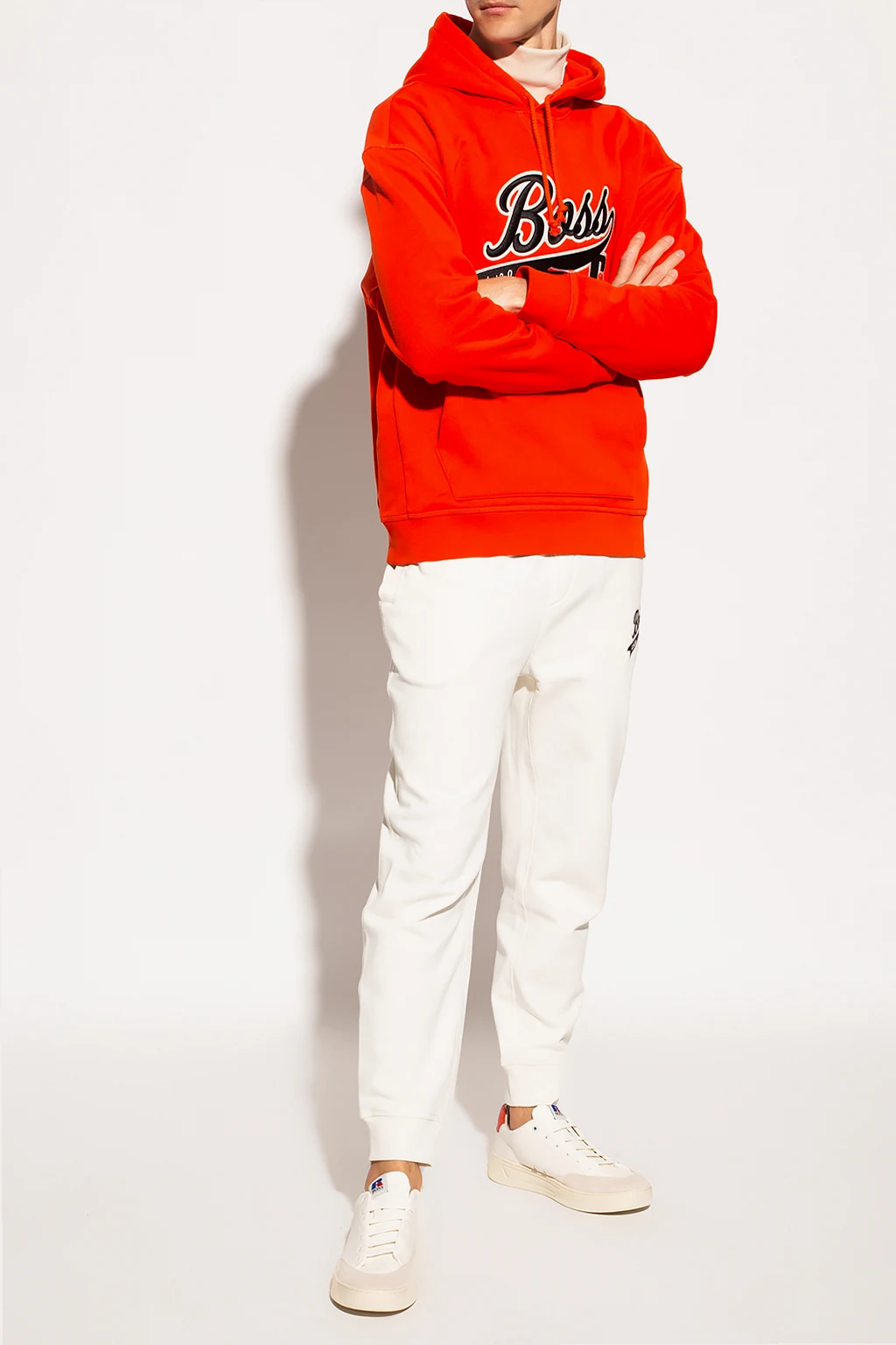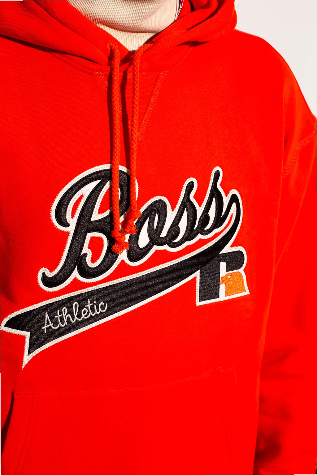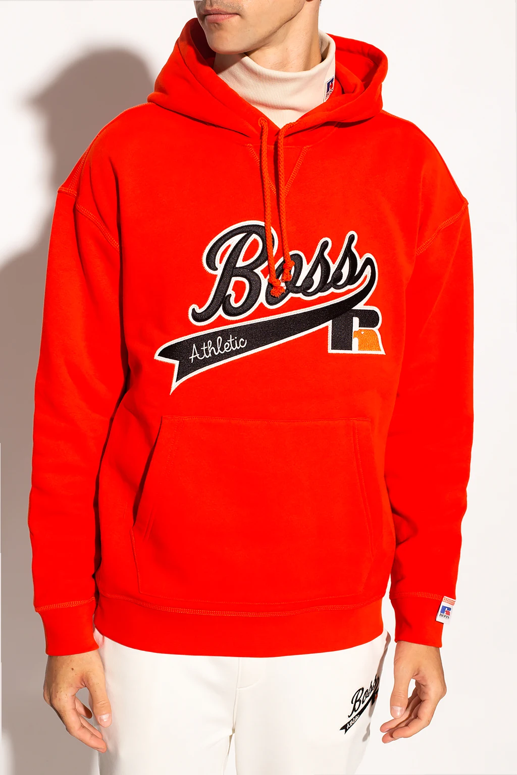 Orange sweatshirt with a drawcord-adjustable hood from BOSS x Russell Athletic. Crafted from cotton, this hoodie showcases a kangaroo pocket, elasticized edges and a logo patch for brand recognition.