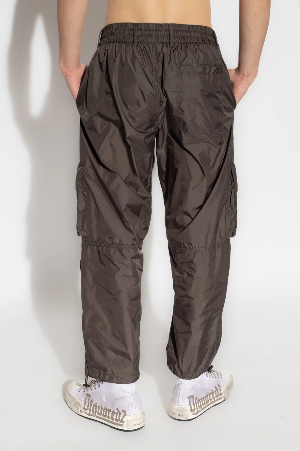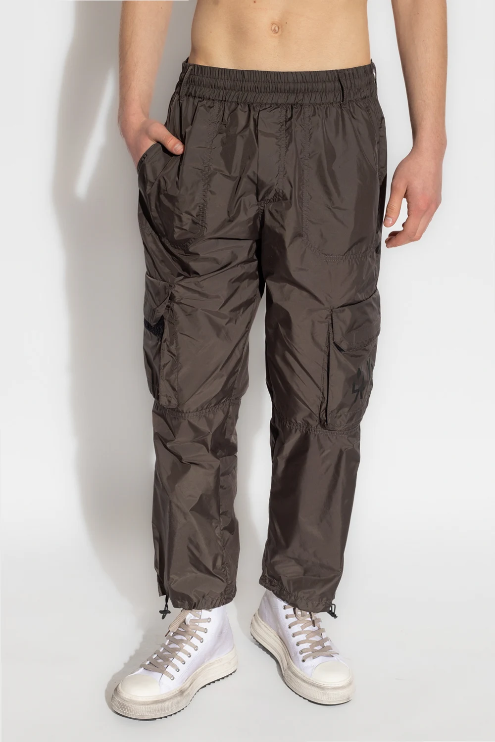 Dark grey cargo track pants from 44 Label Group. Accentuated with a branded black velcro patch, this pair features a drawstring waistband and cuffs, three slip pockets and two flapped pockets.