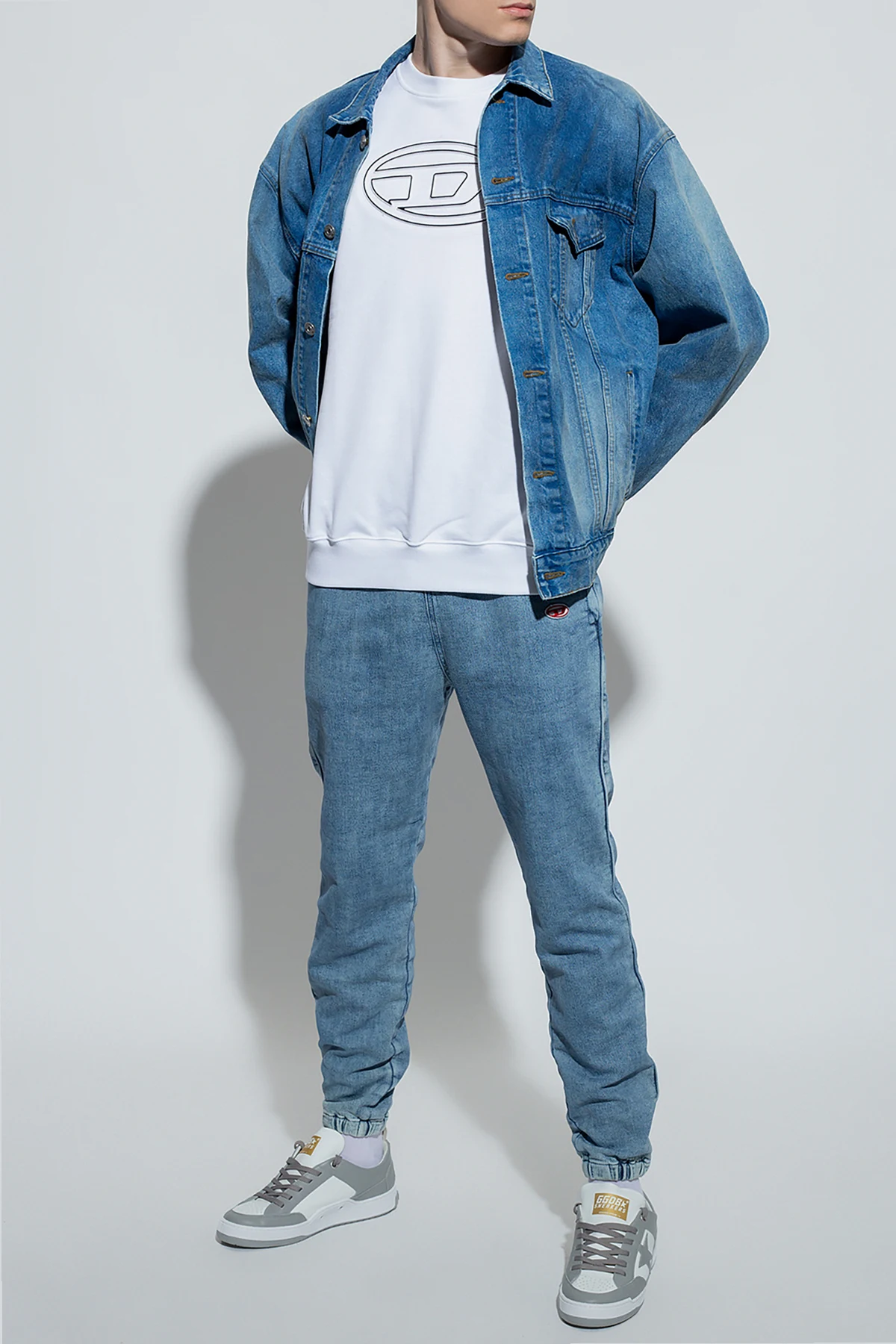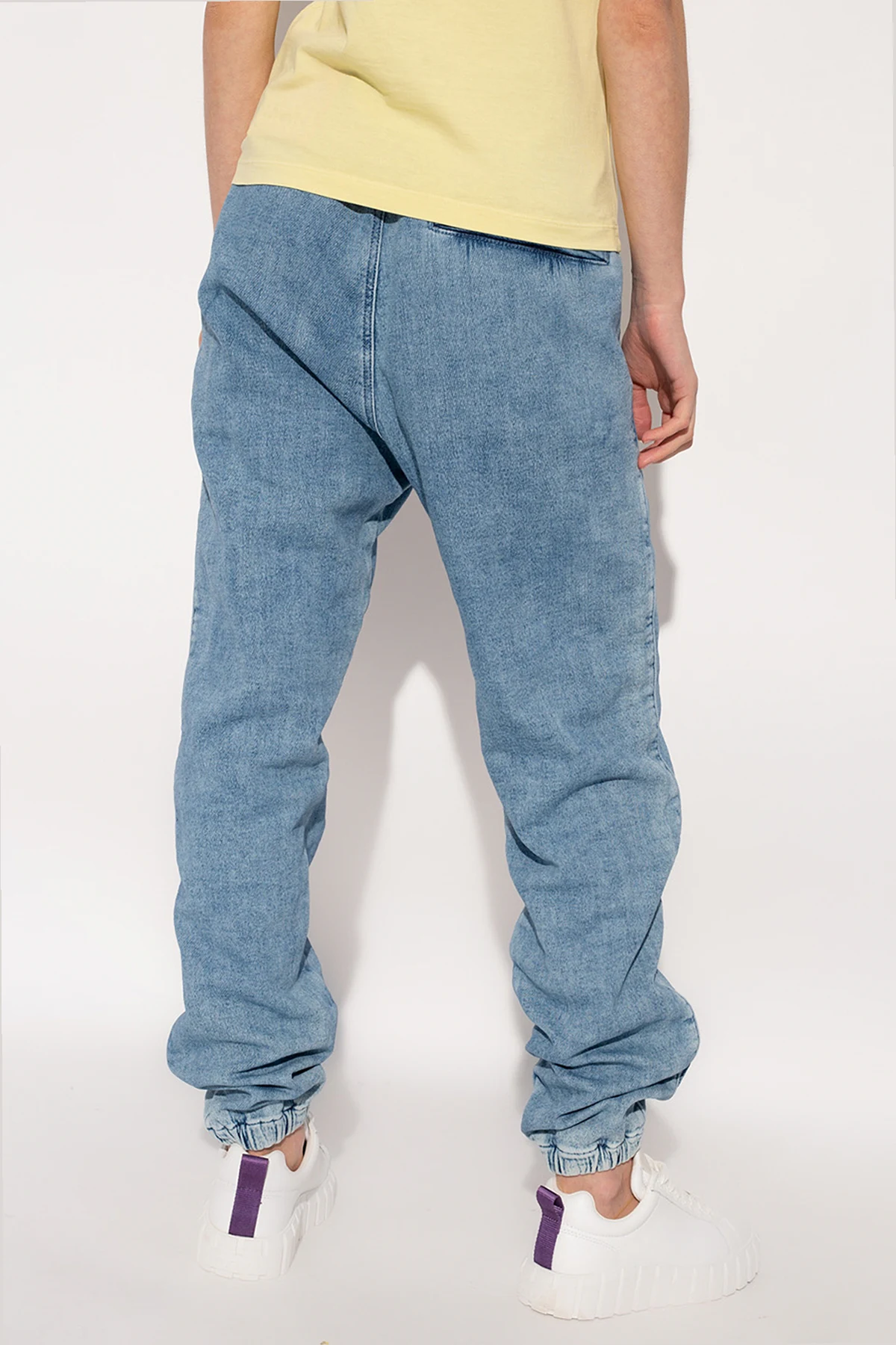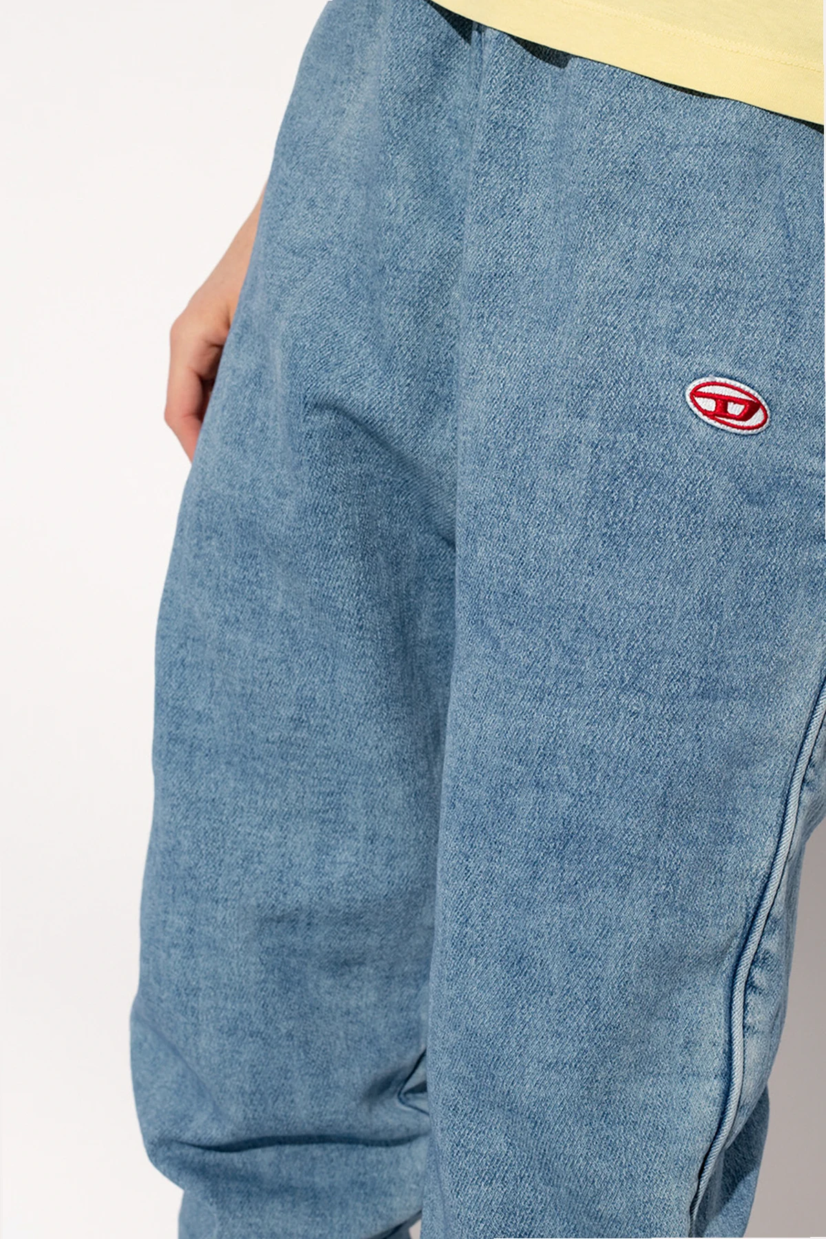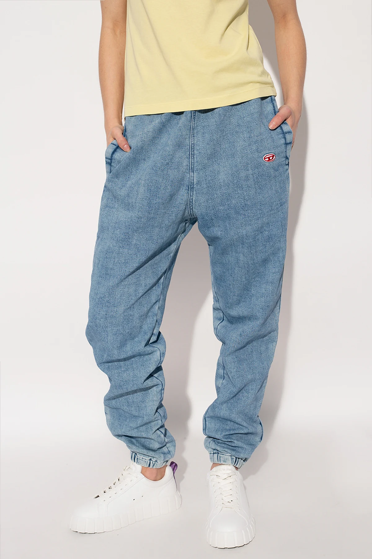 Light blue ‘De-Lab’ joggers from Diesel. Made of cotton from sustainable farms, this pair features an elasticated waistband with a drawstring fastening, three slip pockets, a red logo patch on the front and ribbed cuffs.