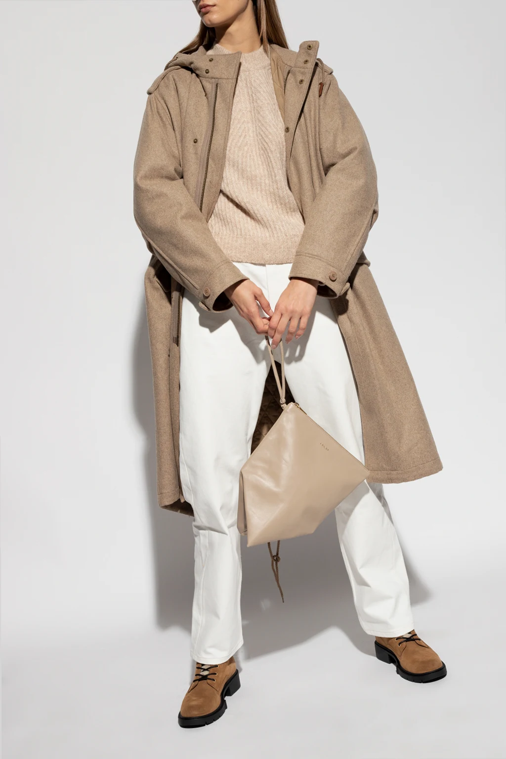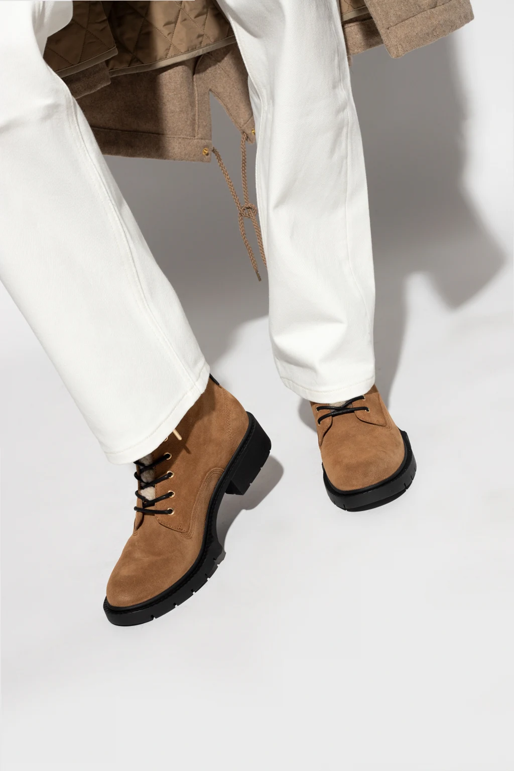 Brown ‘Lorimer’ ankle boots from Coach. Crafted from suede, this lace-up model sits on a black rubber sole and showcases cream shearling trim, gold-tone logo hardware and a black leather logo patch.