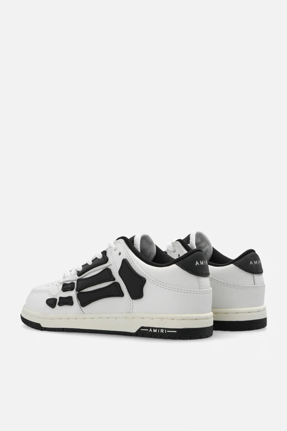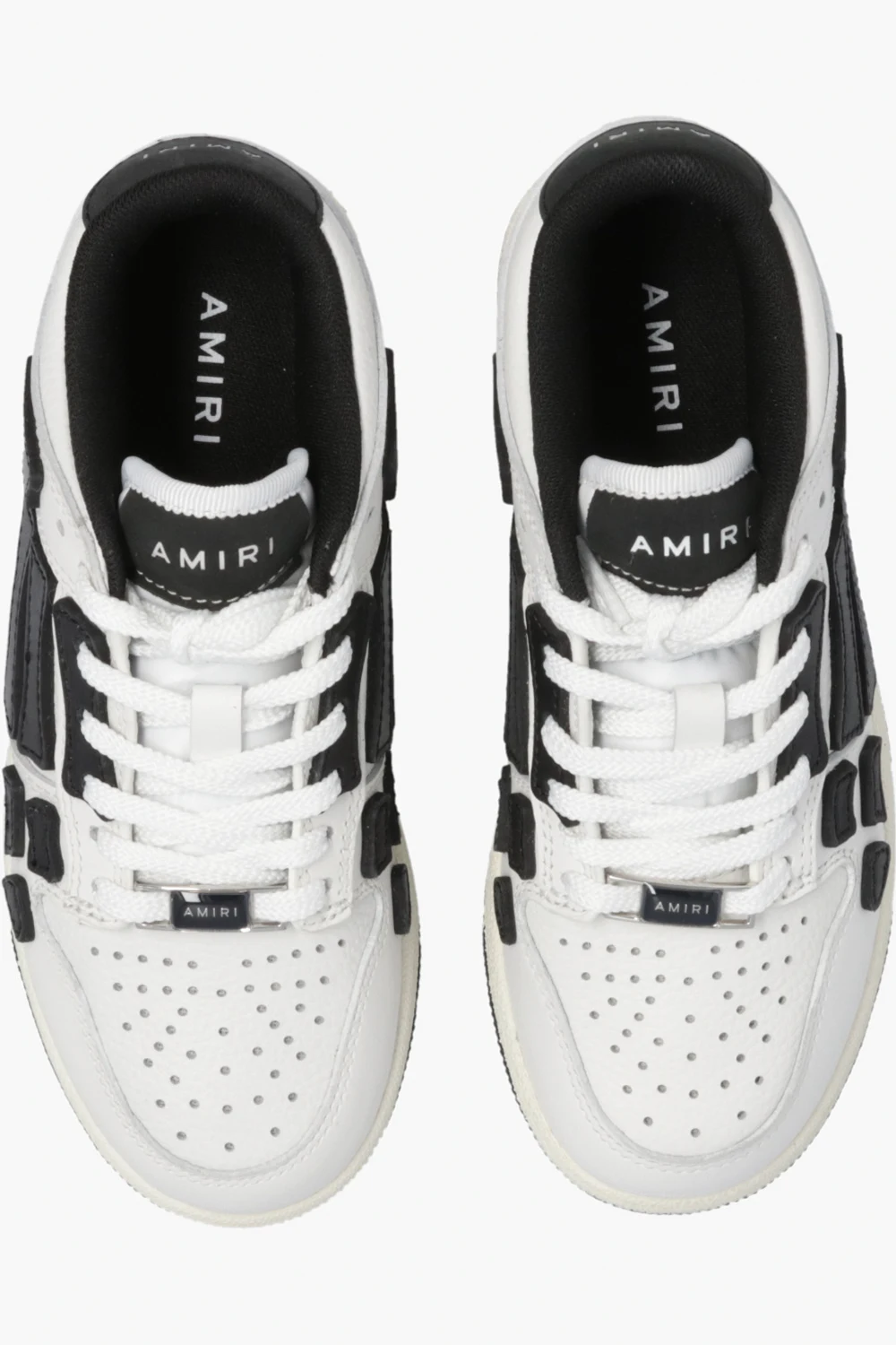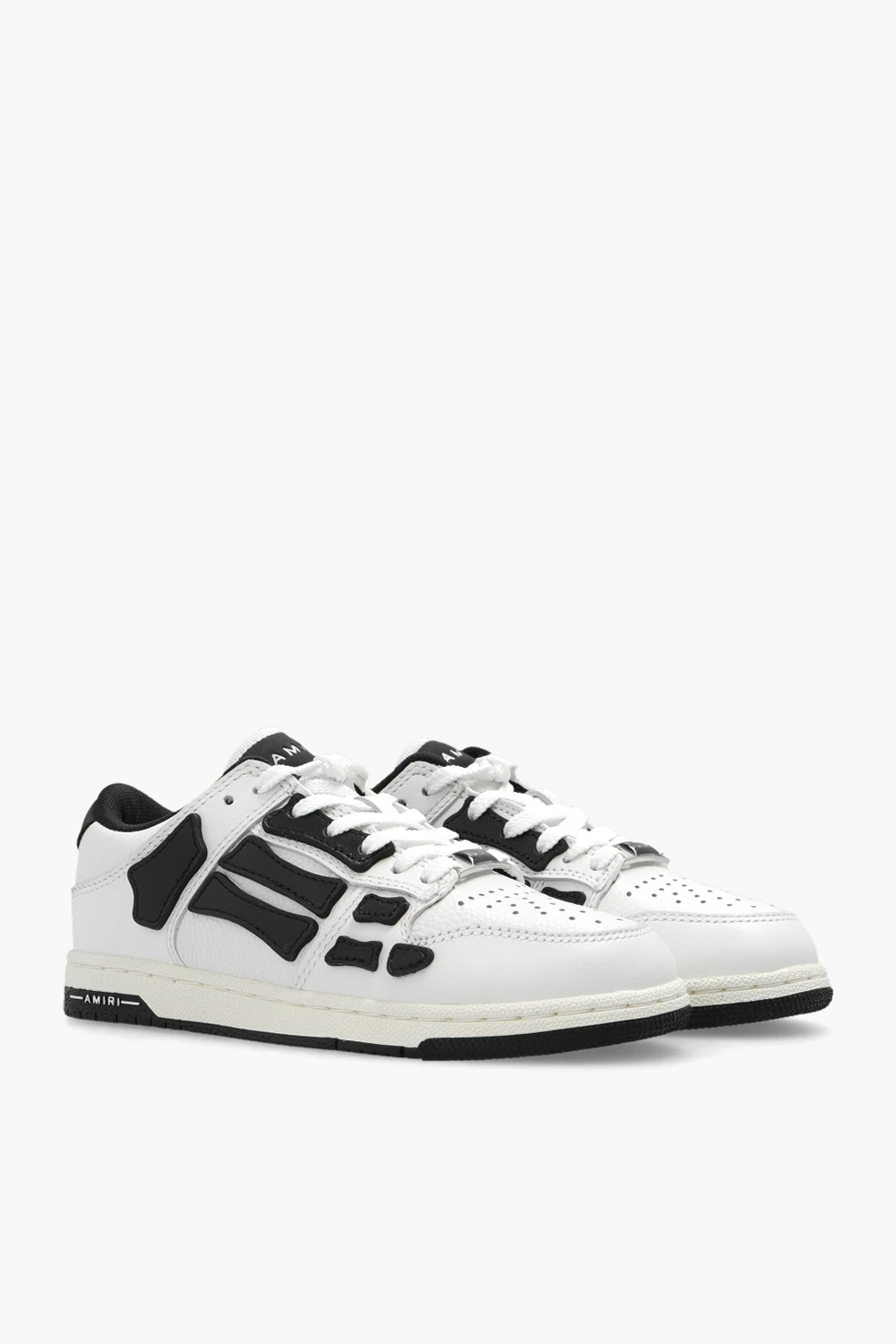 White and black ‘Skel’ sneakers from Amiri Kids. Crafted from leather, this lace-up model sits on a blue and white rubber sole and features patches and an embossed logo.