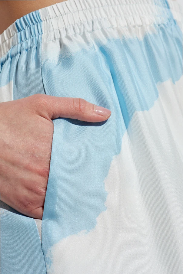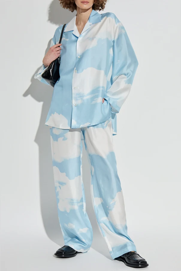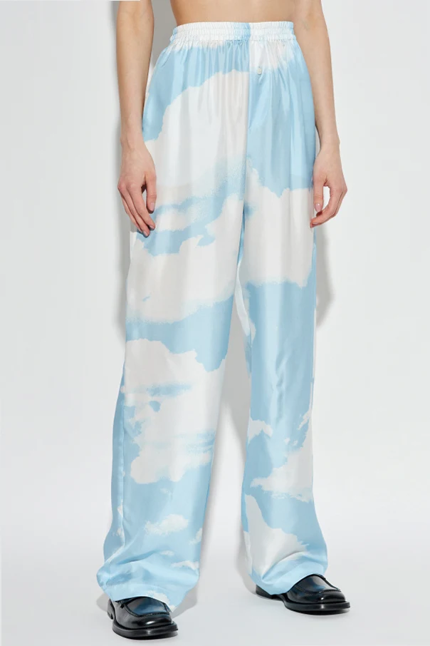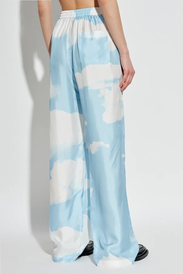 Die Seidenhose von Moschino besticht durch eine raffinierte Ästhetik und erinnert an die Leichtigkeit eines sommerlichen Himmels. Die glatte, zarte Materialoberfläche strahlt einen dezenten Glanz aus und hebt das tiefe Blau hervor, das mit einem Motiv aus weißen Wolken verziert ist. Der lässige, weite Wide-Leg-Schnitt sowie der hohe, elastische Bund unterstreichen den Tragekomfort und bieten Bewegungsfreiheit bei gleichzeitiger Eleganz.
