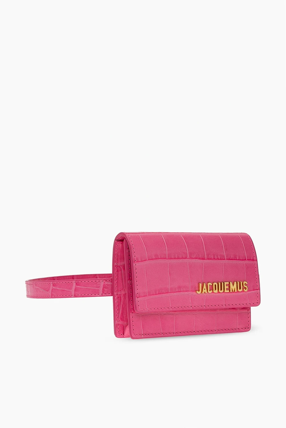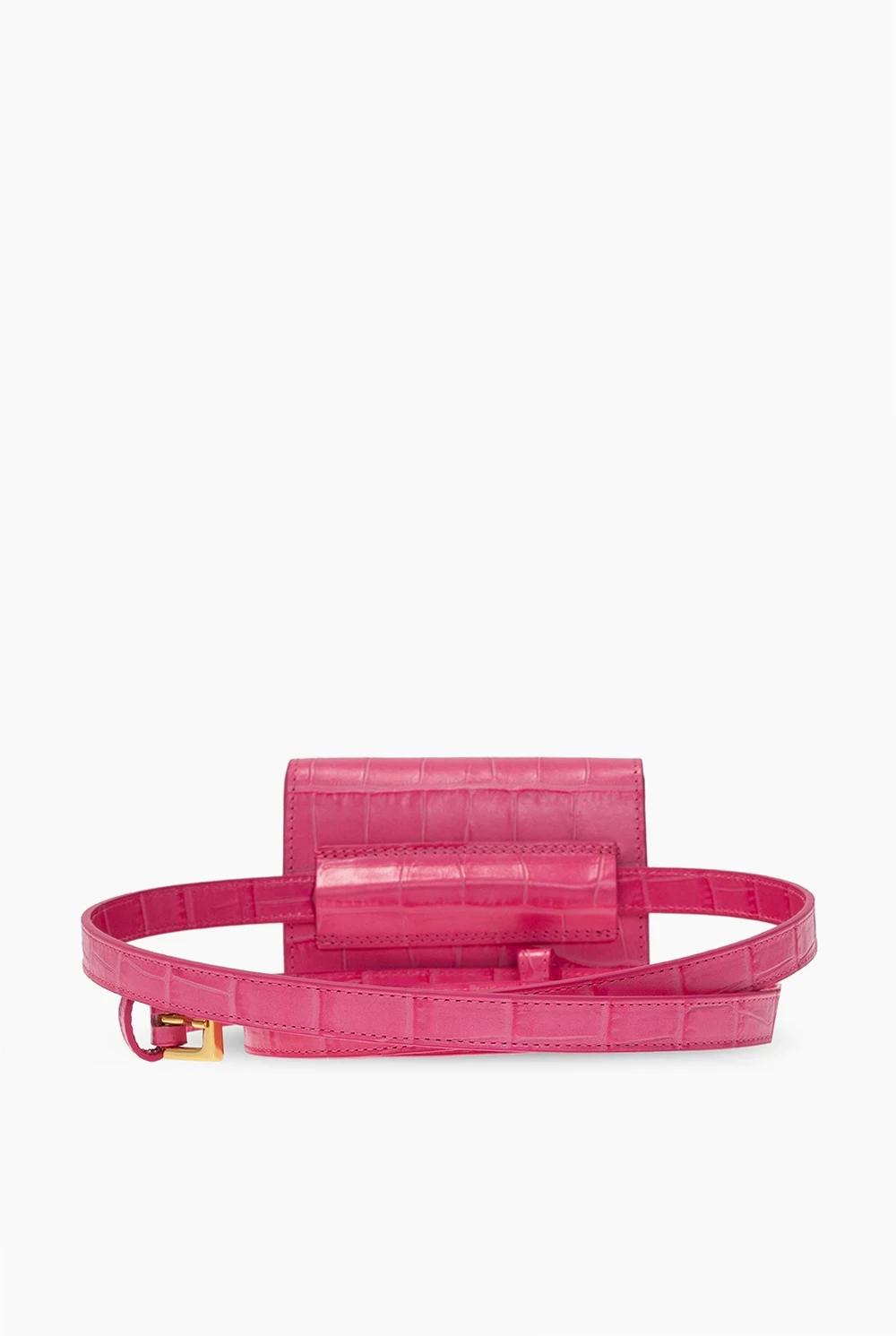 Pink ‘La Ceinture Bello’ belt bag from Jacquemus. Crafted from leather, this design fastens via a snap and features a logo appliqué, an adjustable strap, gold-tone metal hardware and one internal compartment with two slip pockets and two card slots.