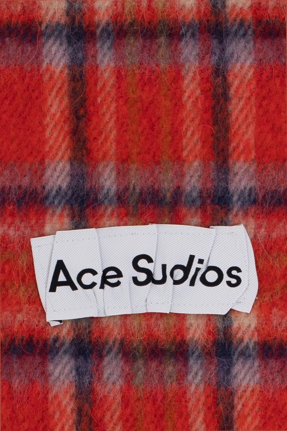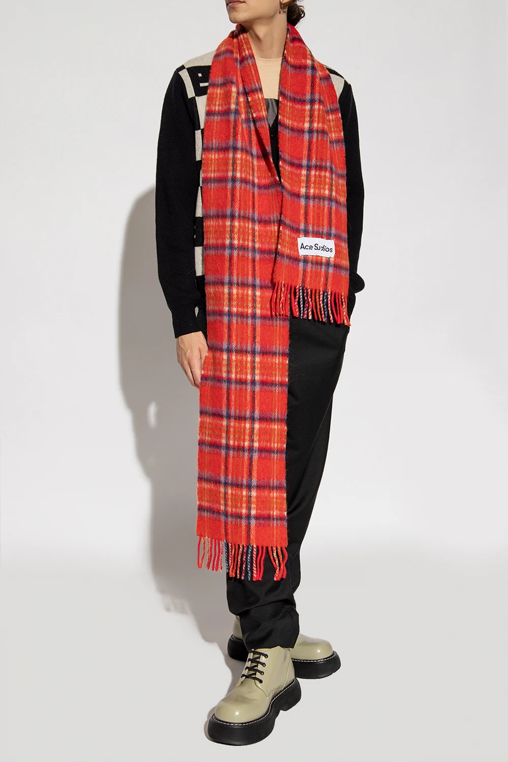Red scarf from Acne Studios. Made from a wool blend, this item showcases a colourful check pattern and fringes on shorter ends.