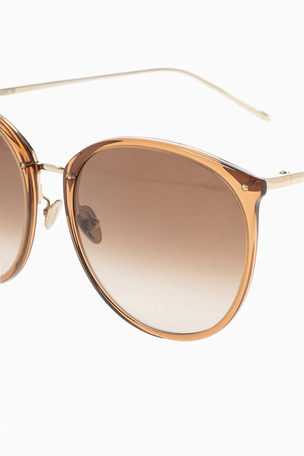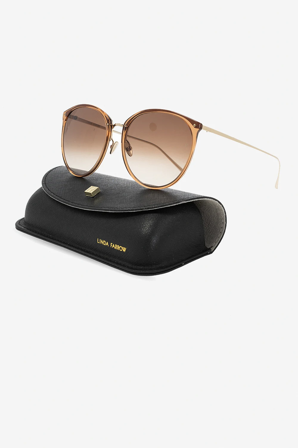 Brown, transparent ‘Kings C20’ sunglasses from Linda Farrow. Temples are made from hypoallergenic titanium plated with 18k and 22k gold. Brown ZEISS lenses provide 100% UV protection. This model comes with a case.