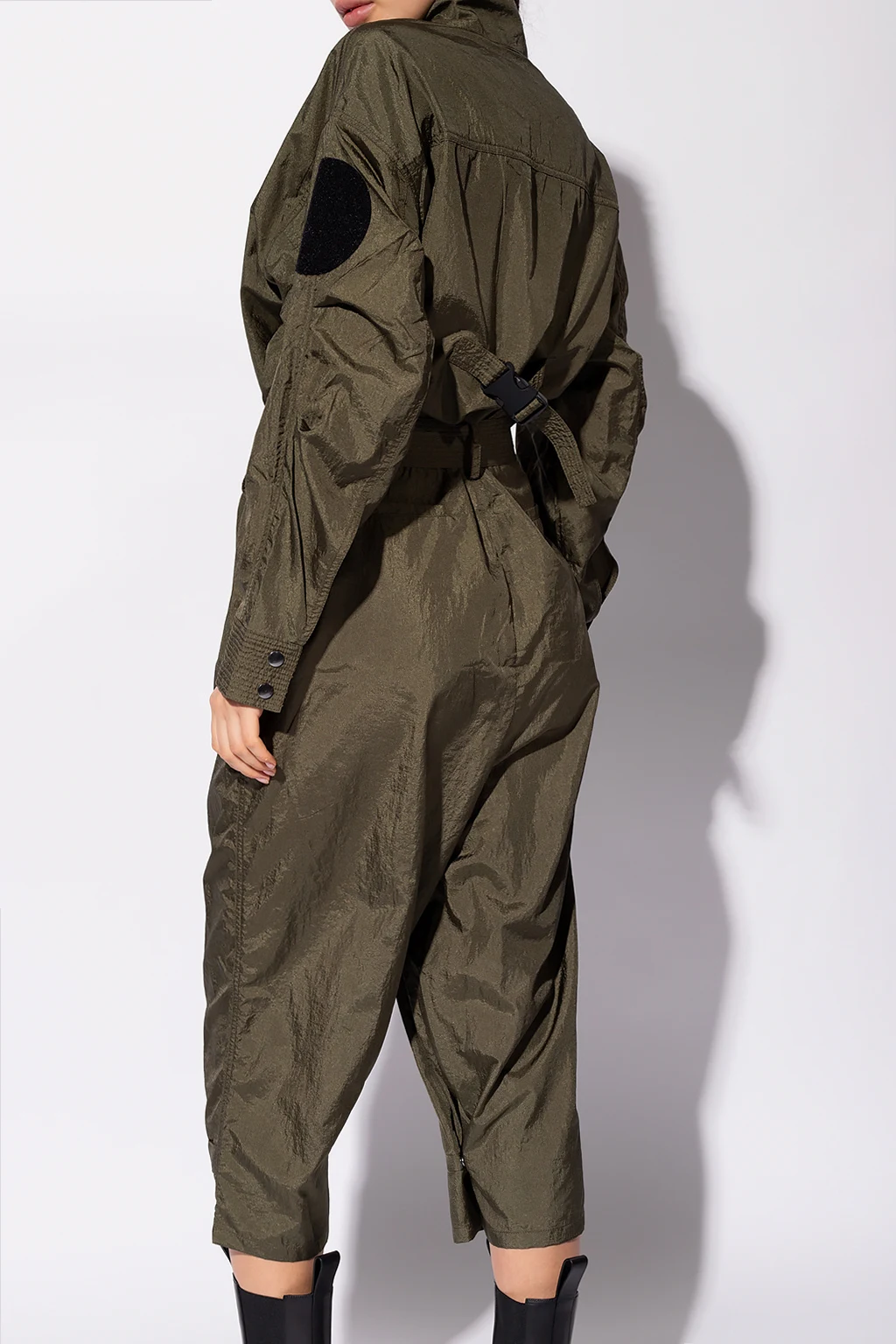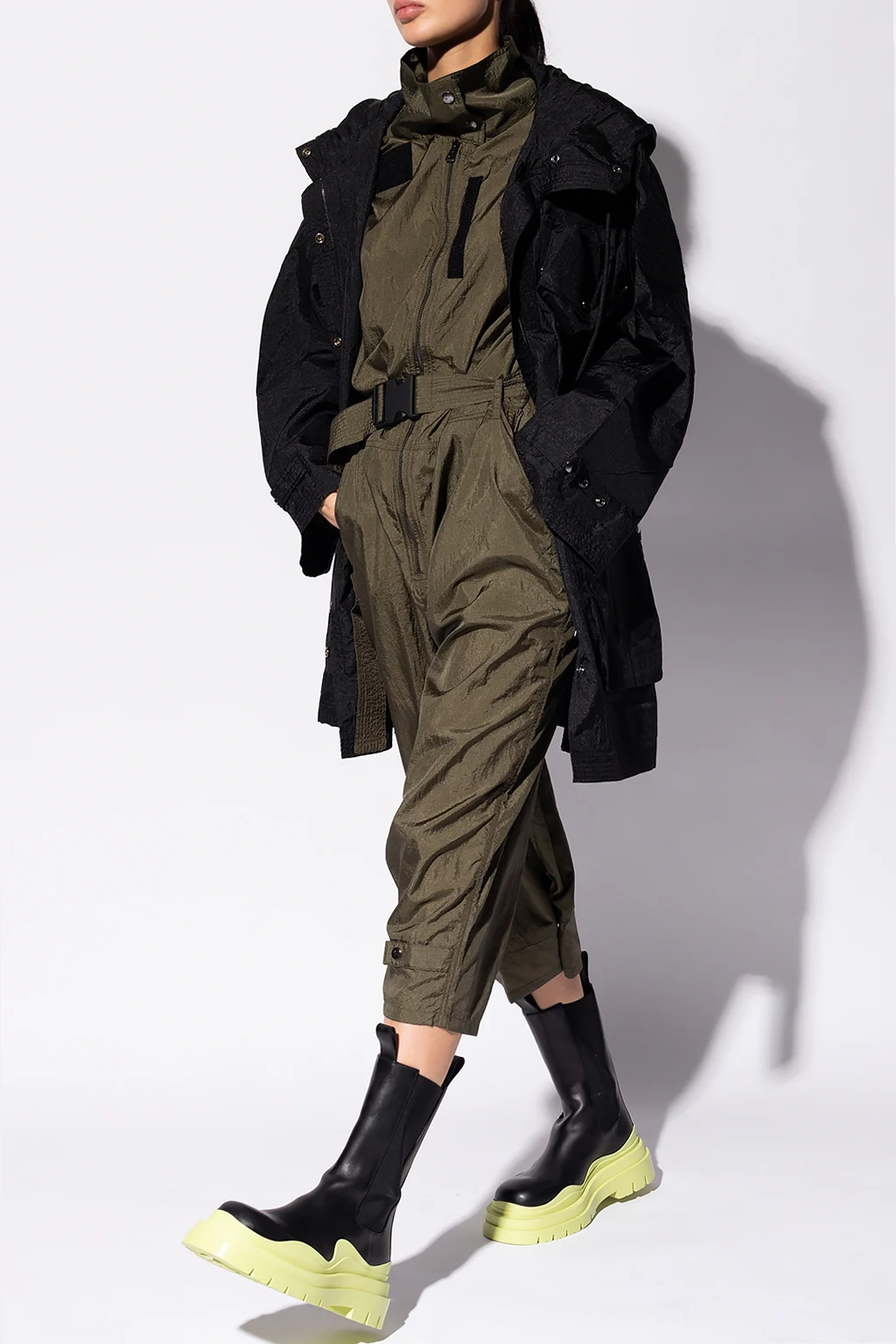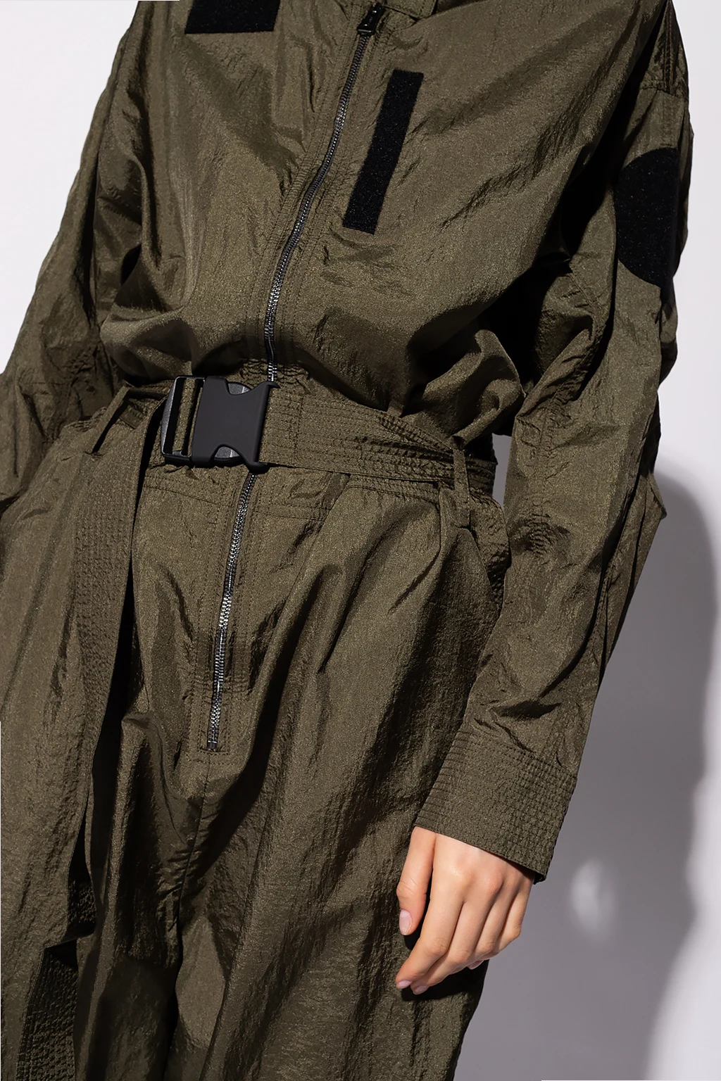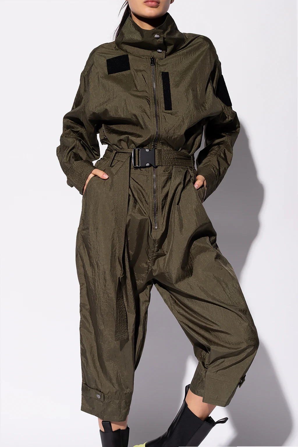 Dark green jumpsuit with standing collar from Diesel. Crafted in lightweight nylon, this style features a zip fastening, a waist-cinching belt, four slip pockets, long sleeves with snap-fastened cuffs and tapered legs with snap tabs.