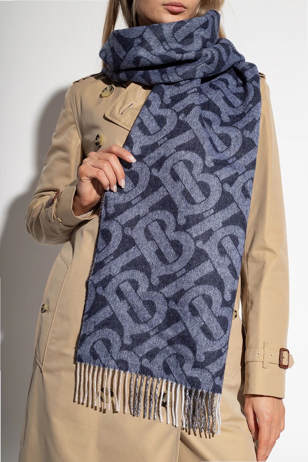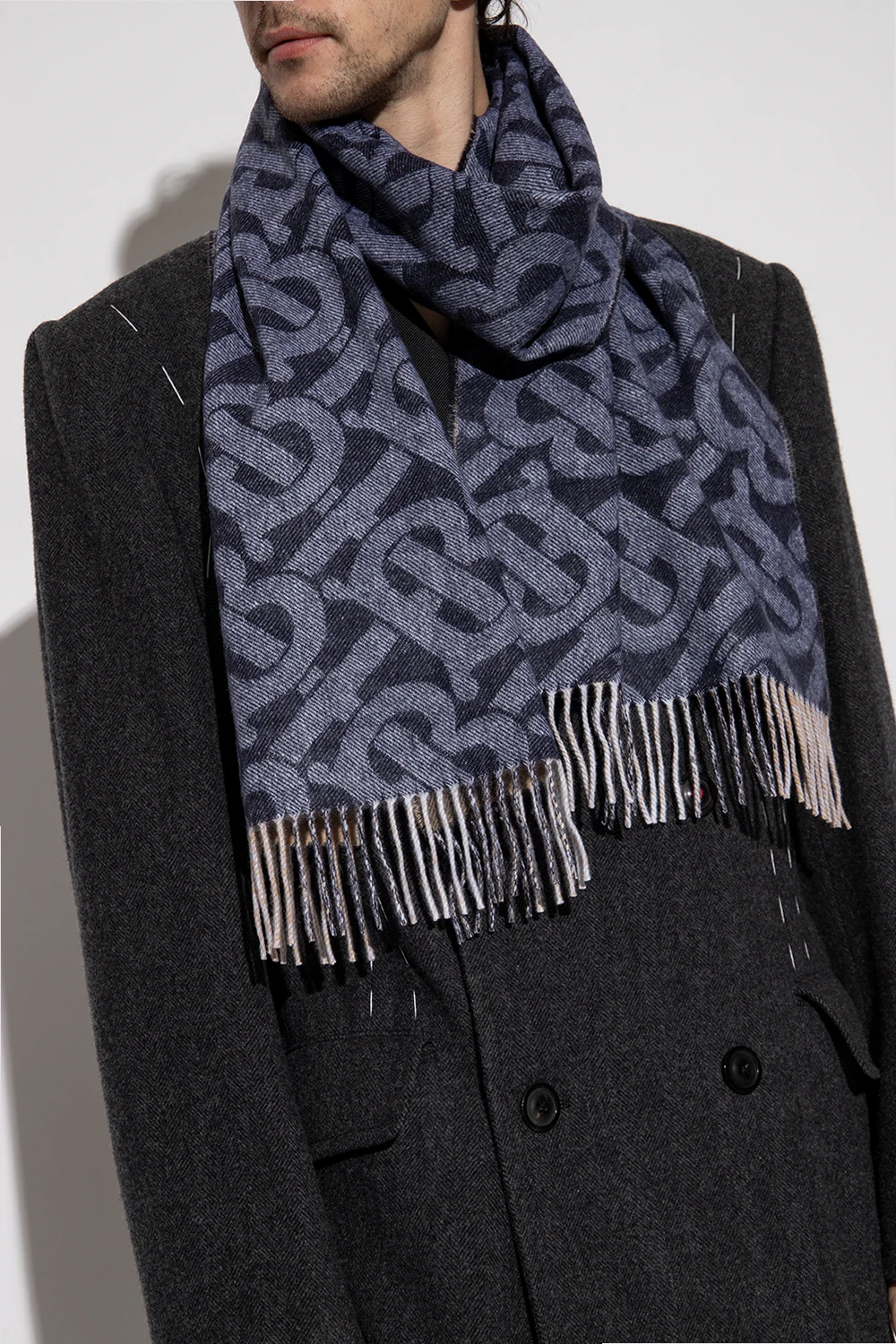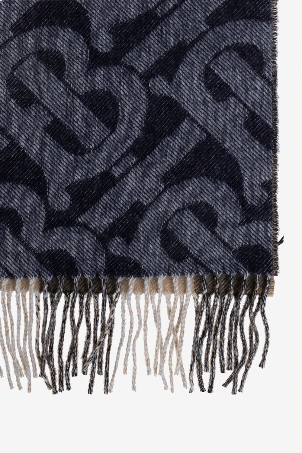 Multicoloured reversible scarf from Burberry. Made of cashmere and detailed with fringes. One side is navy blue and showcases an embroidered ‘TB’ monogram. The other side is beige and features the brand's signature check pattern in white, black and red.